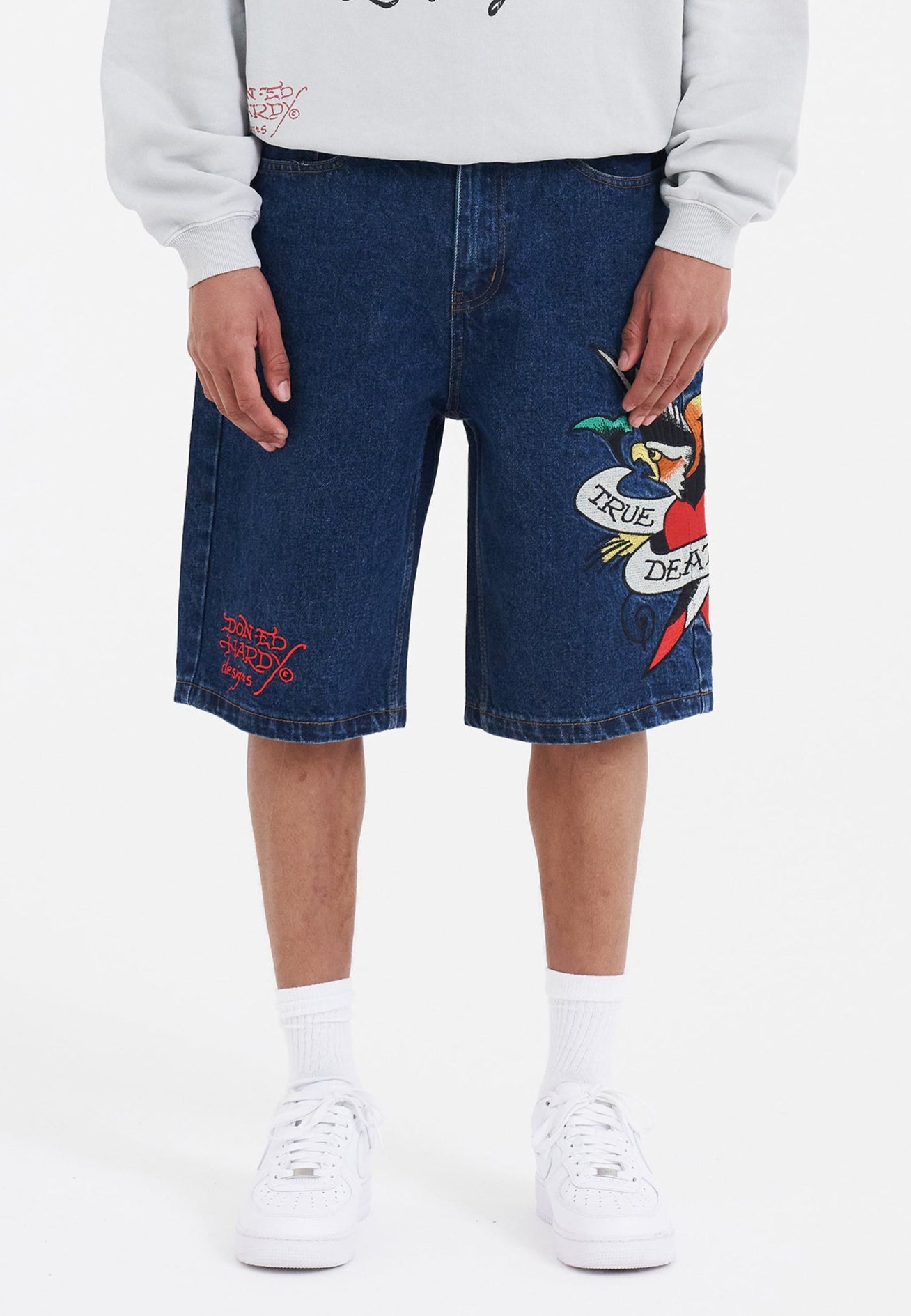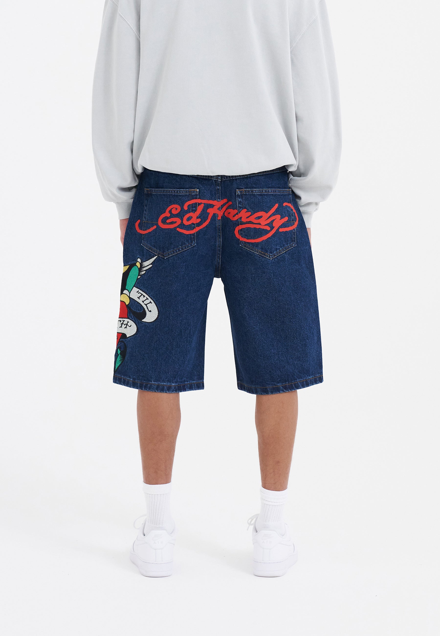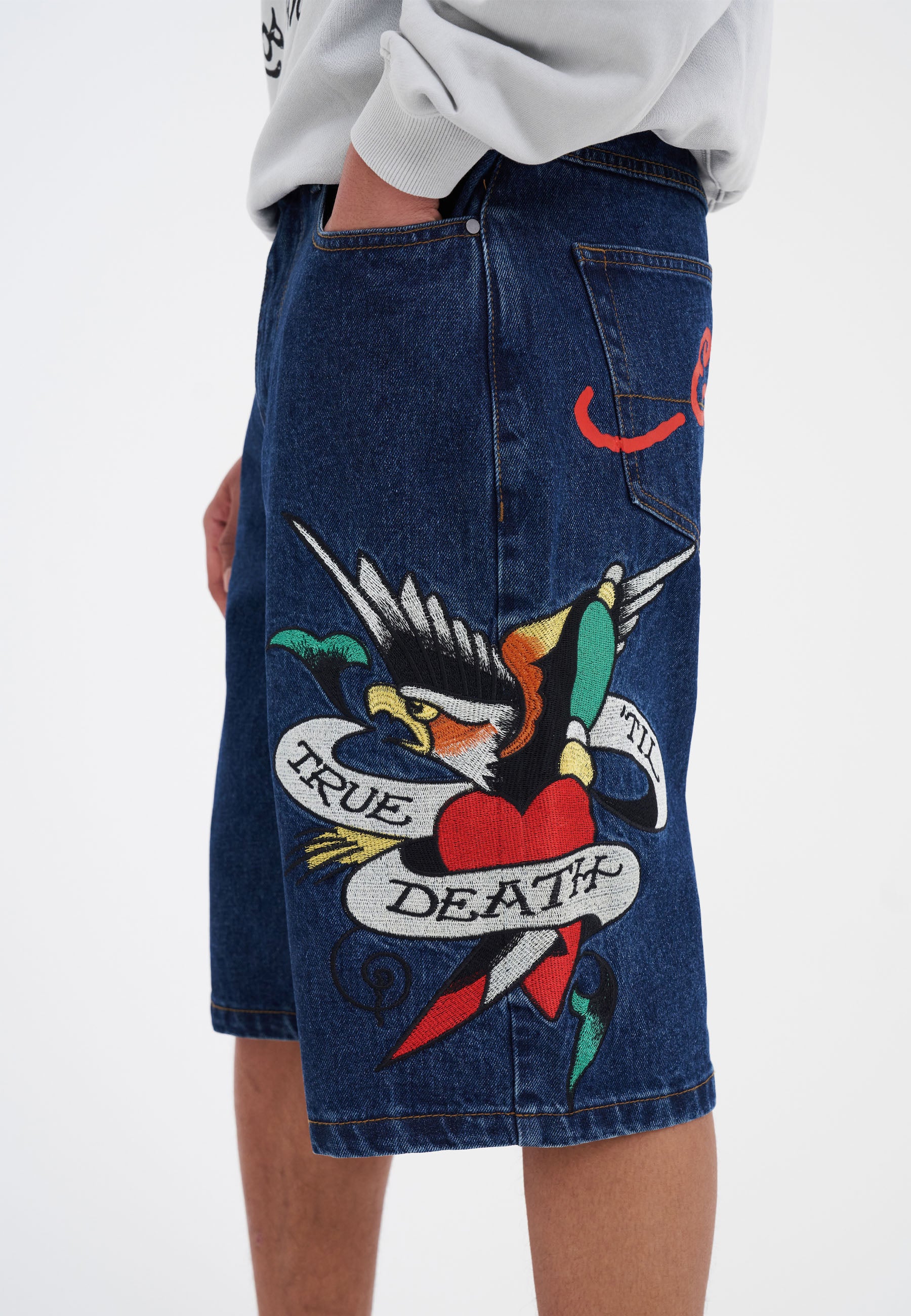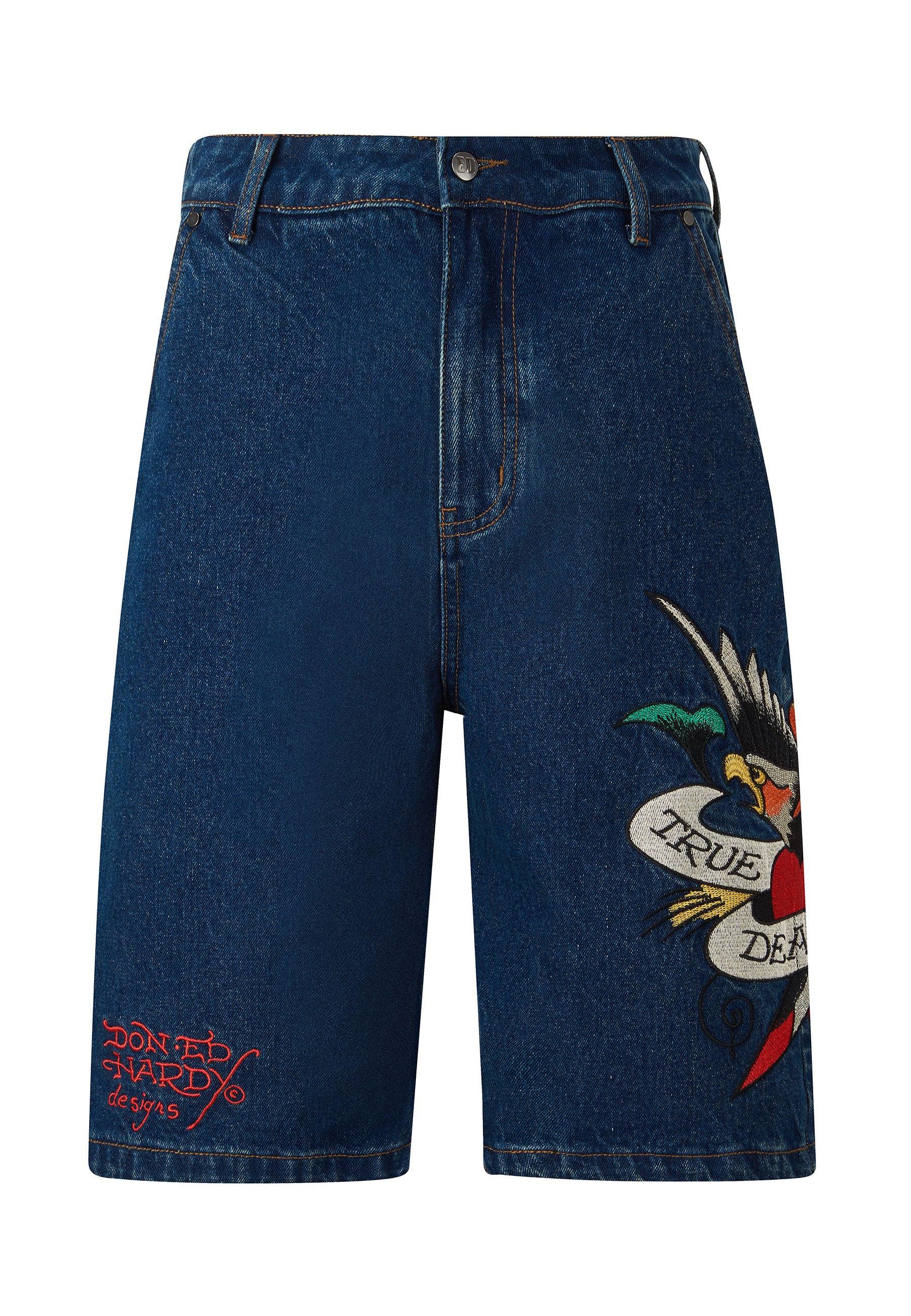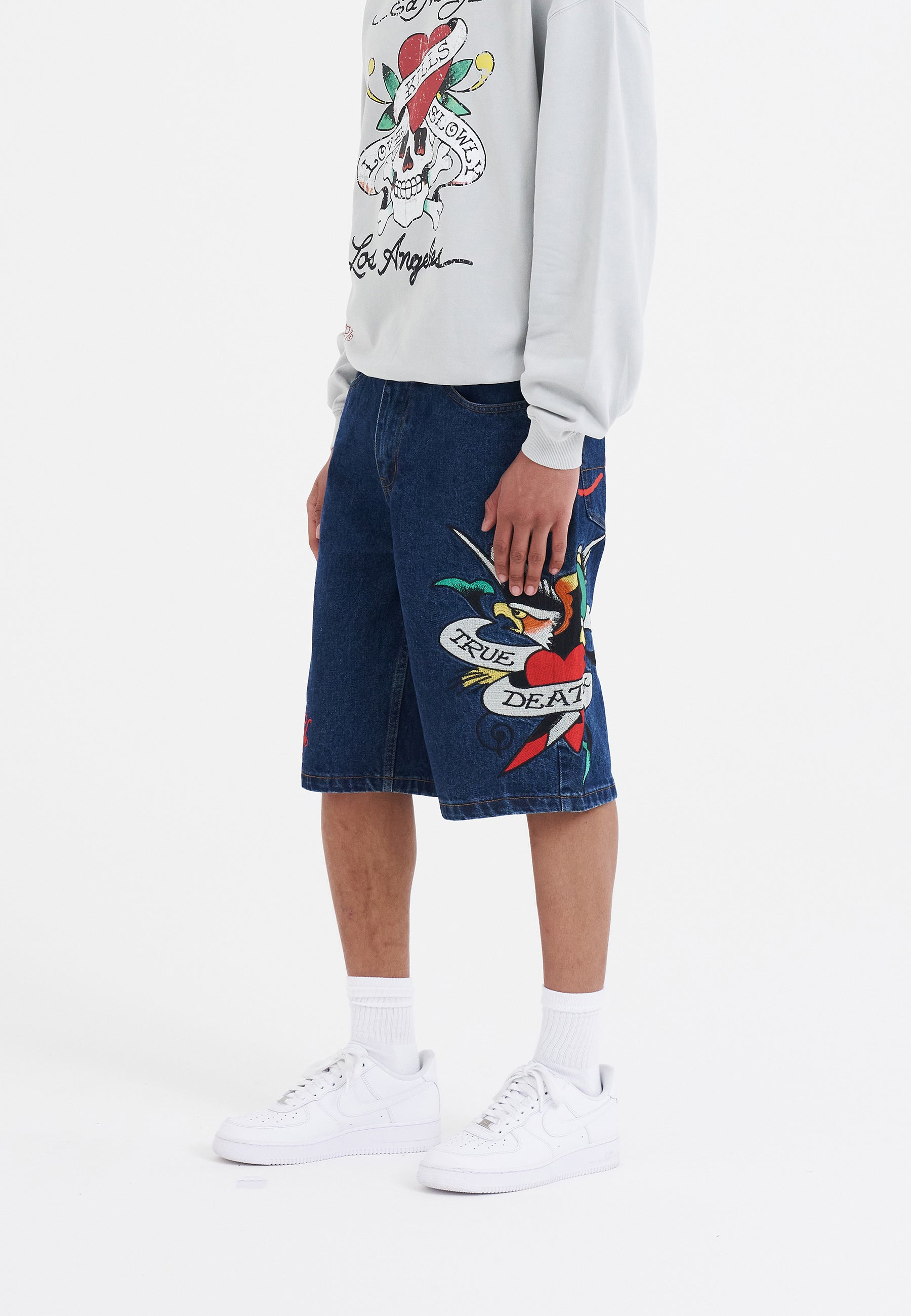 Med en karmosinrød variation af Ed Hardys klassiske logo hen over den øverste del af ryggen og en levende "TRUE TIL DEATH" tatoveringsgrafik med ørnehjerte broderet på venstre ben, er disse indigo-shorts et absolut Ed Hardy-must -har.