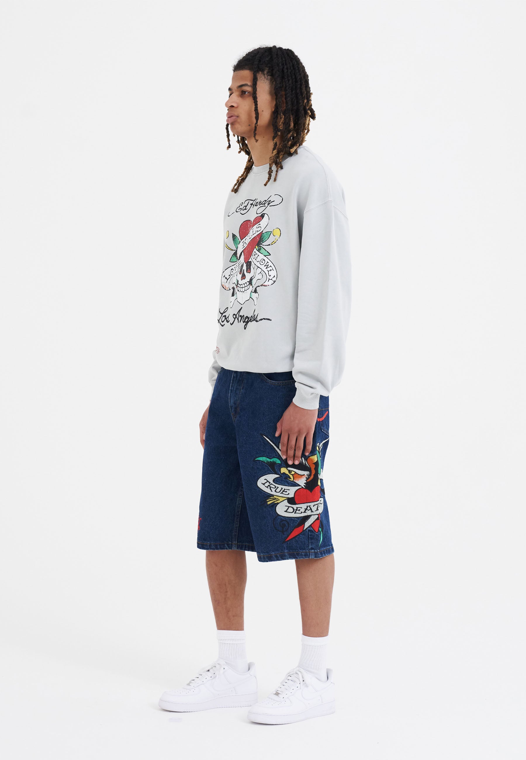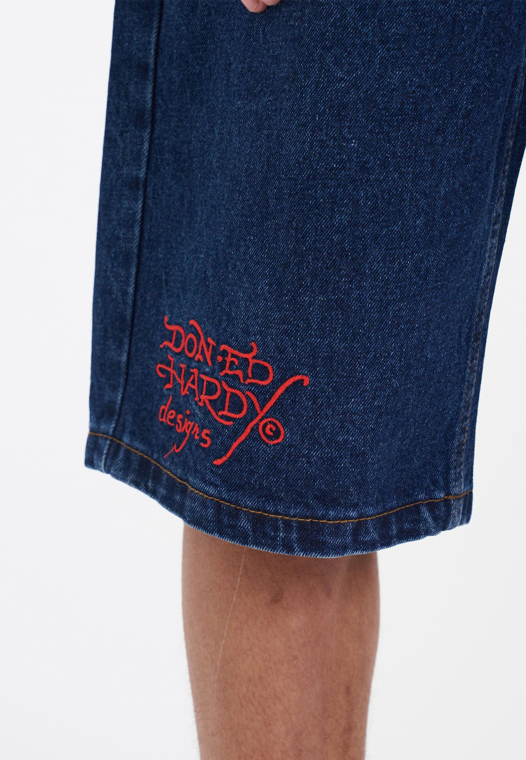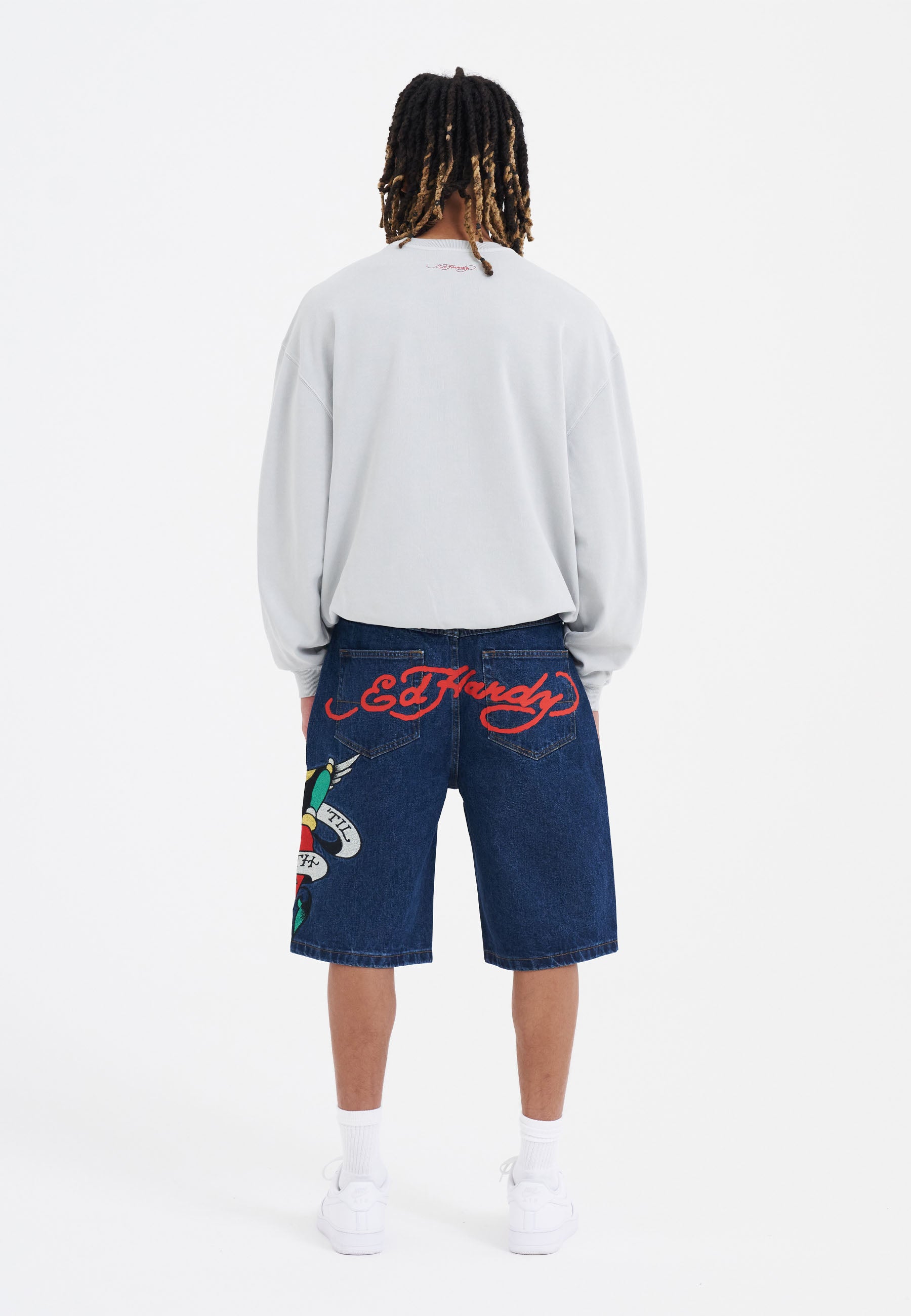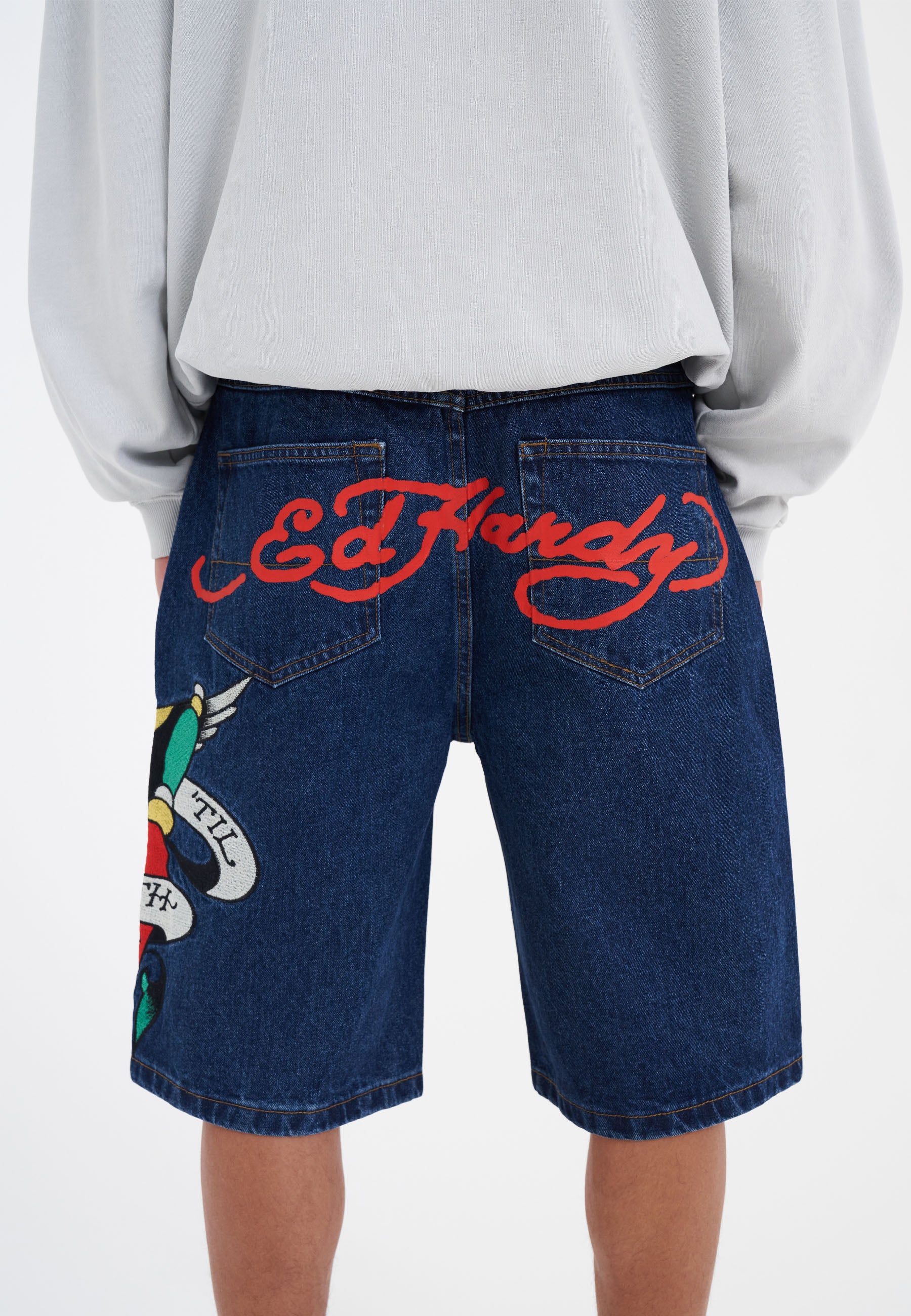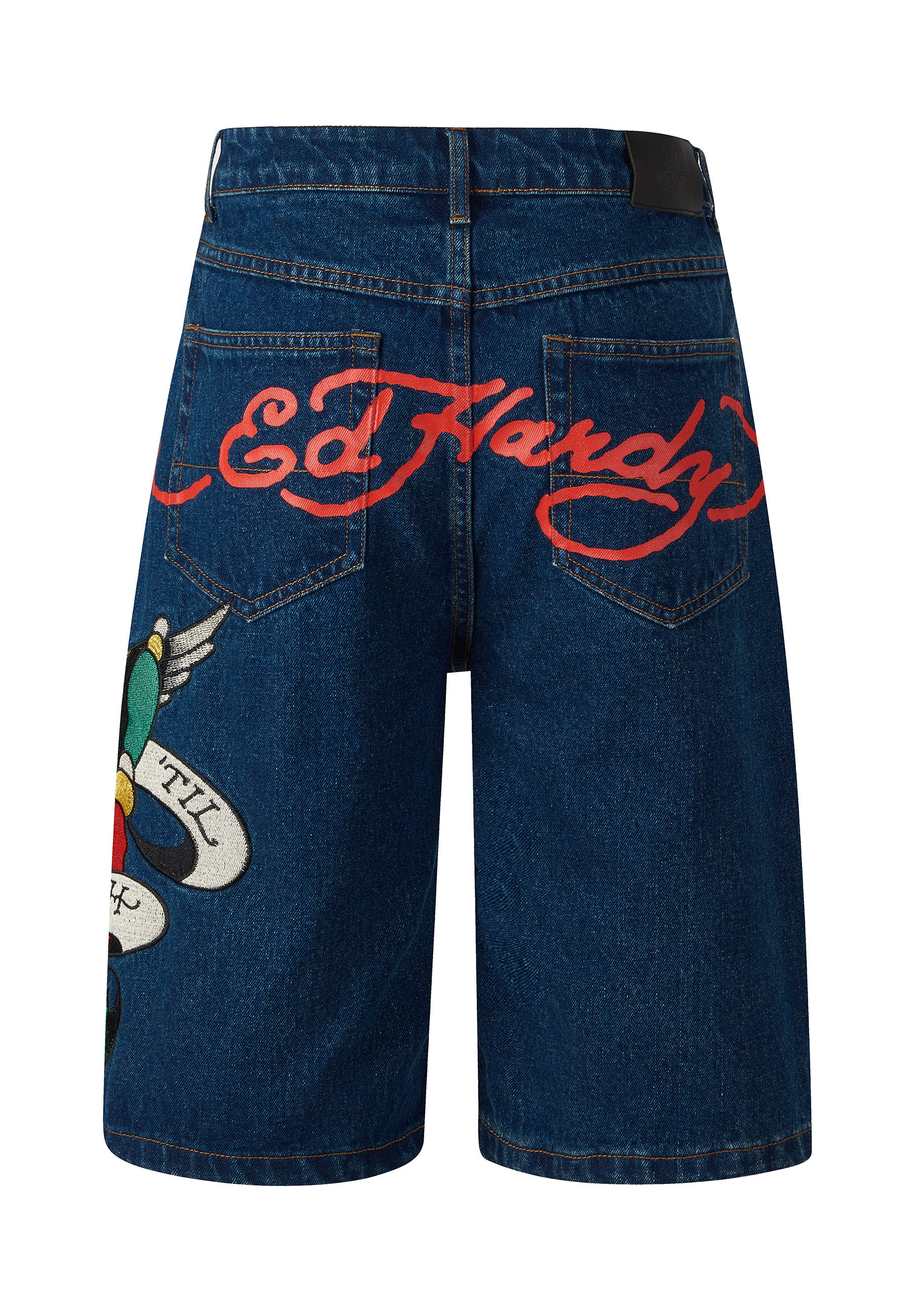 Med en karmosinrød variation af Ed Hardys klassiske logo hen over den øverste del af ryggen og en levende "TRUE TIL DEATH" tatoveringsgrafik med ørnehjerte broderet på venstre ben, er disse indigo-shorts et absolut Ed Hardy-must -har.