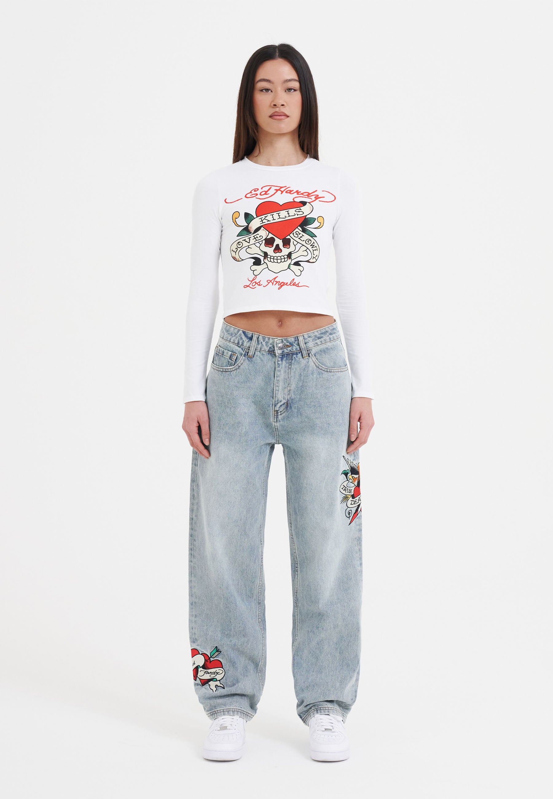 Den hvide langærmede Love Kills-t-shirt passer perfekt sammen med boyfriend-jeans for en tilbagevendende stil.