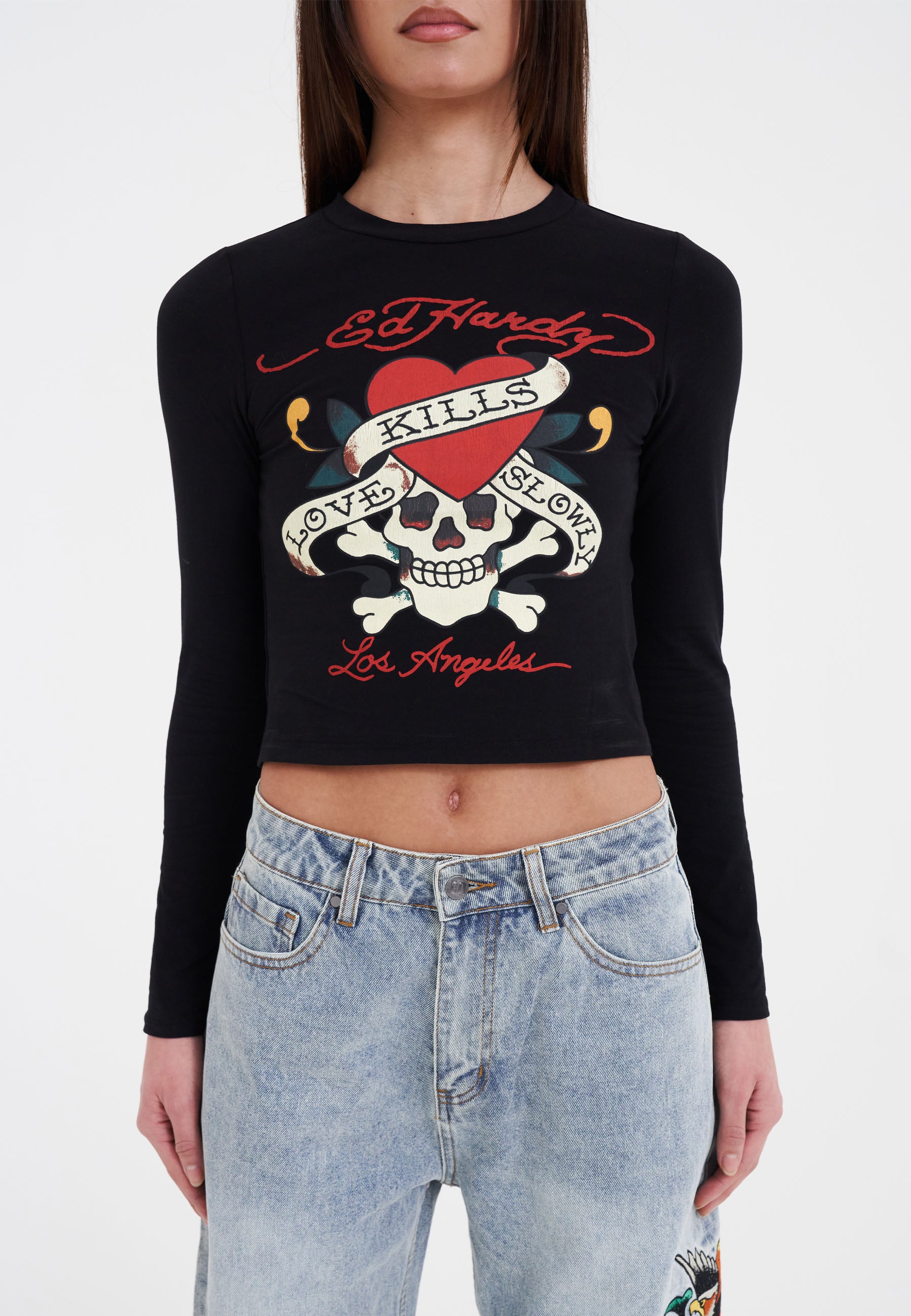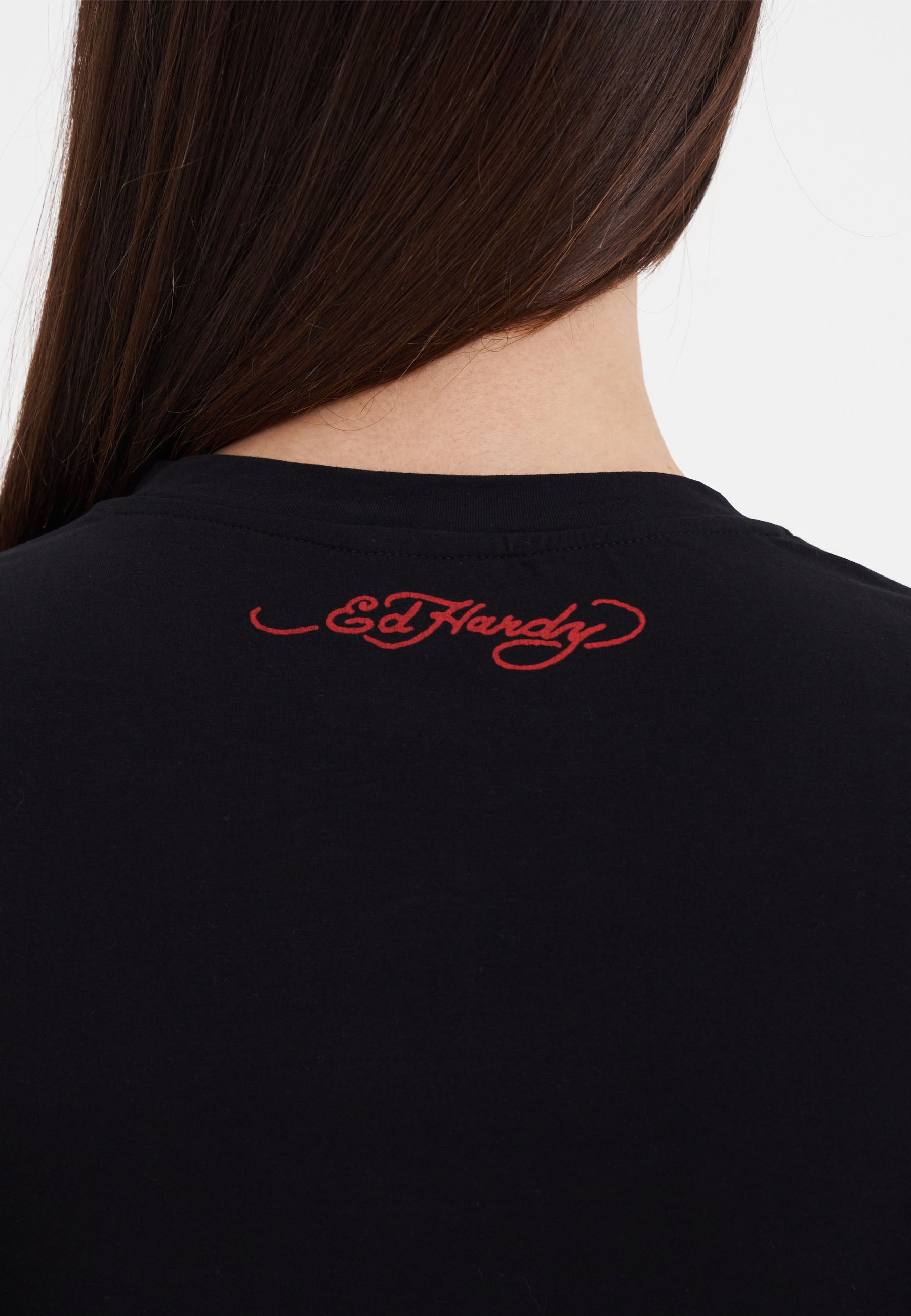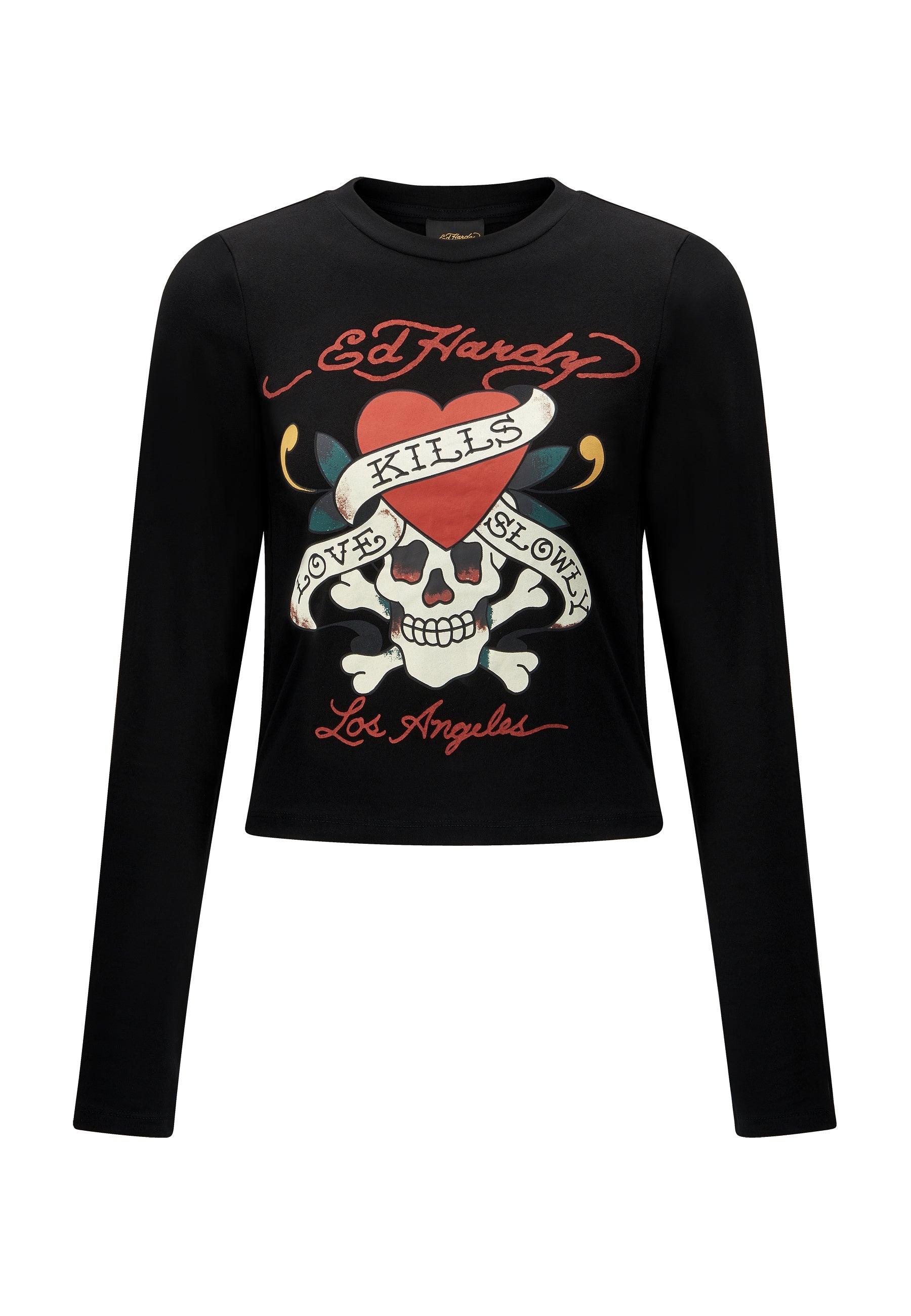 Fed Ed Hardy tatoveringsinspireret grafik sidder foran og i midten på denne sorte langærmede t-shirt, der sidder godt fast alle de rigtige steder og har Dons logo-signatur foran og bagpå.