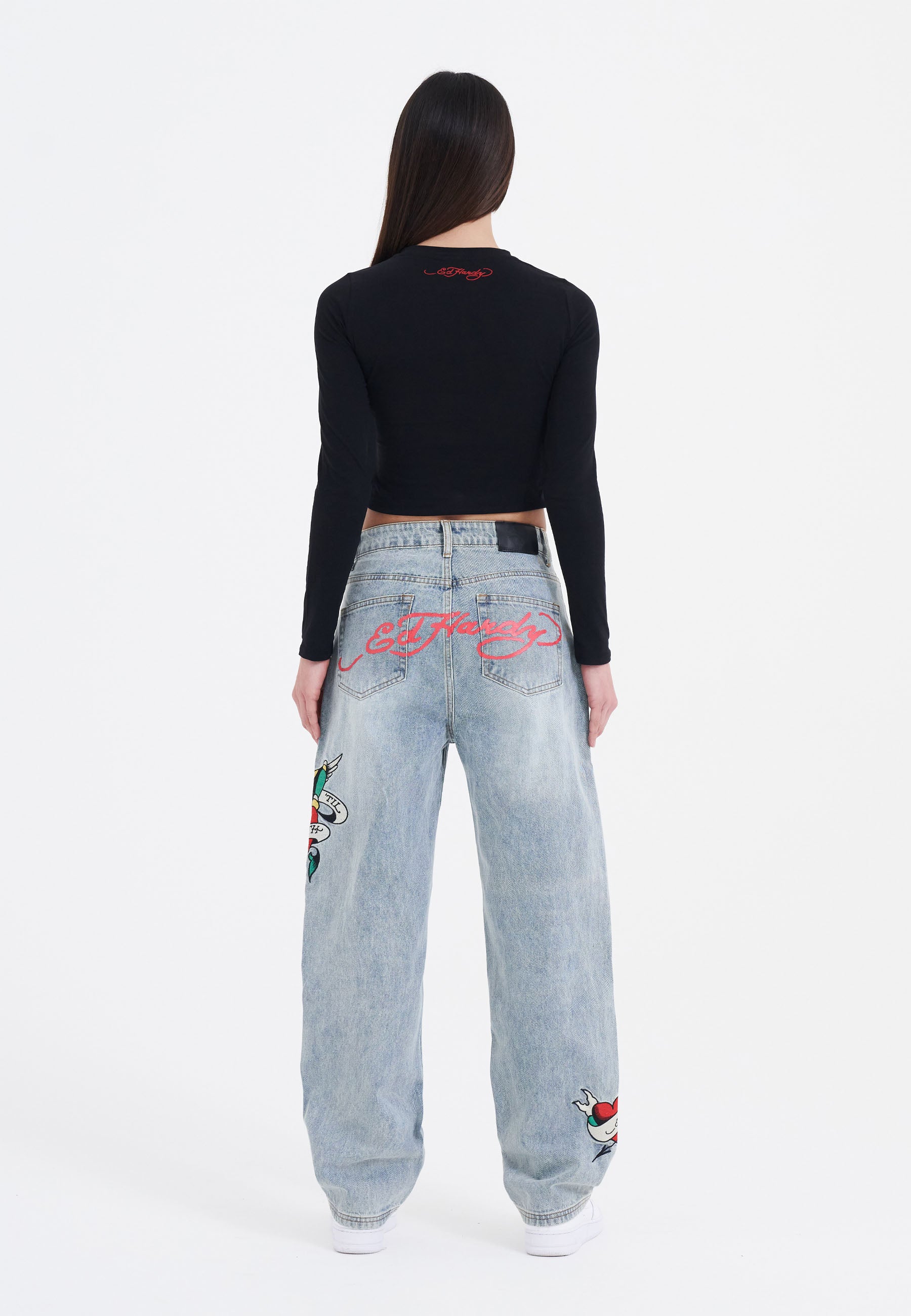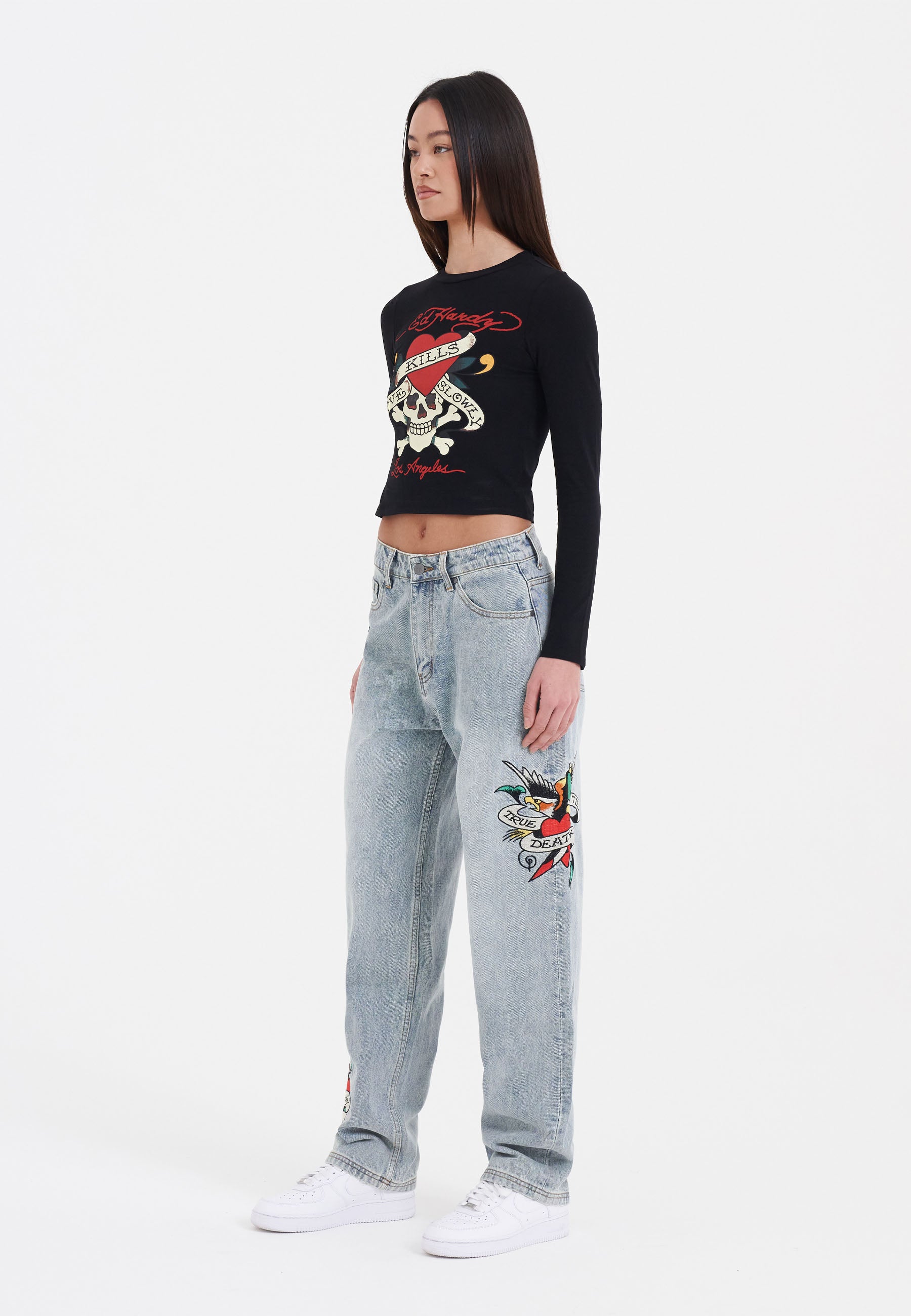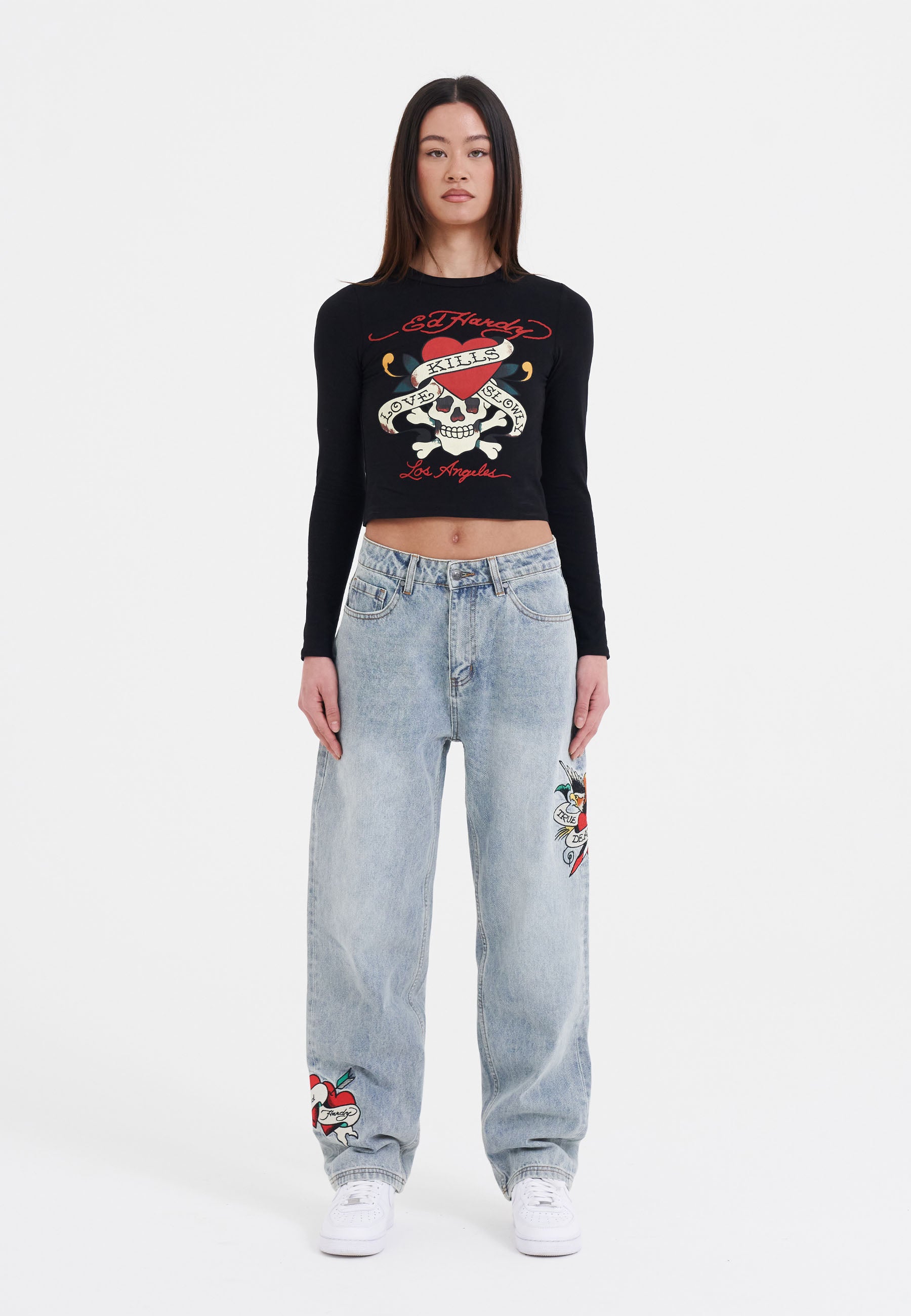 Fed Ed Hardy tatoveringsinspireret grafik sidder foran og i midten på denne sorte langærmede t-shirt, der sidder godt fast alle de rigtige steder og har Dons logo-signatur foran og bagpå.
