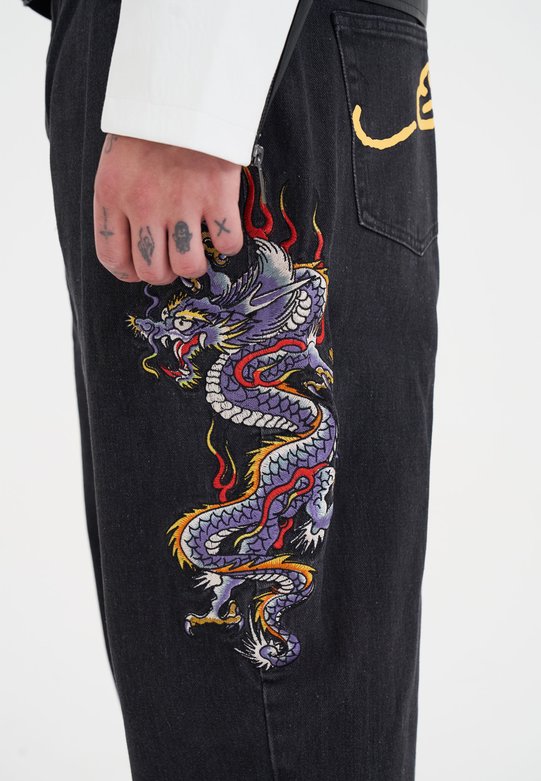 Herre Battle-Dragon Tattoo Denim Bukser Baggy Jeans - Sort