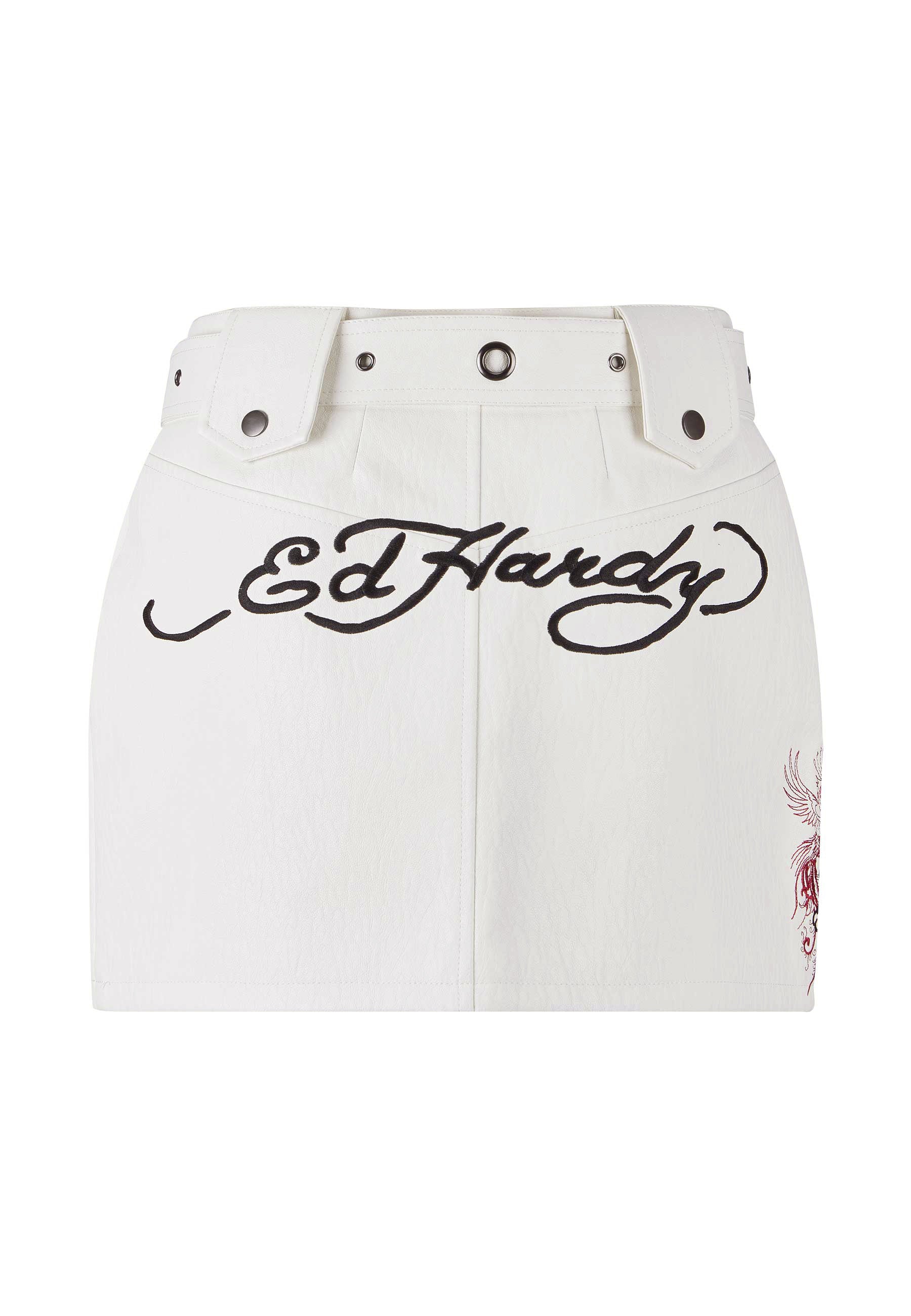 Vi præsenterer den ikoniske Death or Glory PU-mininederdel. Denne sorte PU-mini er en mini lavet til hver sæson, og den har det ikoniske Death or Glory-kunstværk, hentet fra Eds arkivskitsebøger og bragt til live i livagtigt lagdelt karmosinrødt broderi.