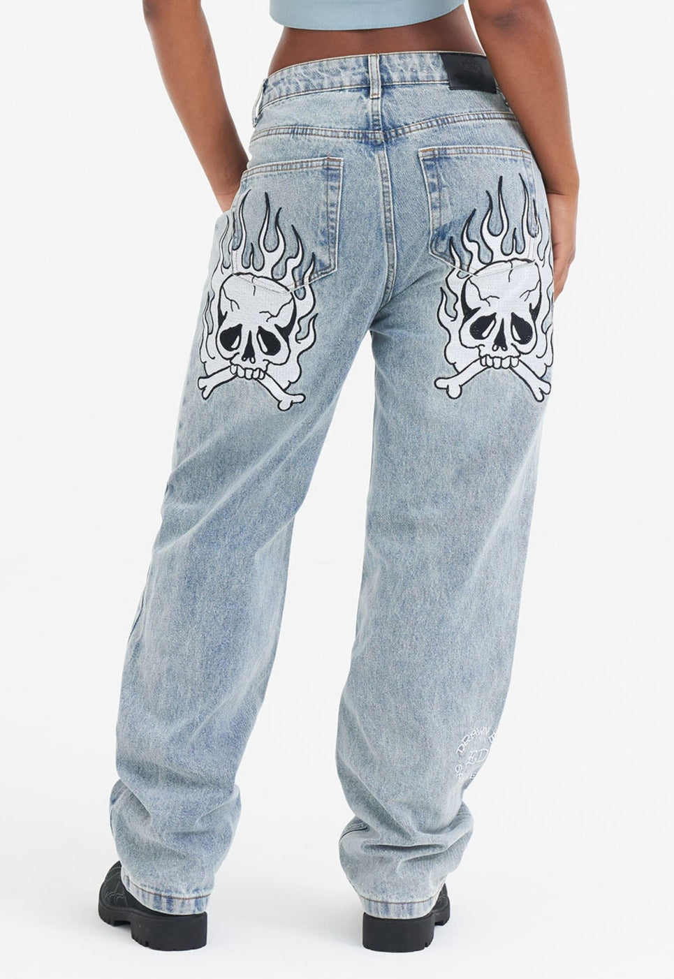 Dame Flaming Skull Relaxed Denim Bukser Jeans - Blå