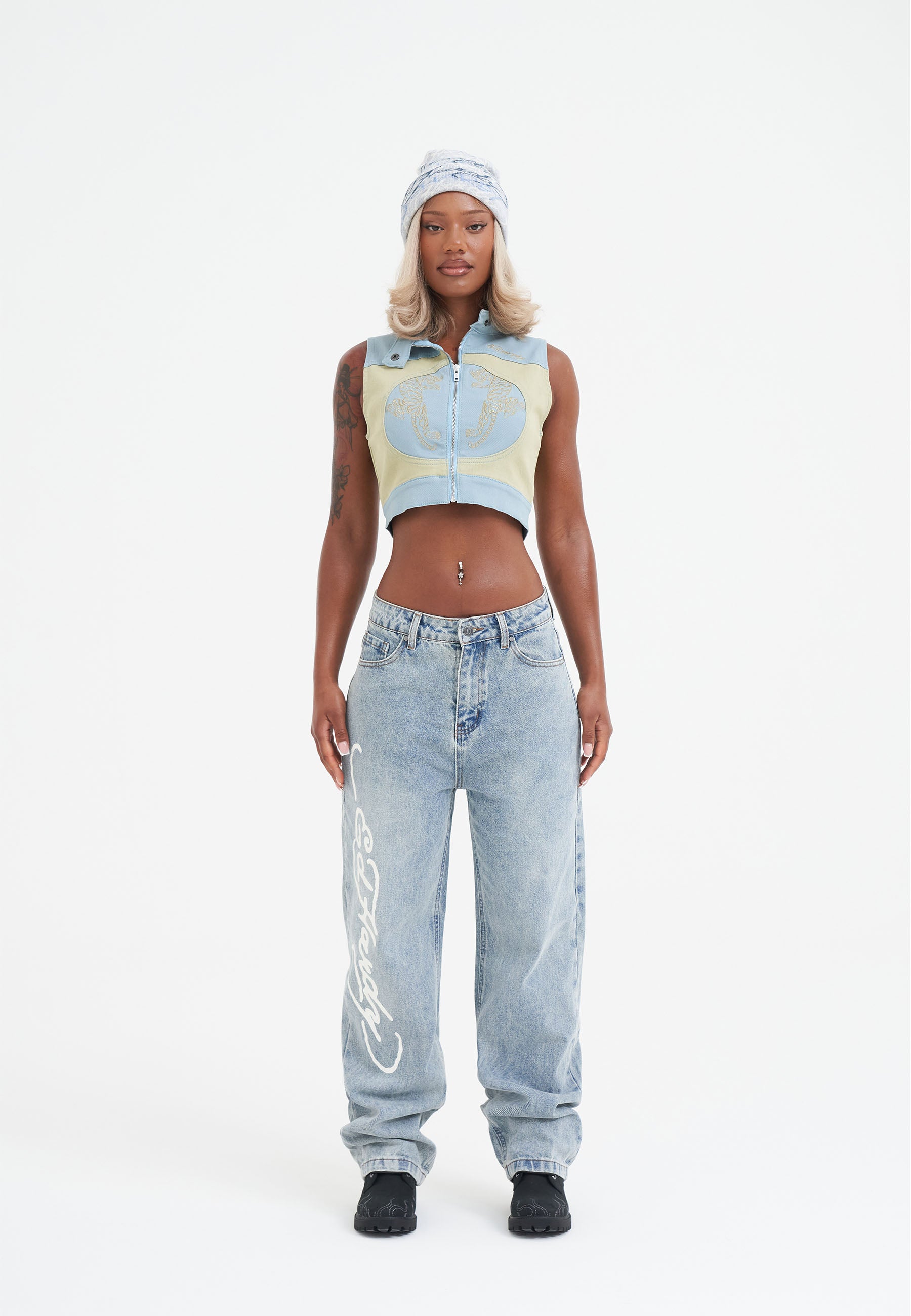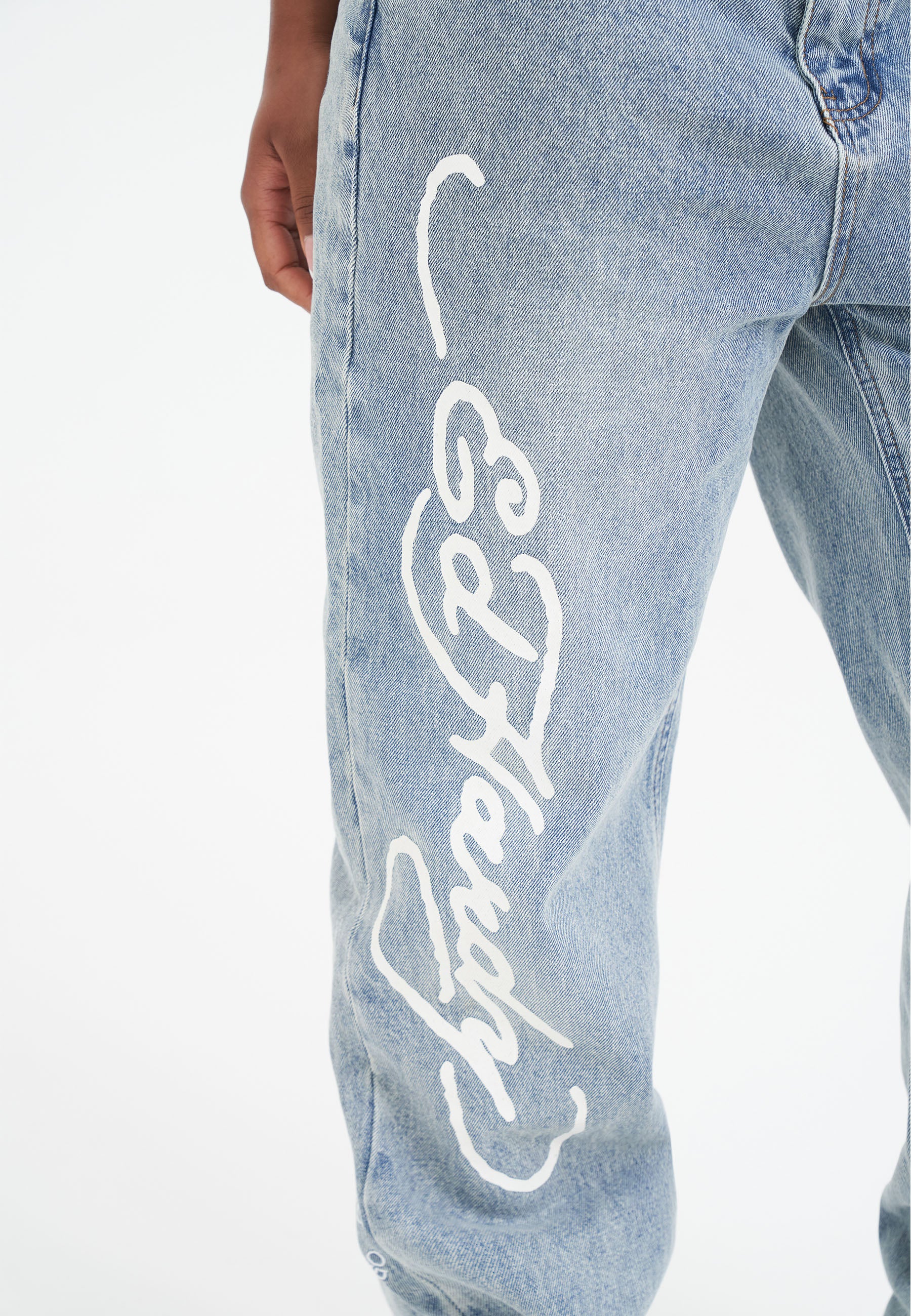 Med to spejlbillede tonale flammende kranier og en enorm Ed Hardy-signatur langs benet; dette stykke er designet til generationer af modige kvinder.