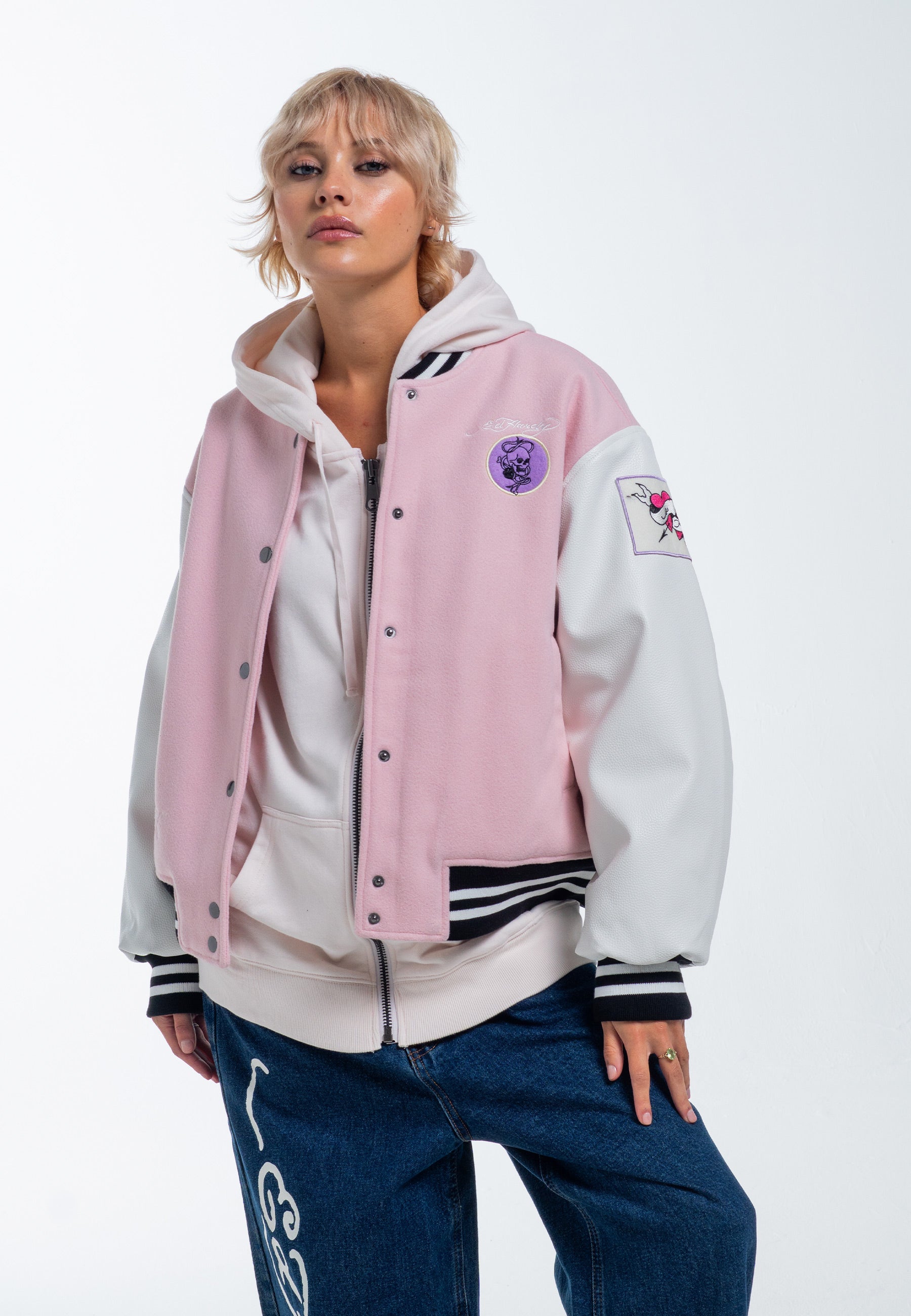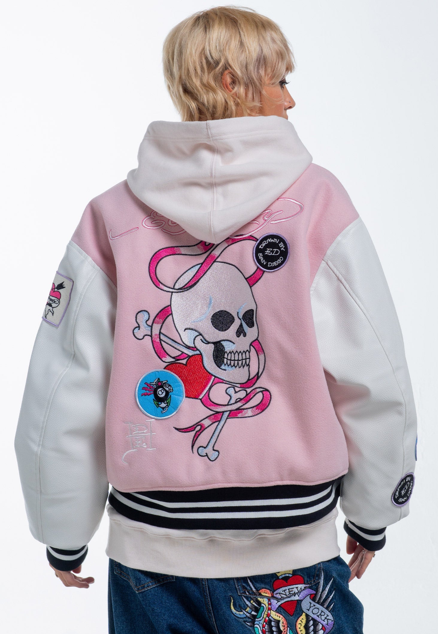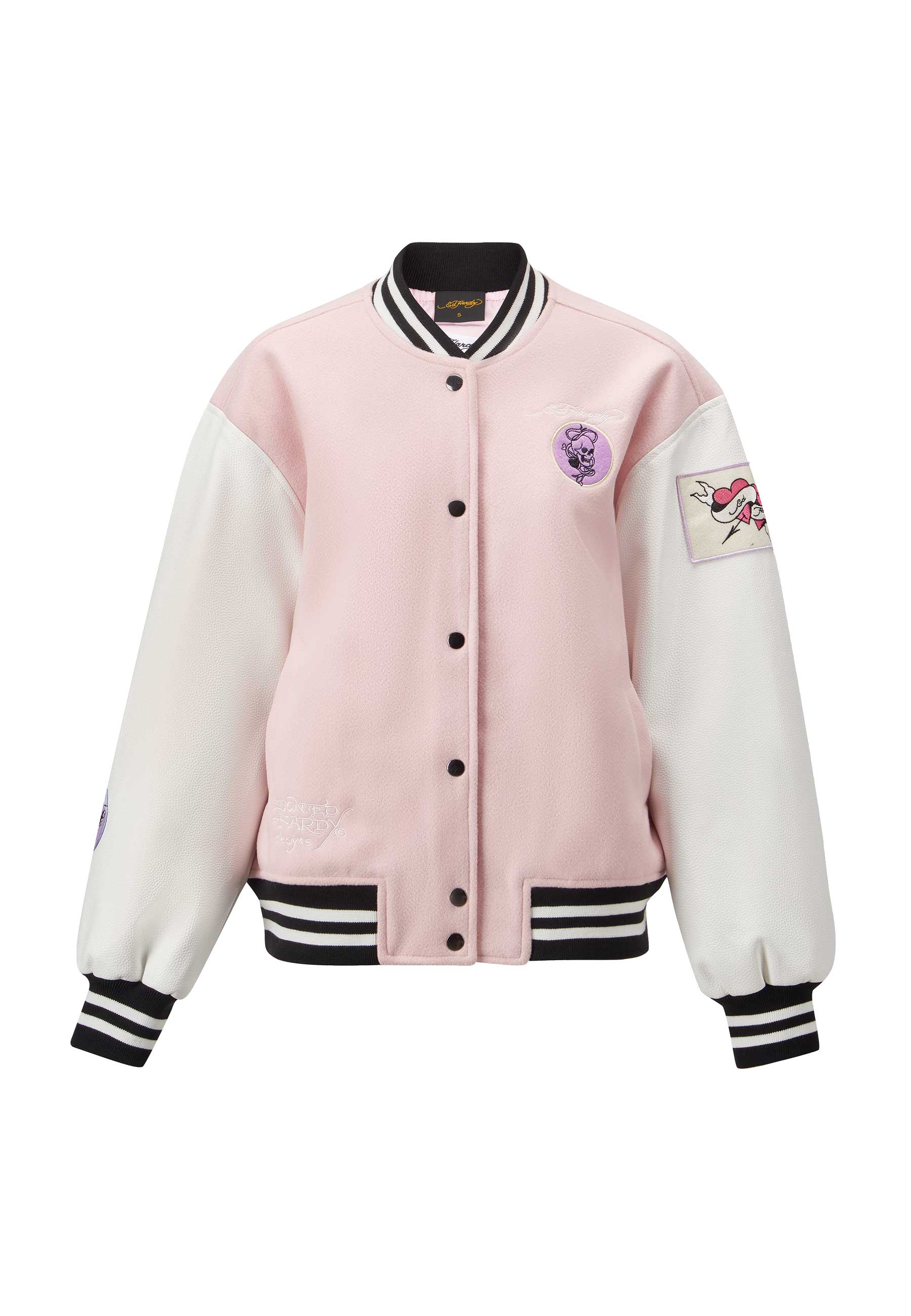 Vi præsenterer Love Wrapped Varsity Bomber Jacket, et tofarvet mesterværk i pink og hvid. Fremstillet af 70 % uld og 30 % tumlet PU, med et primært broderet design af kranium og knogler, den er prydet med yderligere applikationsmærker, der viser et udvalg af Eds signaturdesign.
