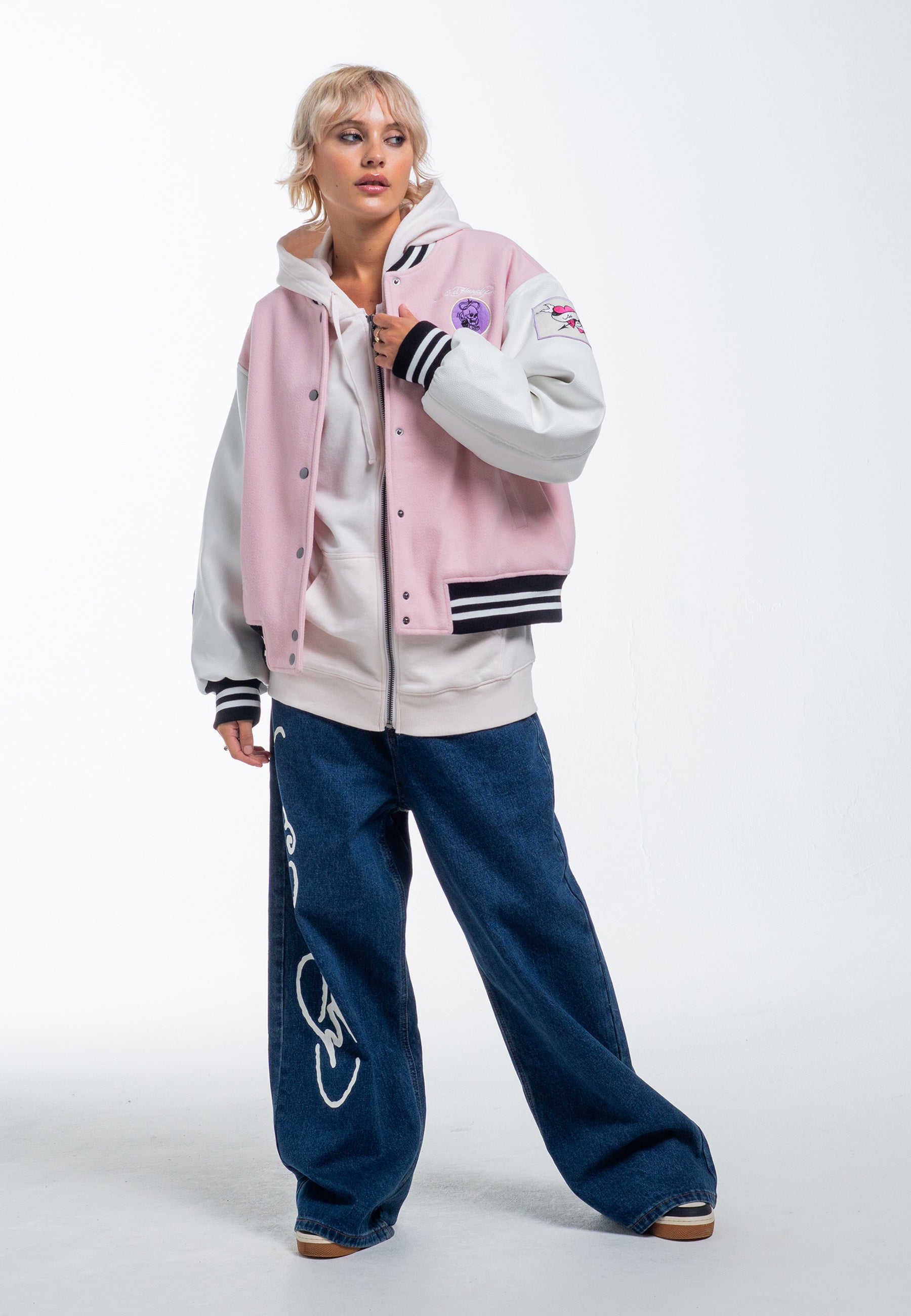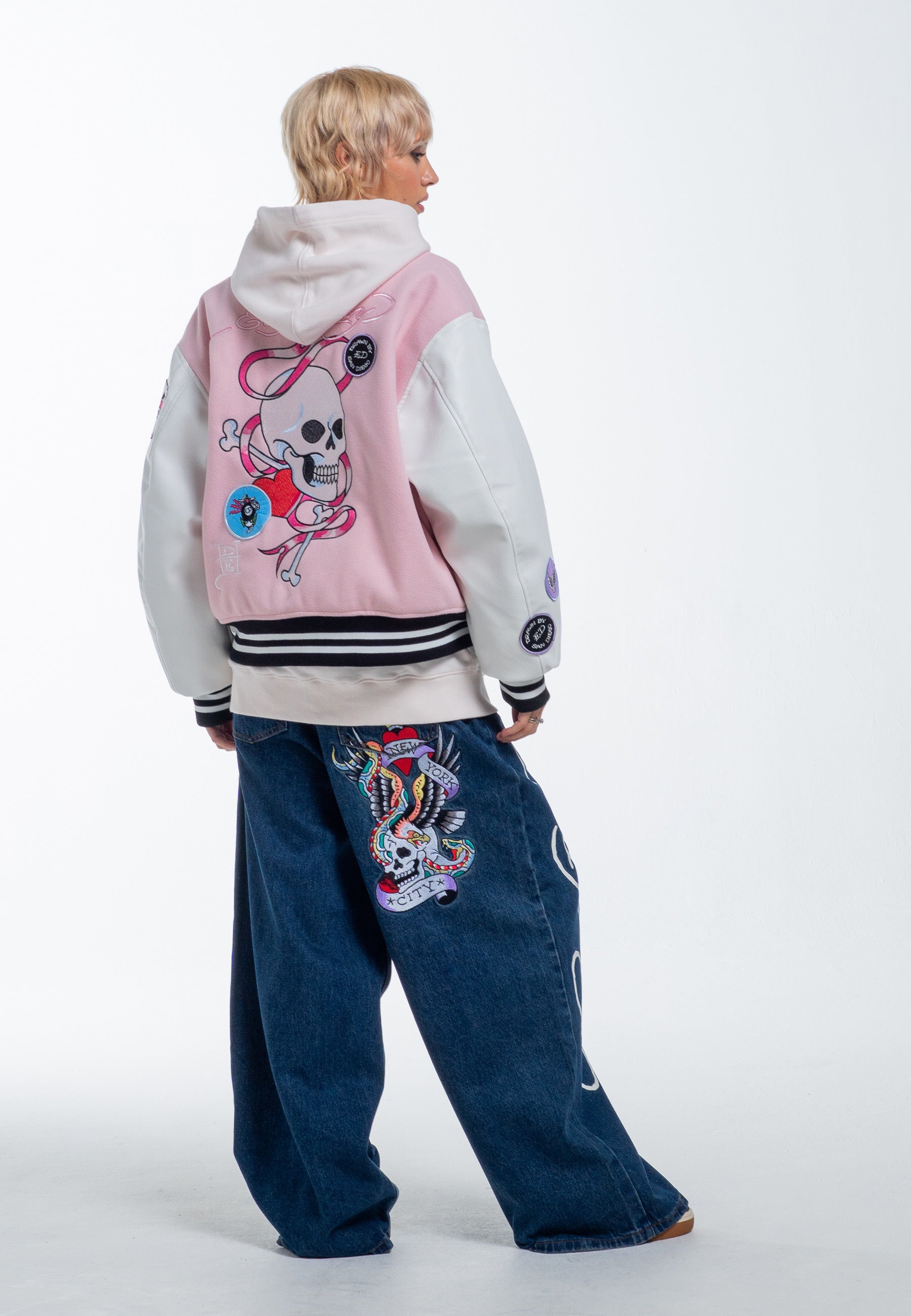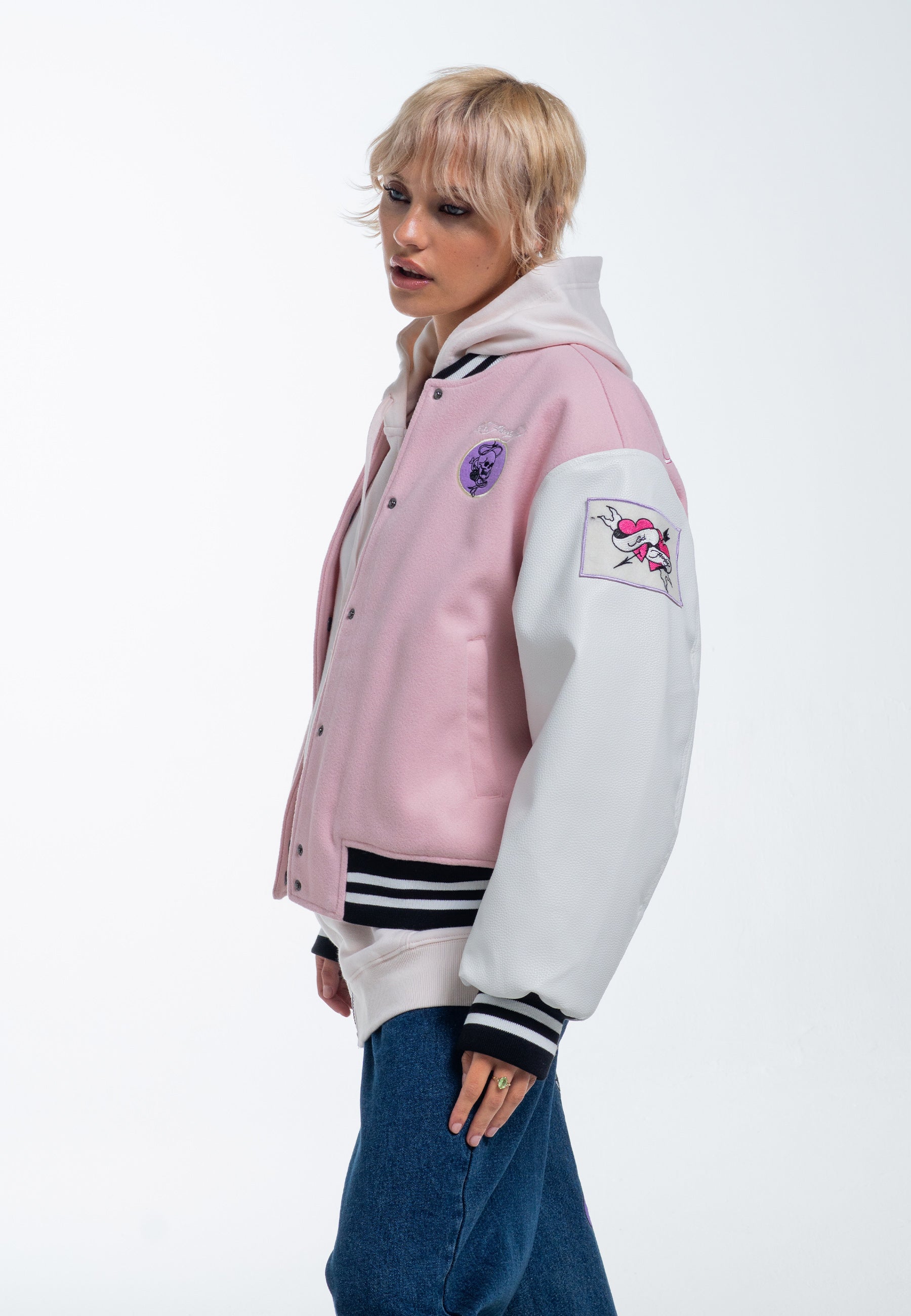 Vi præsenterer Love Wrapped Varsity Bomber Jacket, et tofarvet mesterværk i pink og hvid. Fremstillet af 70 % uld og 30 % tumlet PU, med et primært broderet design af kranium og knogler, den er prydet med yderligere applikationsmærker, der viser et udvalg af Eds signaturdesign.