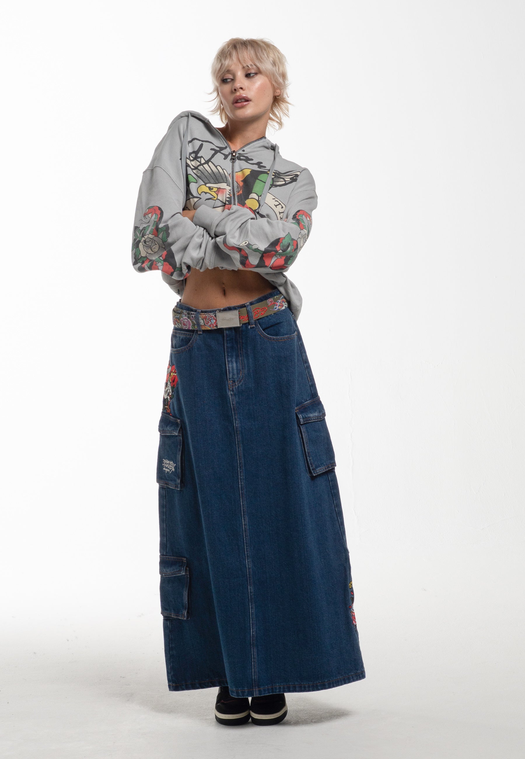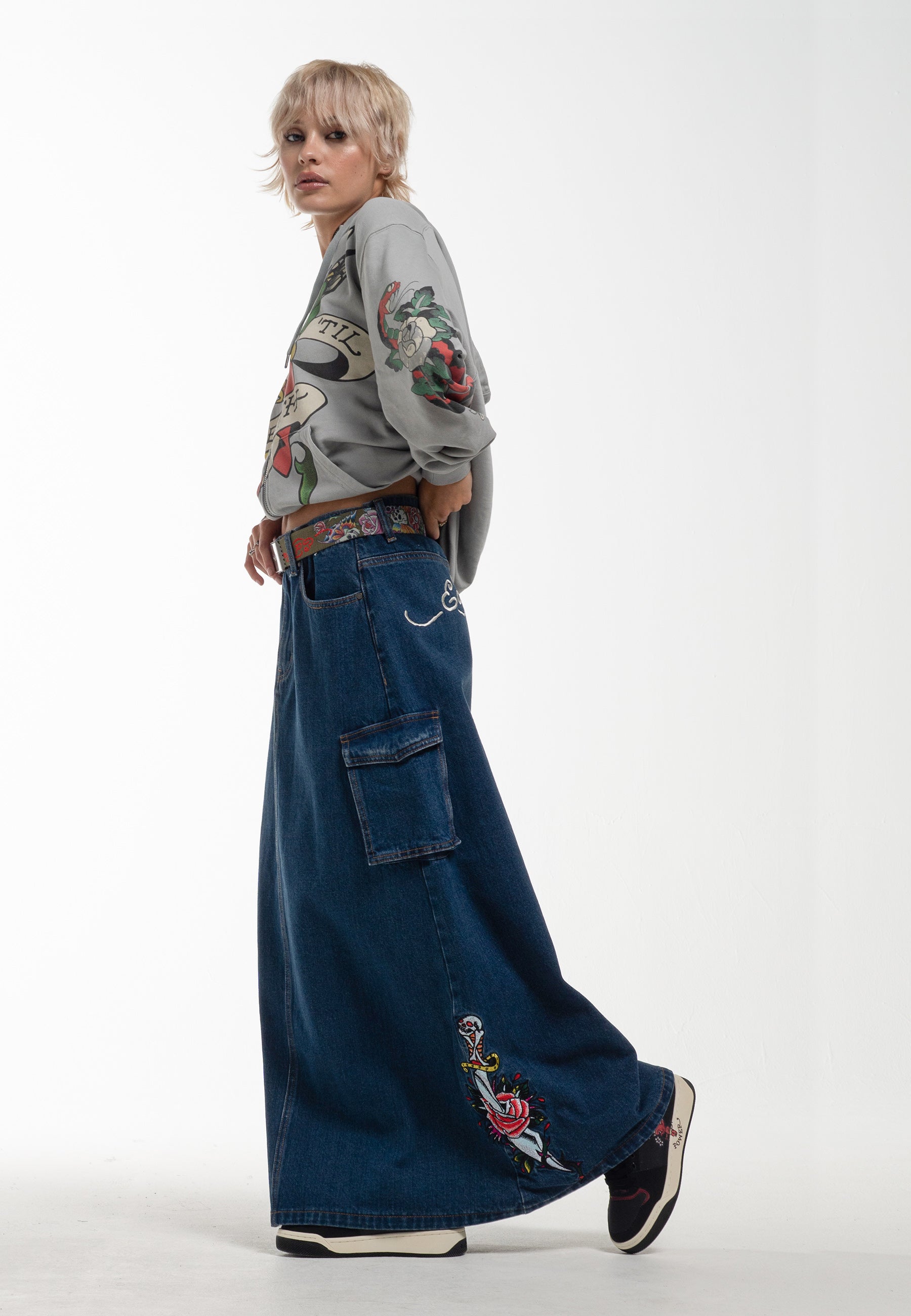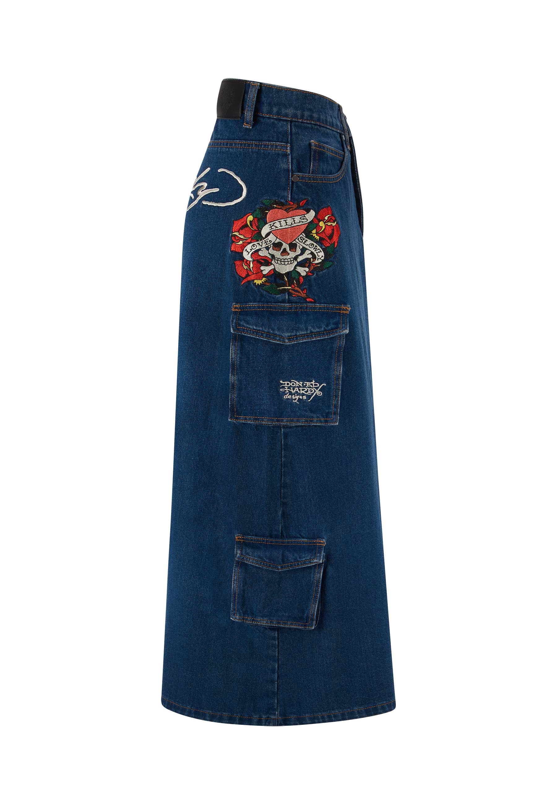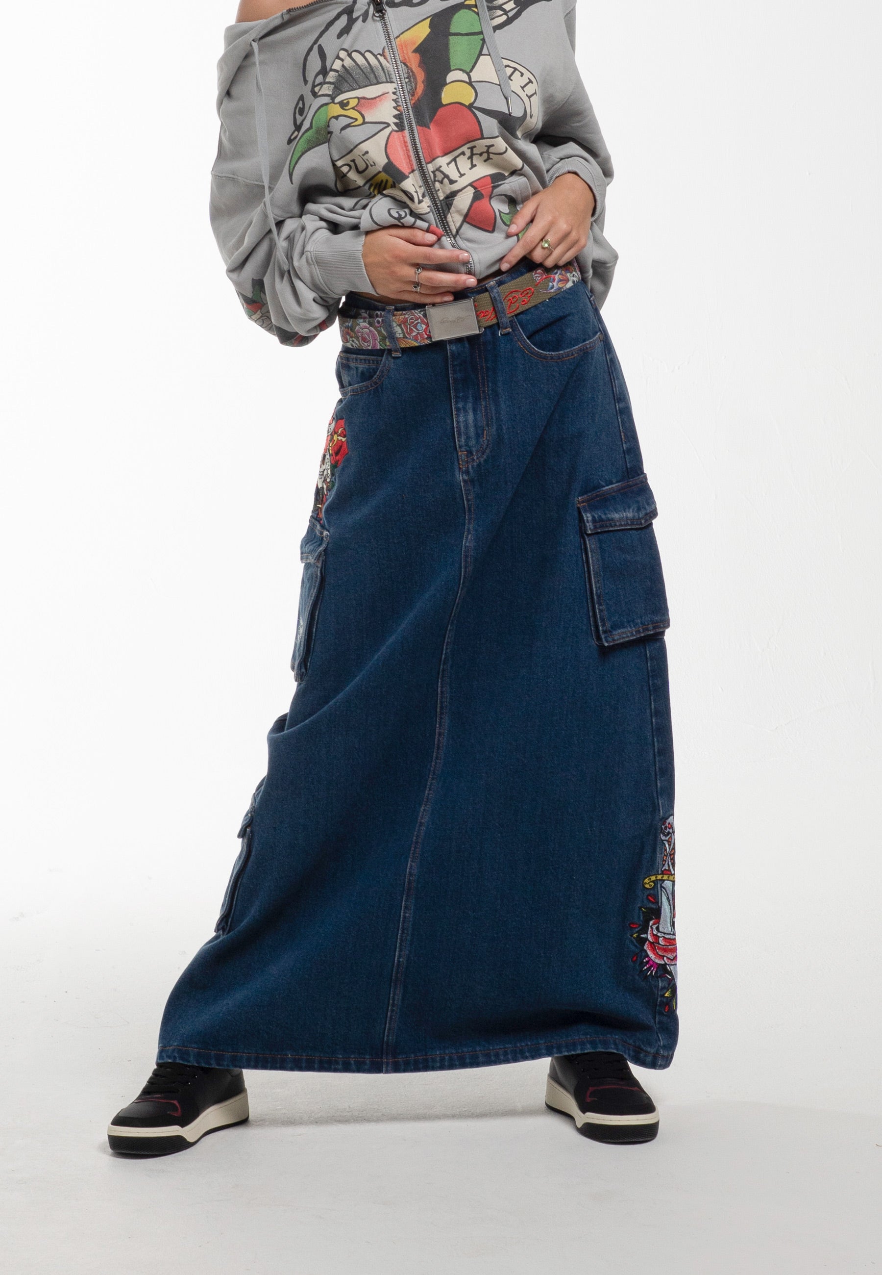 Kvinder Killer Rose Denim Midi Nederdel - Blå