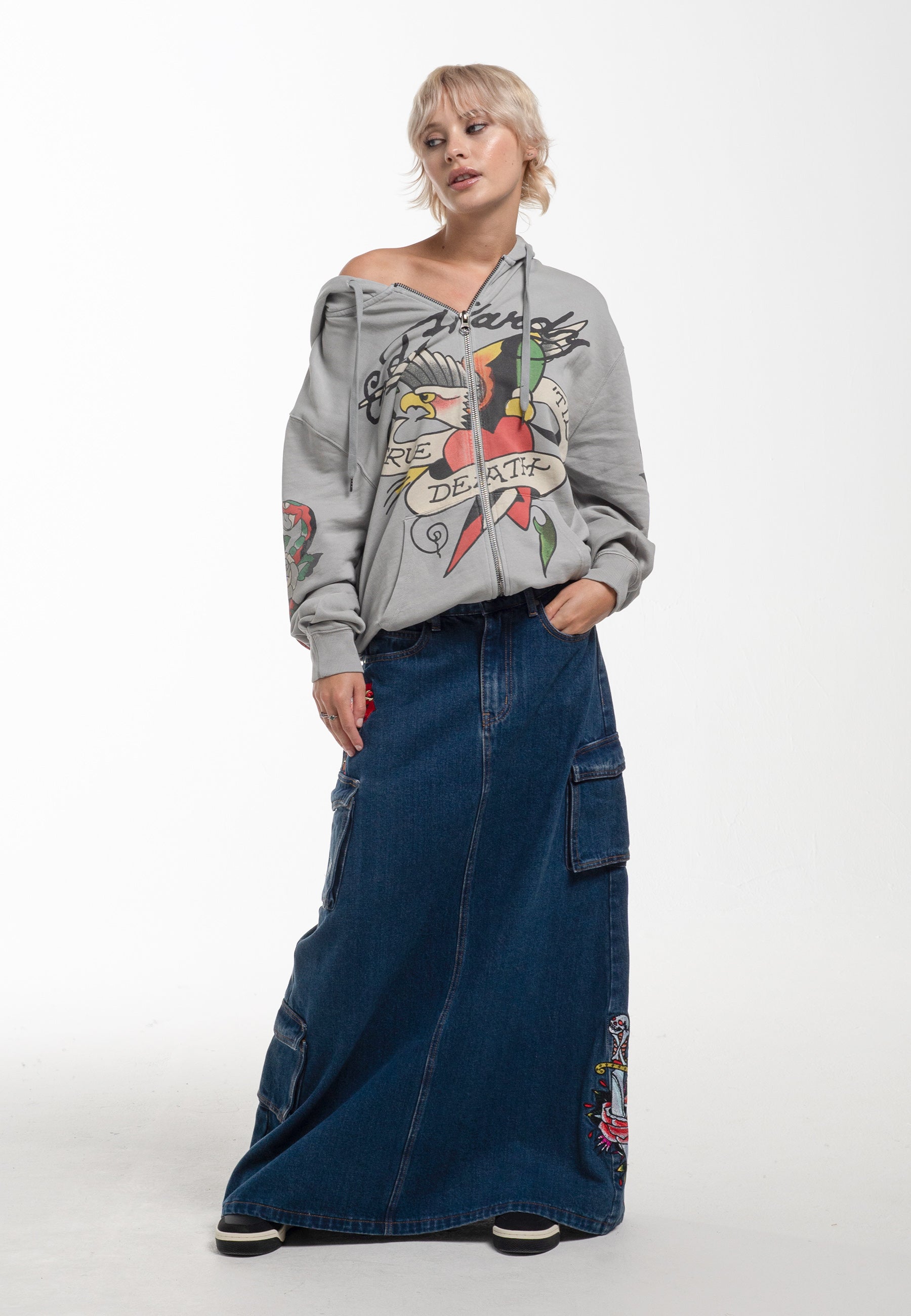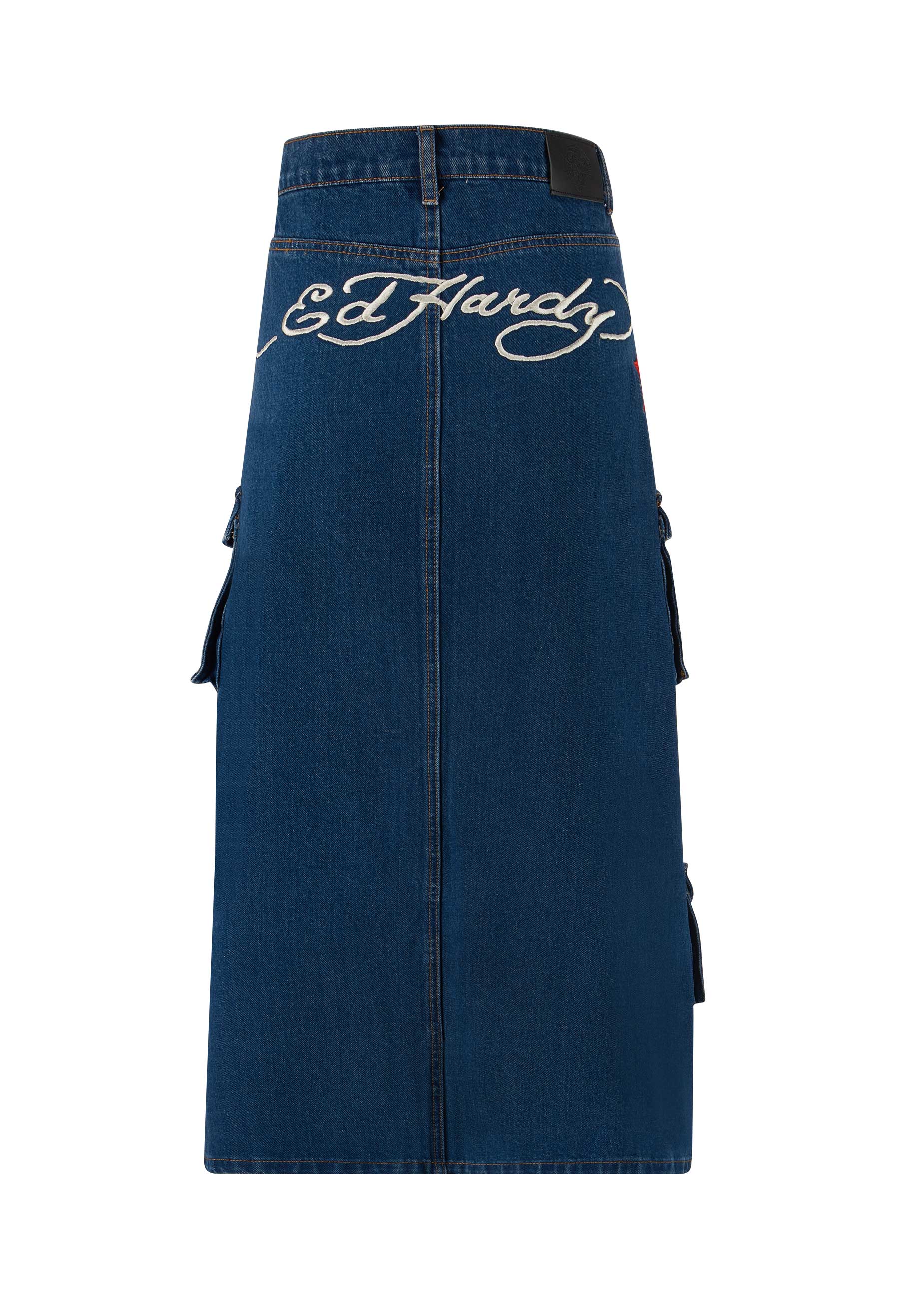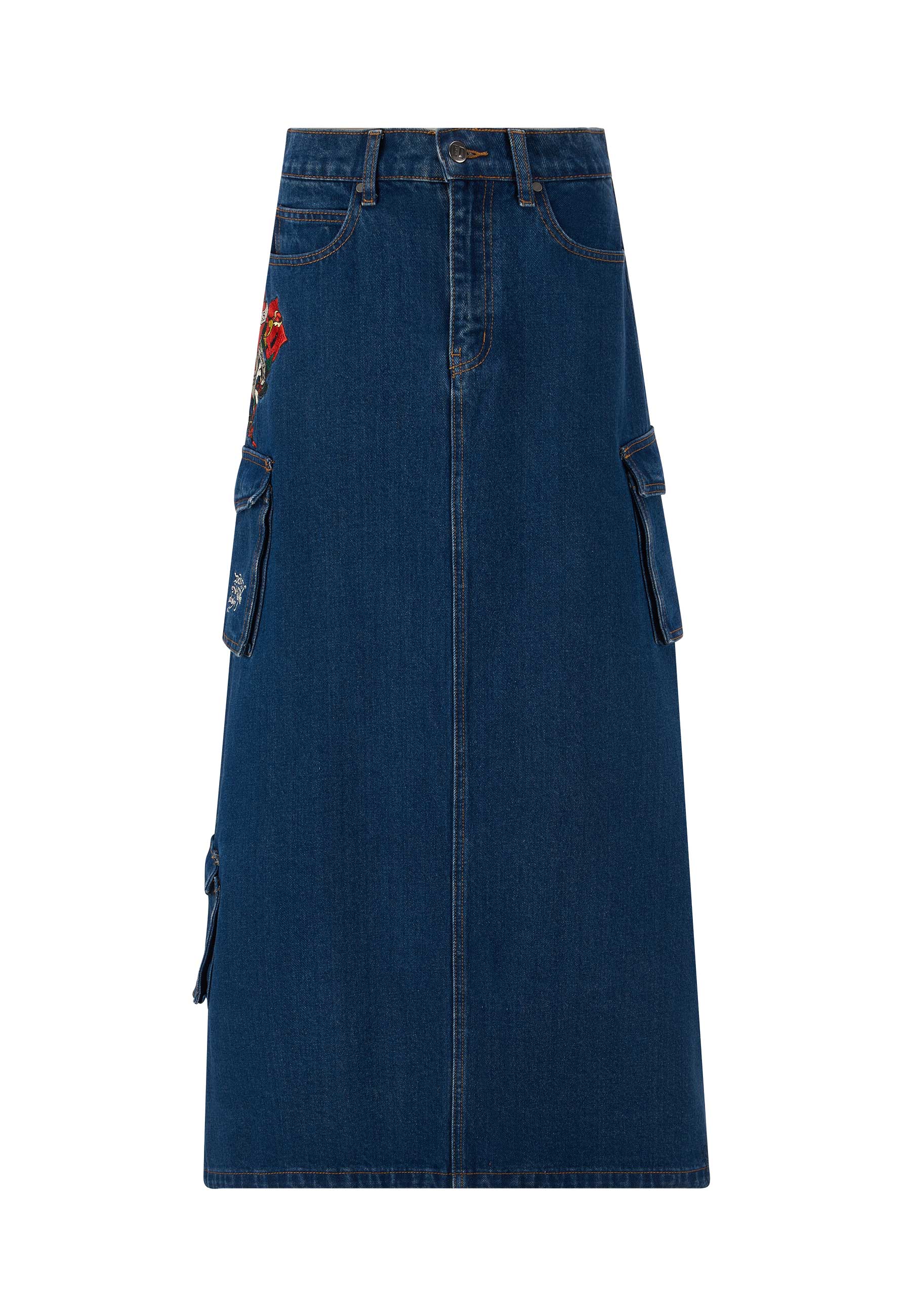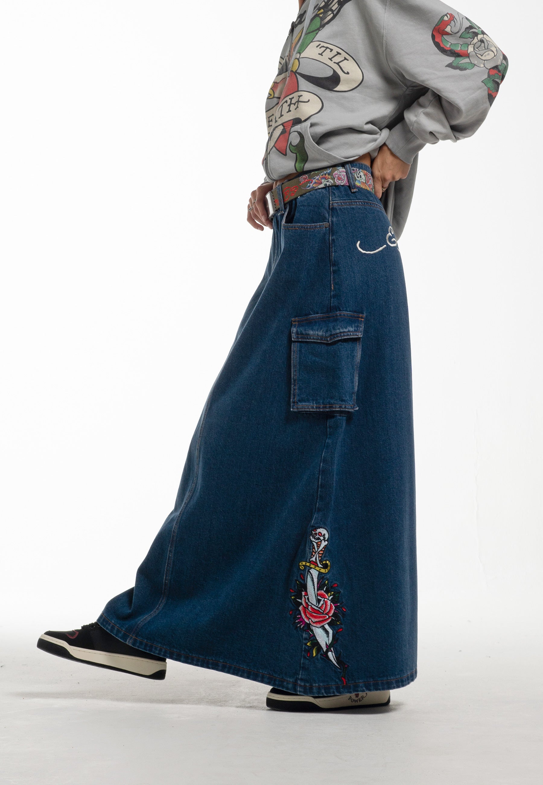 Kvinder Killer Rose Denim Midi Nederdel - Blå