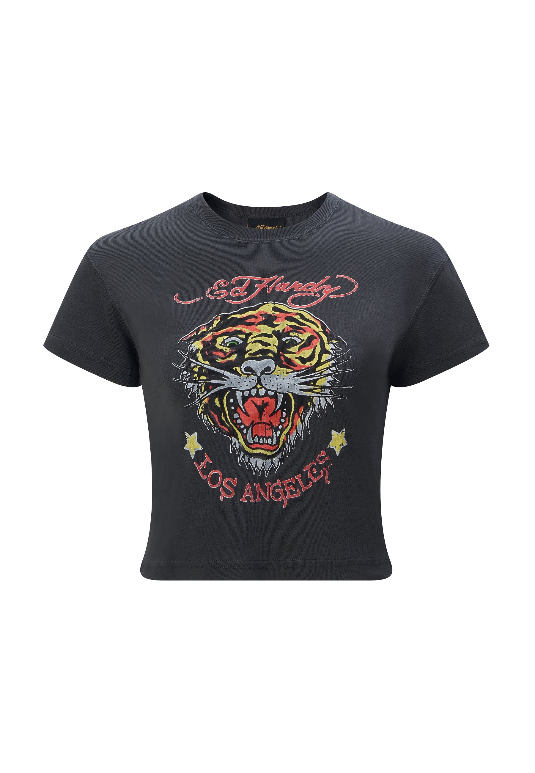 Denne baby-t-shirt i 100 % bomuld i vasket sort har en klassisk tatoveringsinspireret tigergrafik og Los Angeles-typografi for en indlevet vintage-appel.