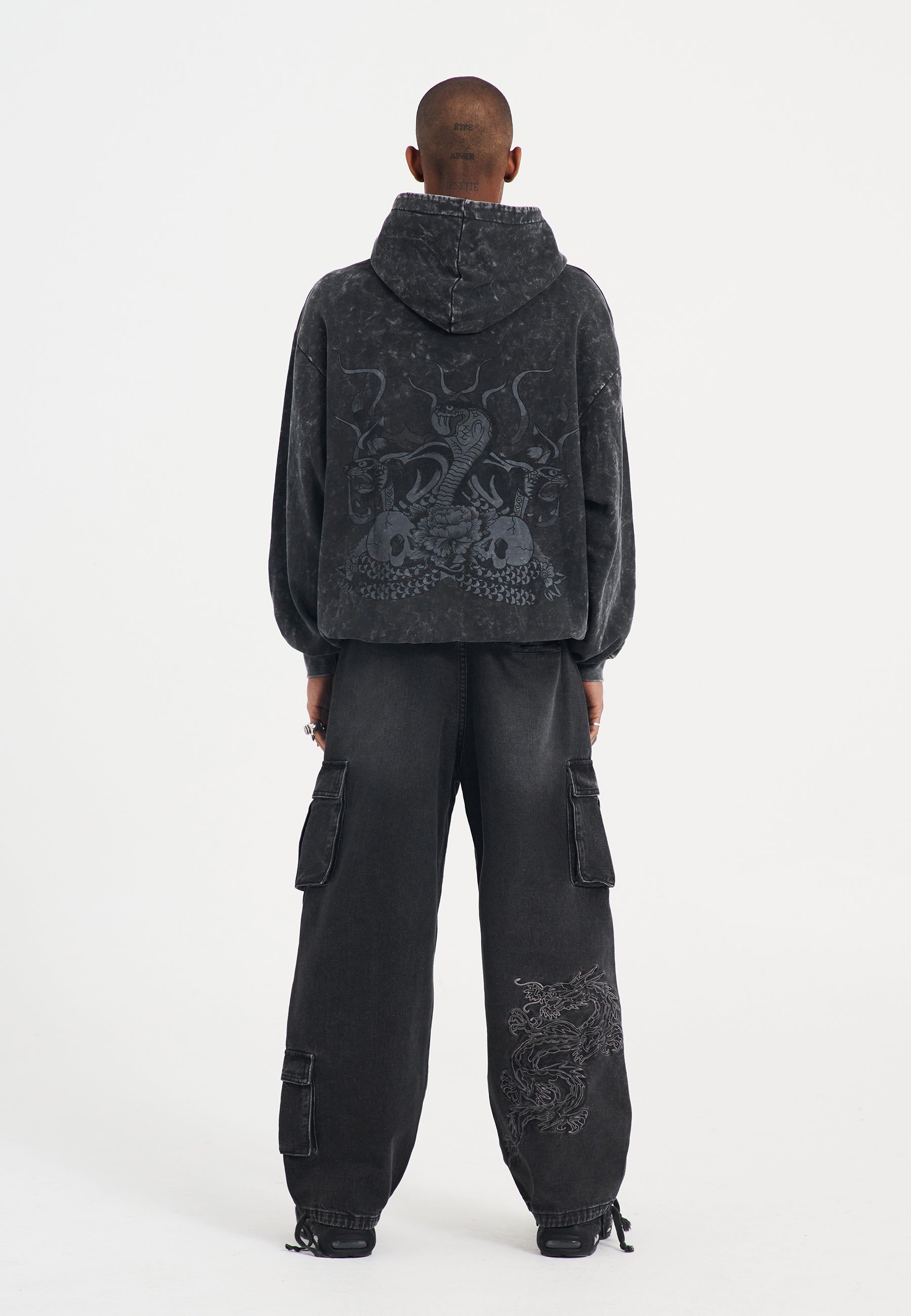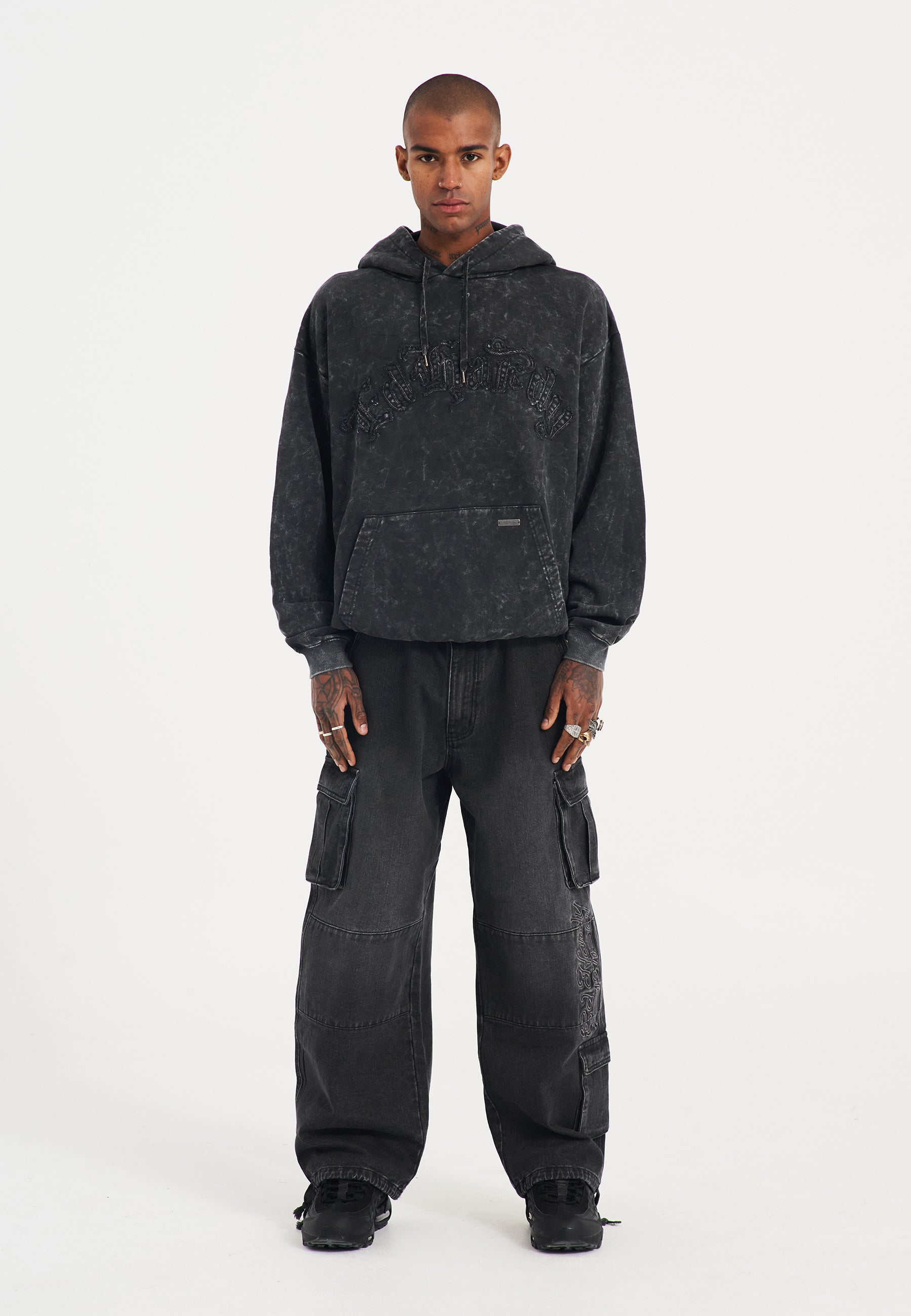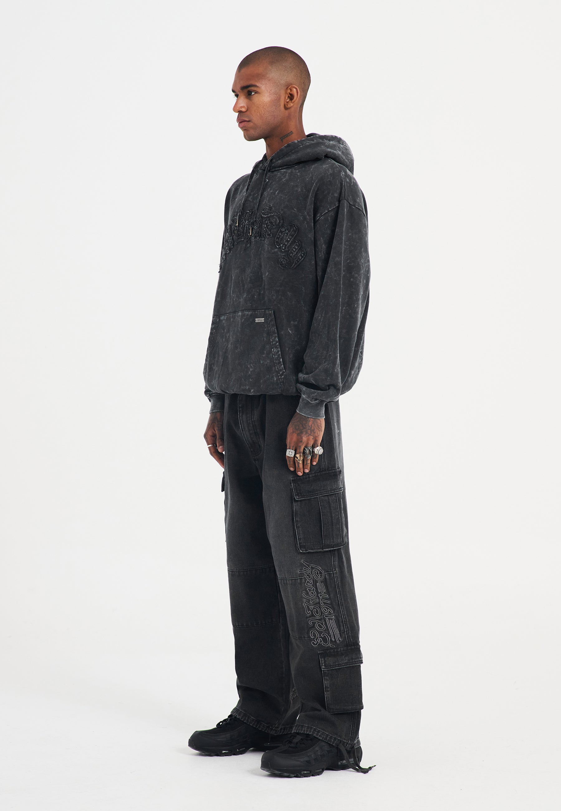 Mens Acid Wash Applique Graphic Pouch Hoodie - Black