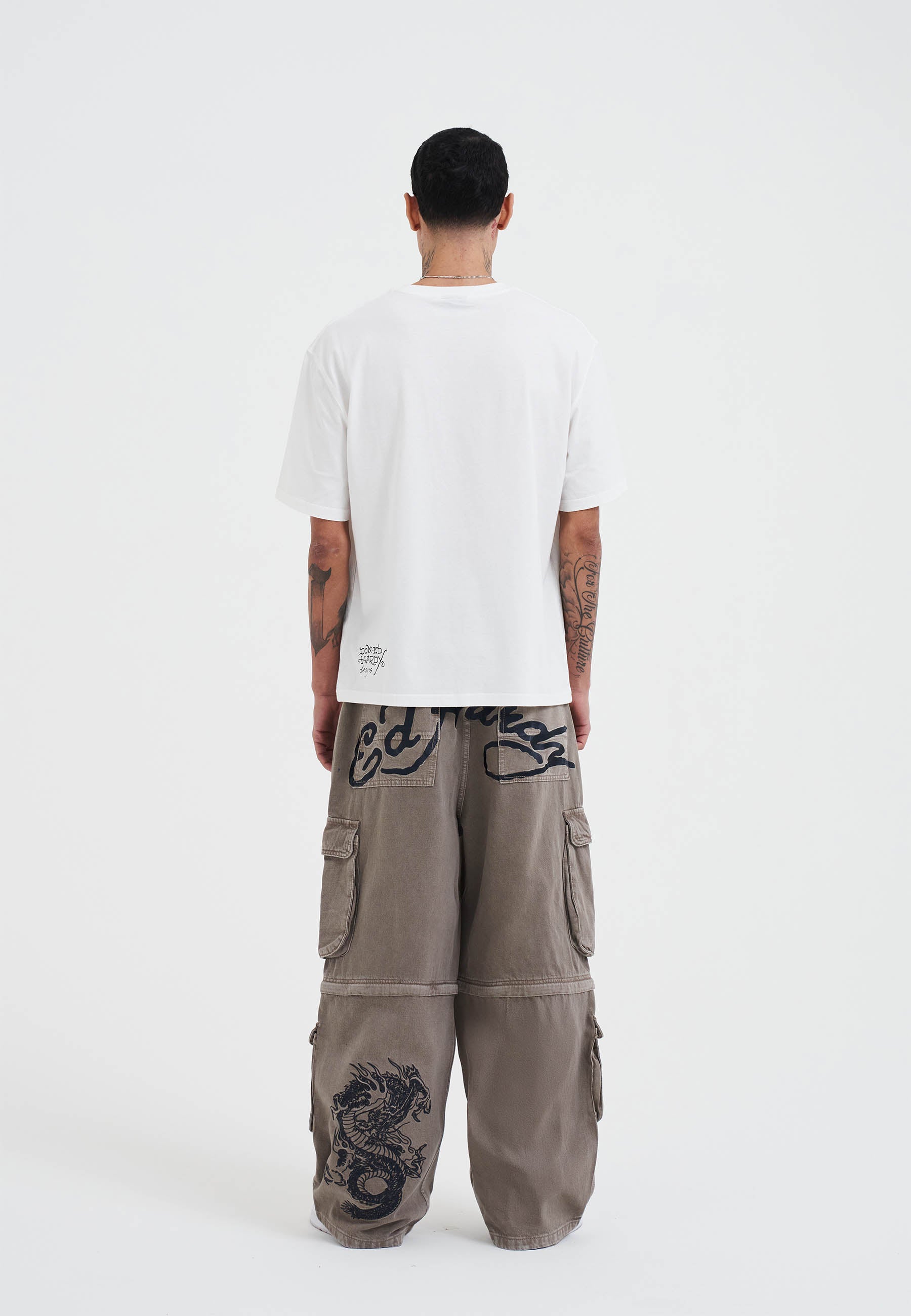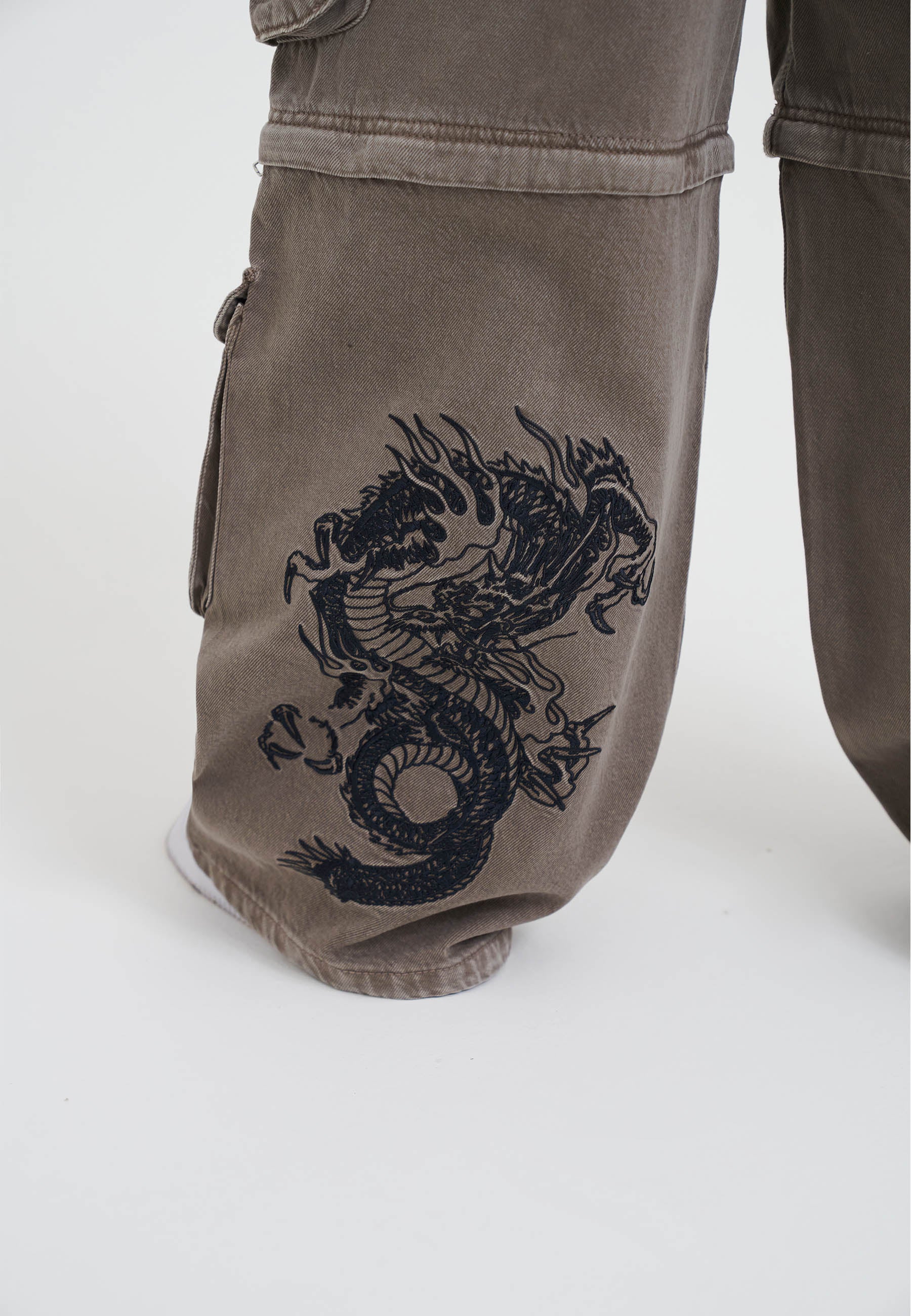 - Embroidered dragon graphic tattoo to the back left leg