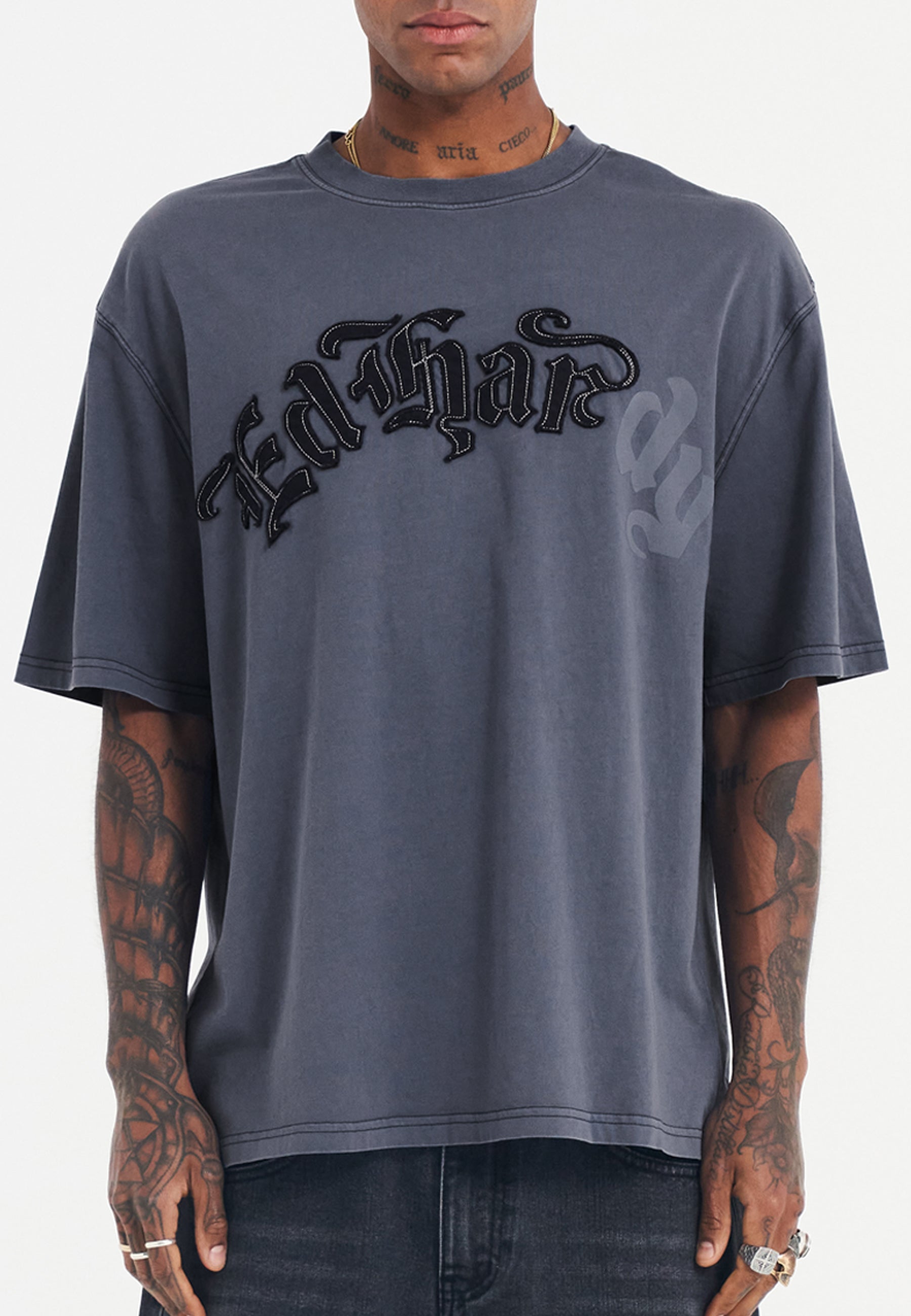 The Distressed Applique Relaxed T-Shirt, with its unique blend of textures and details, is a bold testament to Ed's timeless design.