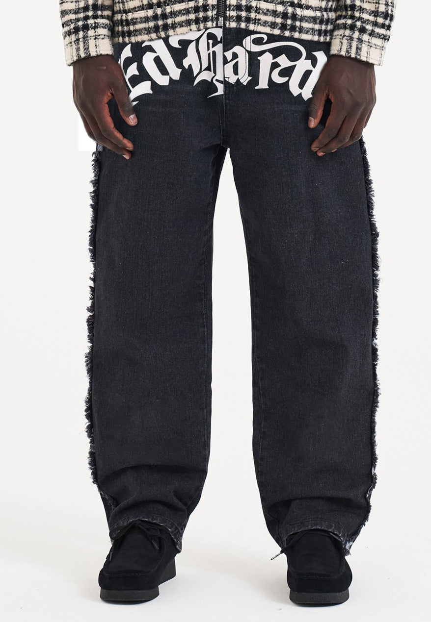 Welcome to a new era of Ed Hardy: the Gothic Frayed Panel Denim Jeans in black, showcasing the evolution of the brand.