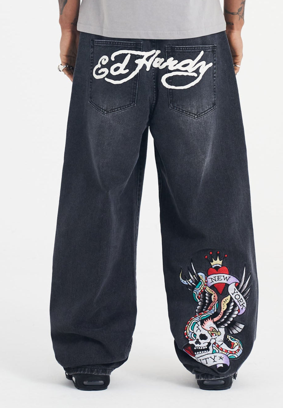 With an unapologetic extra, extra-wide silhouette, vintage wash, and vibrant full-colour embroidery, Ed's artwork returns for a new season.