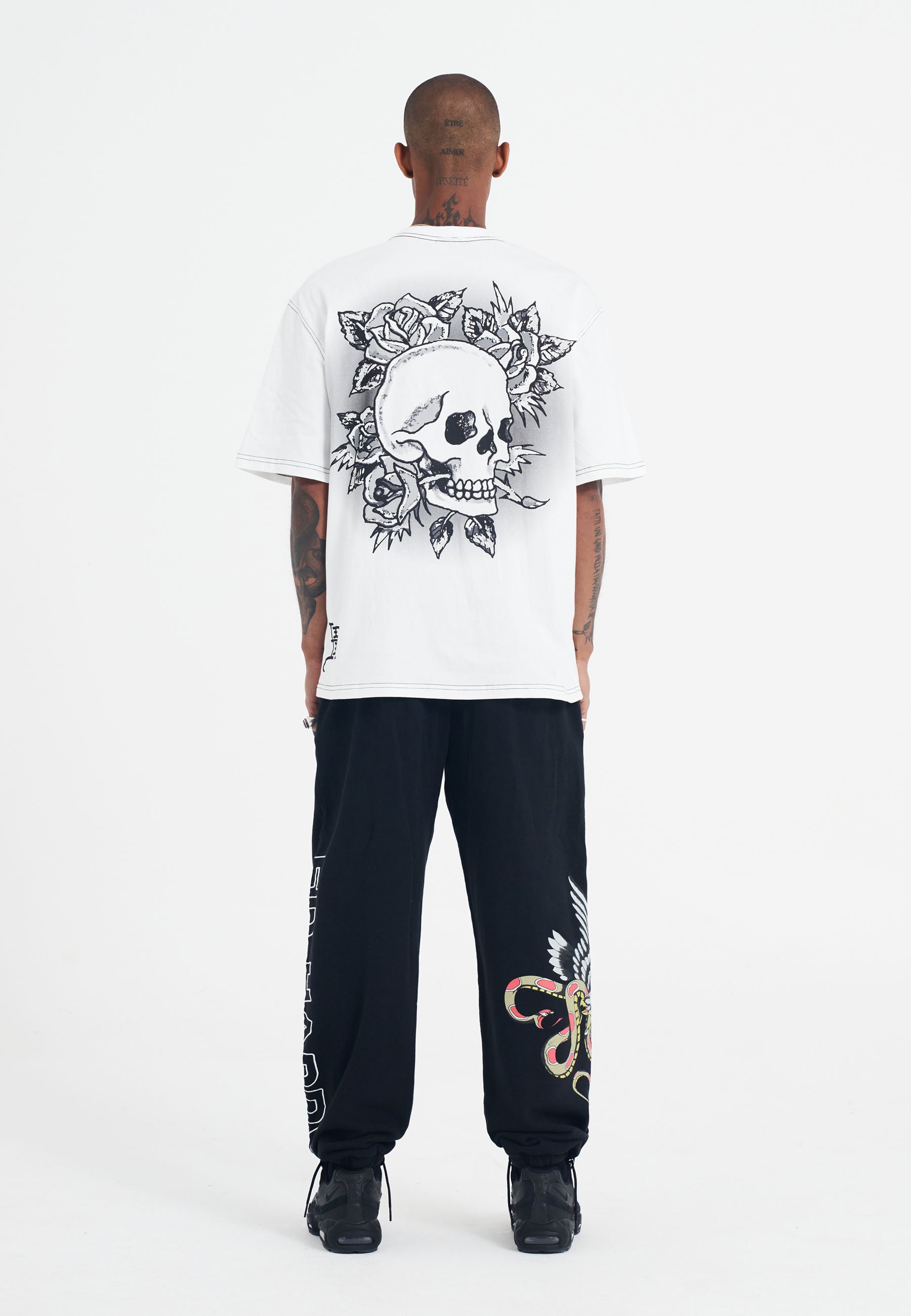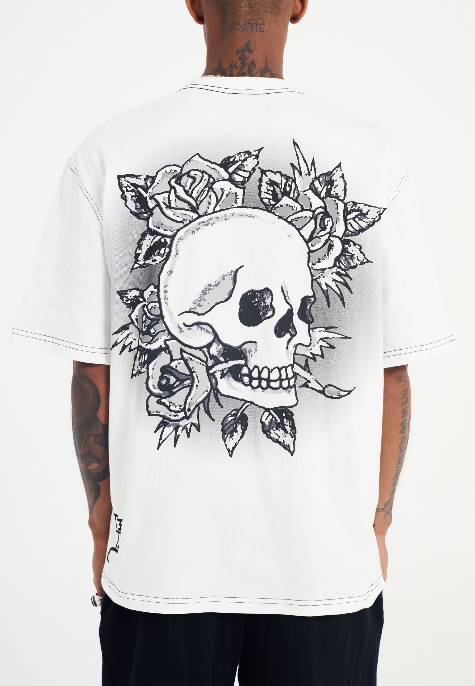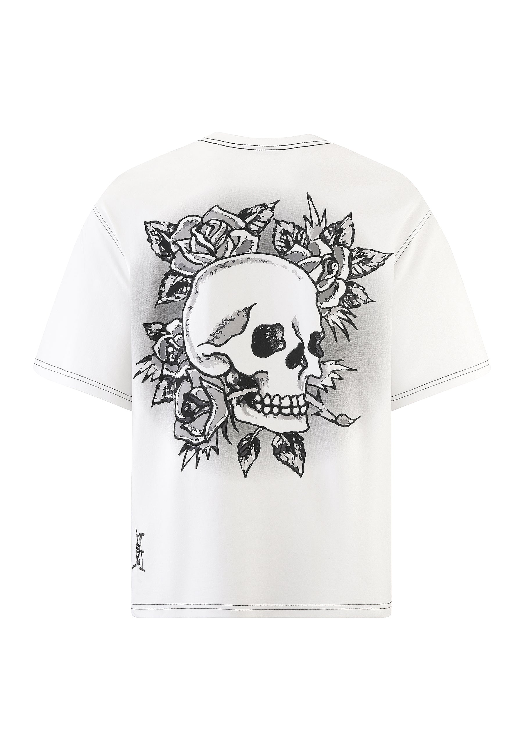 This relaxed-fit tee features a gothic logo on the chest, faded contrast stitching, and a tonal skull and roses graphic on the back.