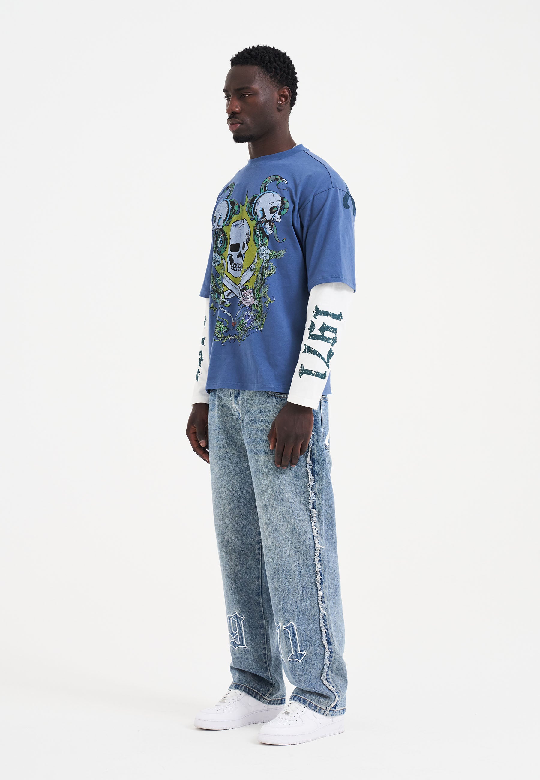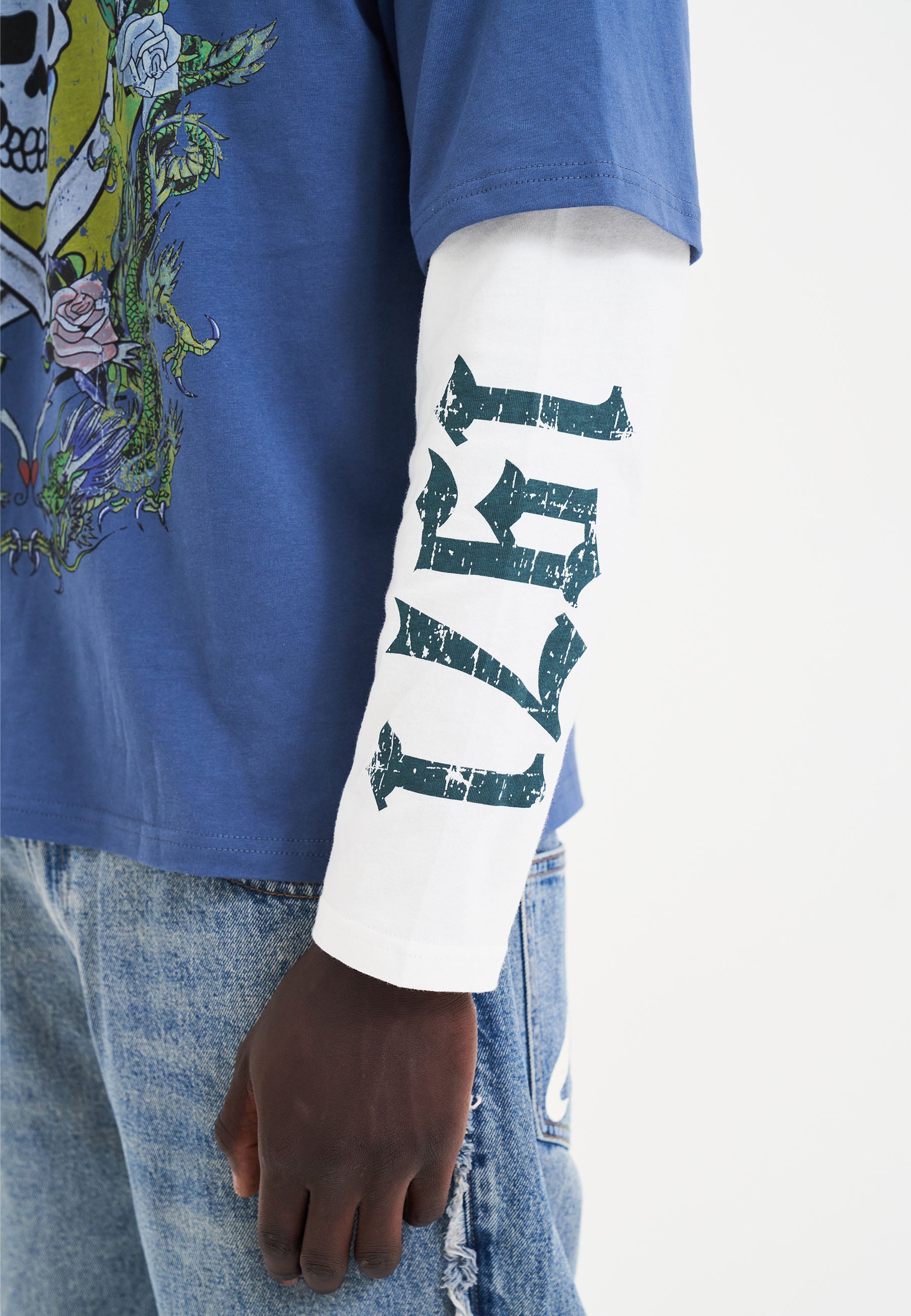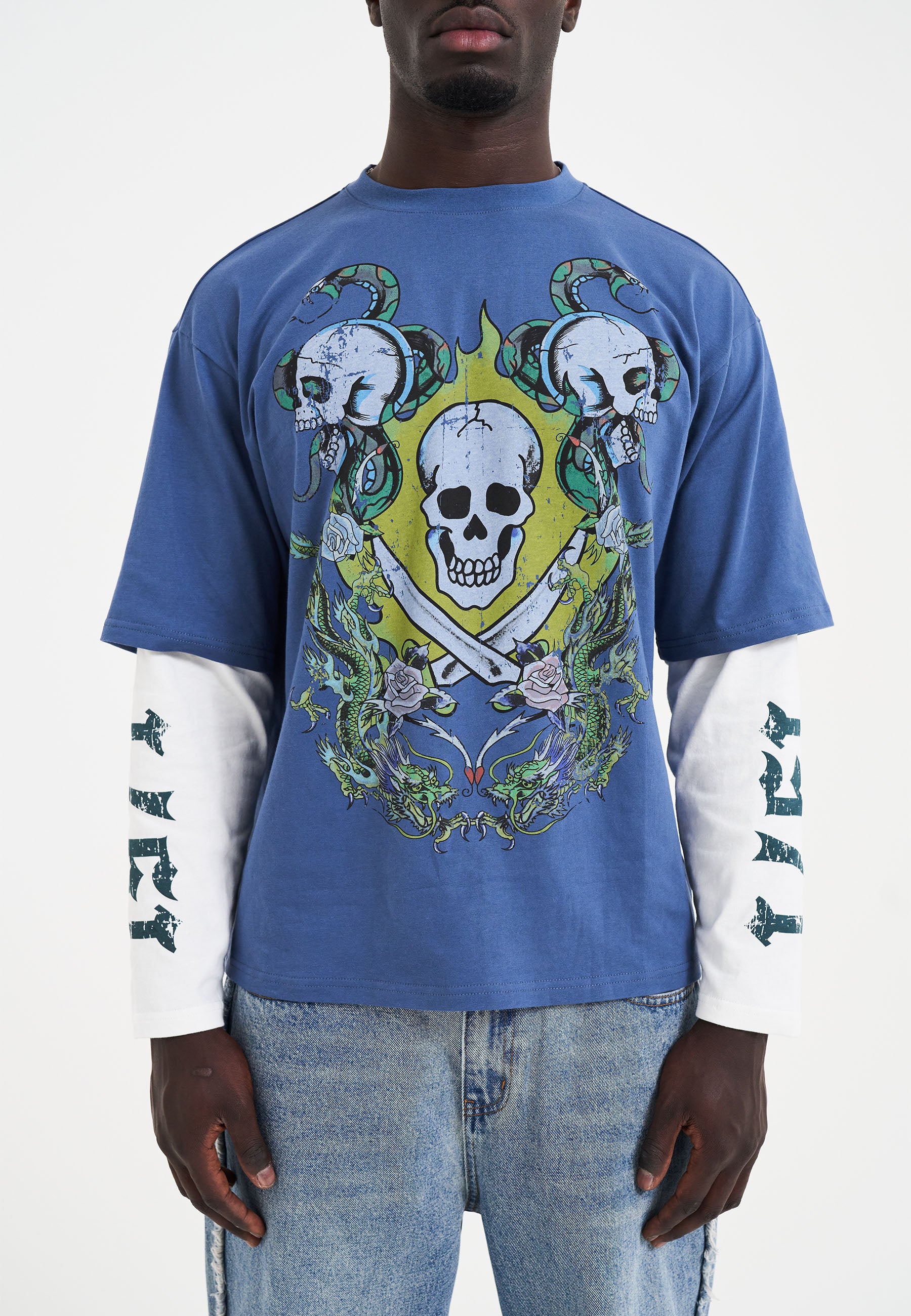 Mens Skull King Double Layer Long Sleeve Tshirt - Blue/White