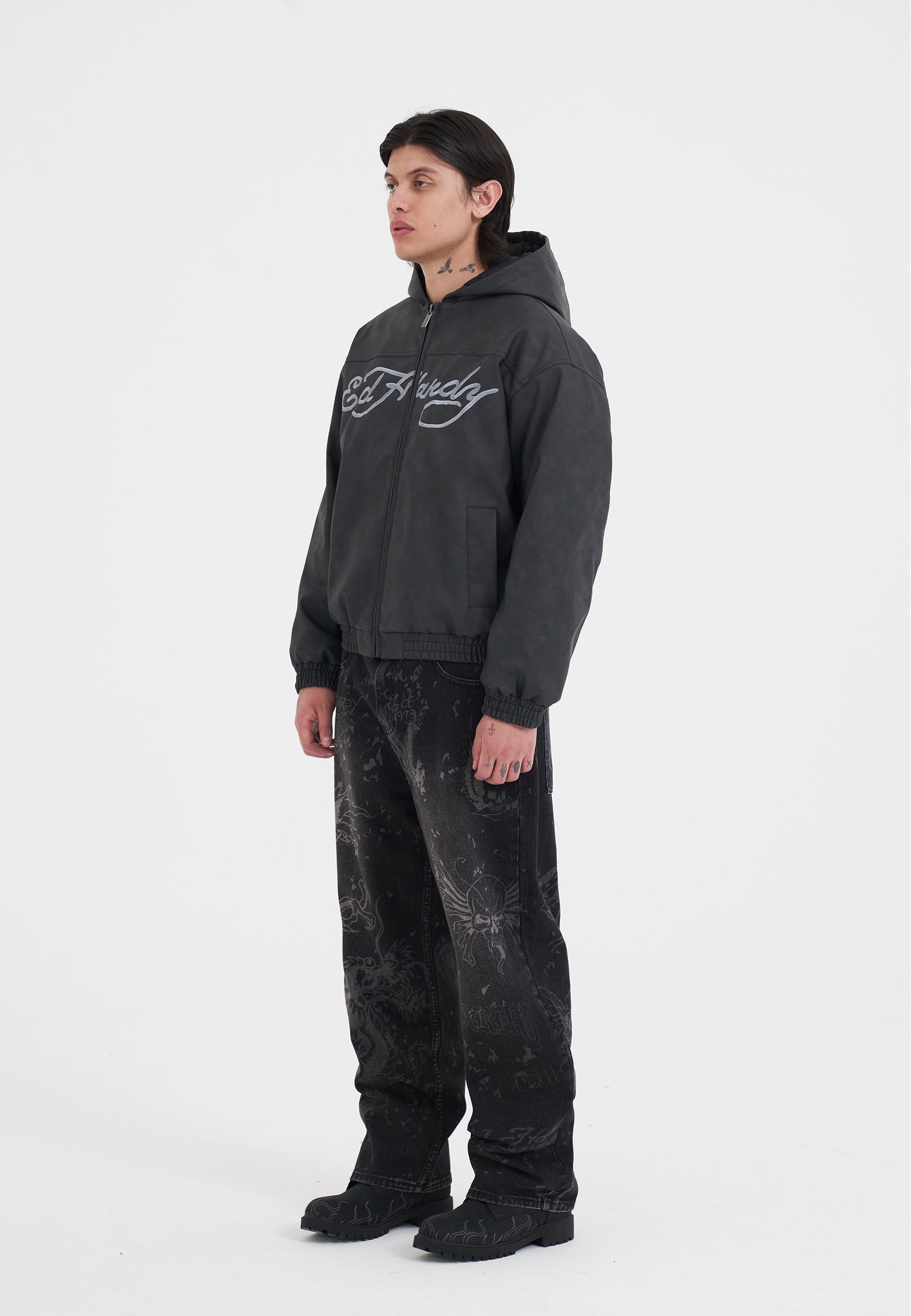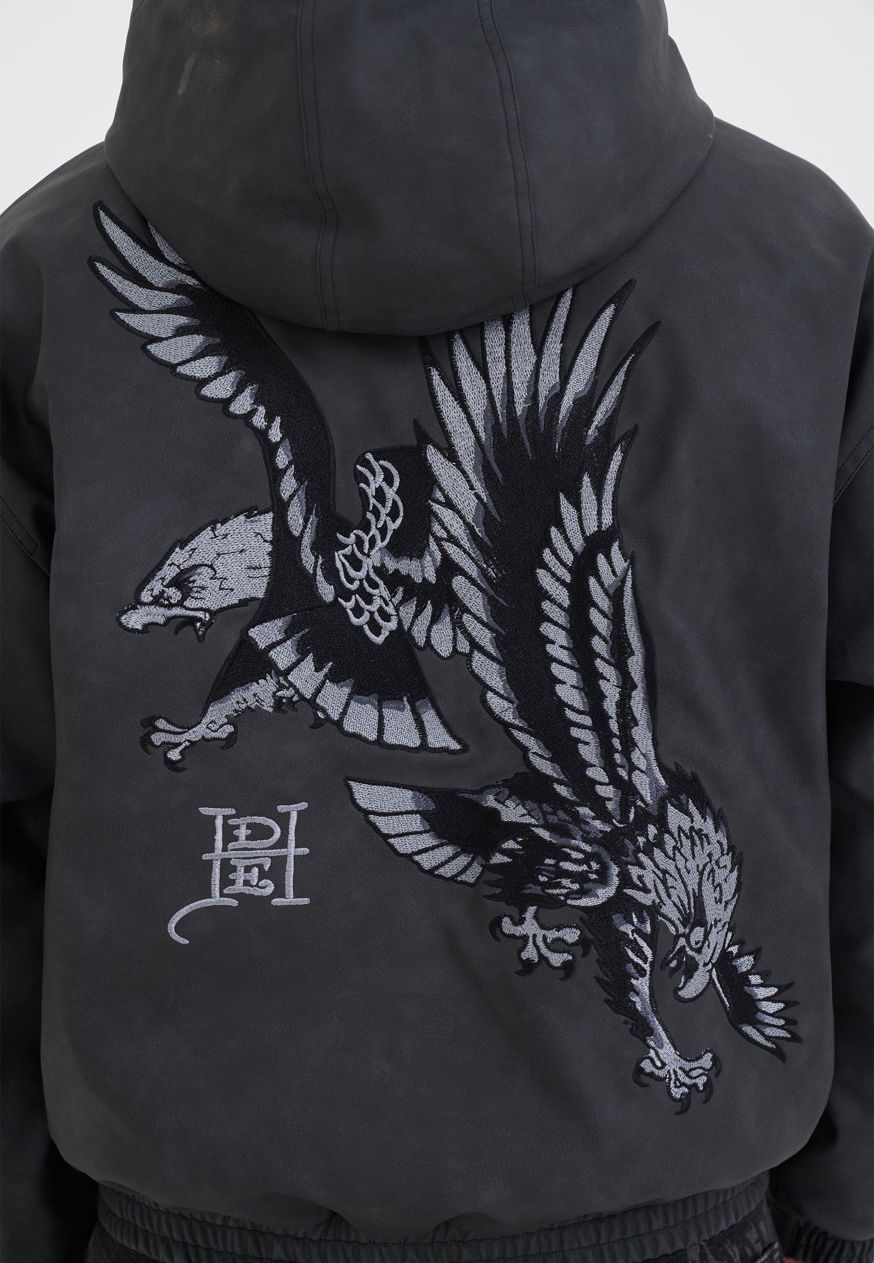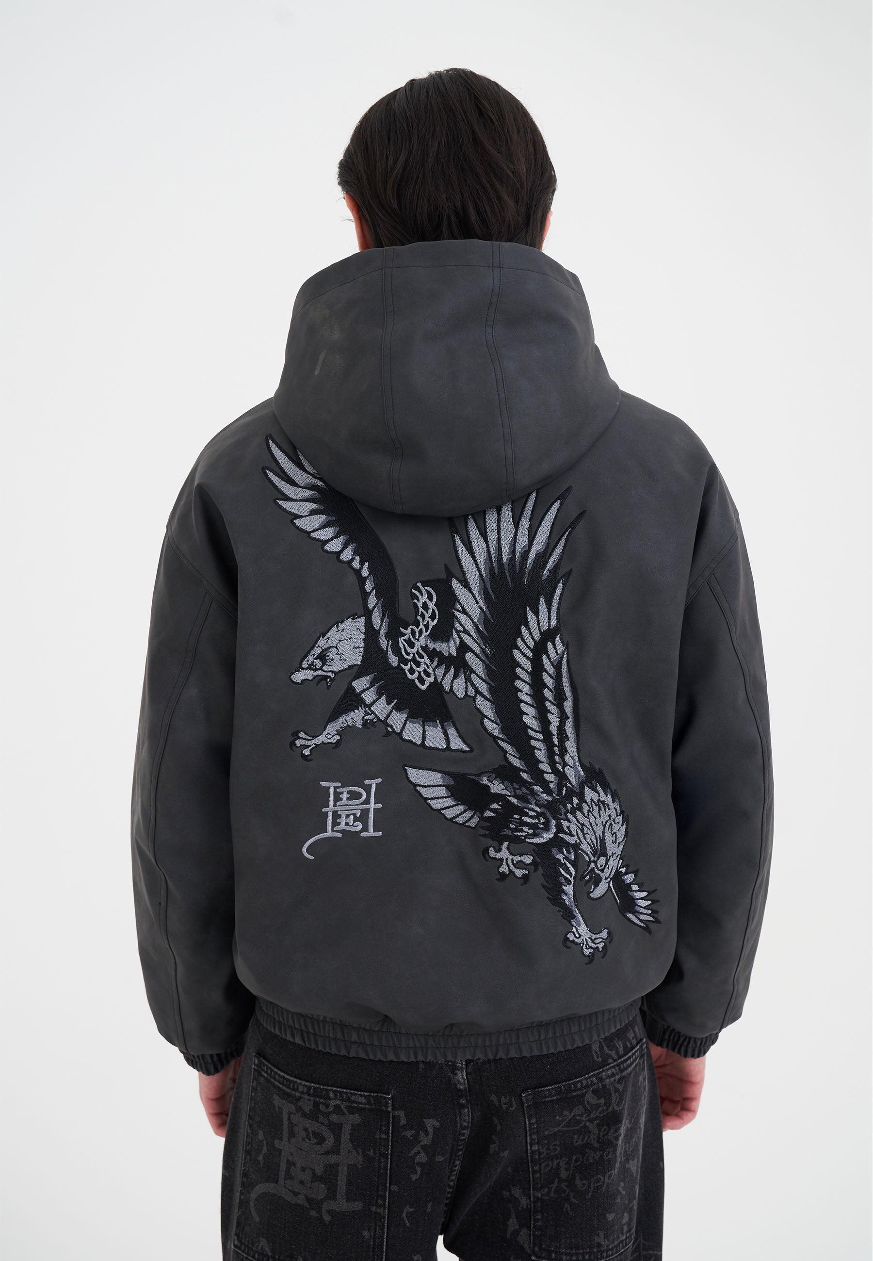 MENS SOARING EAGLES HOODED PU VEGAN LEATHER JACKET in Black