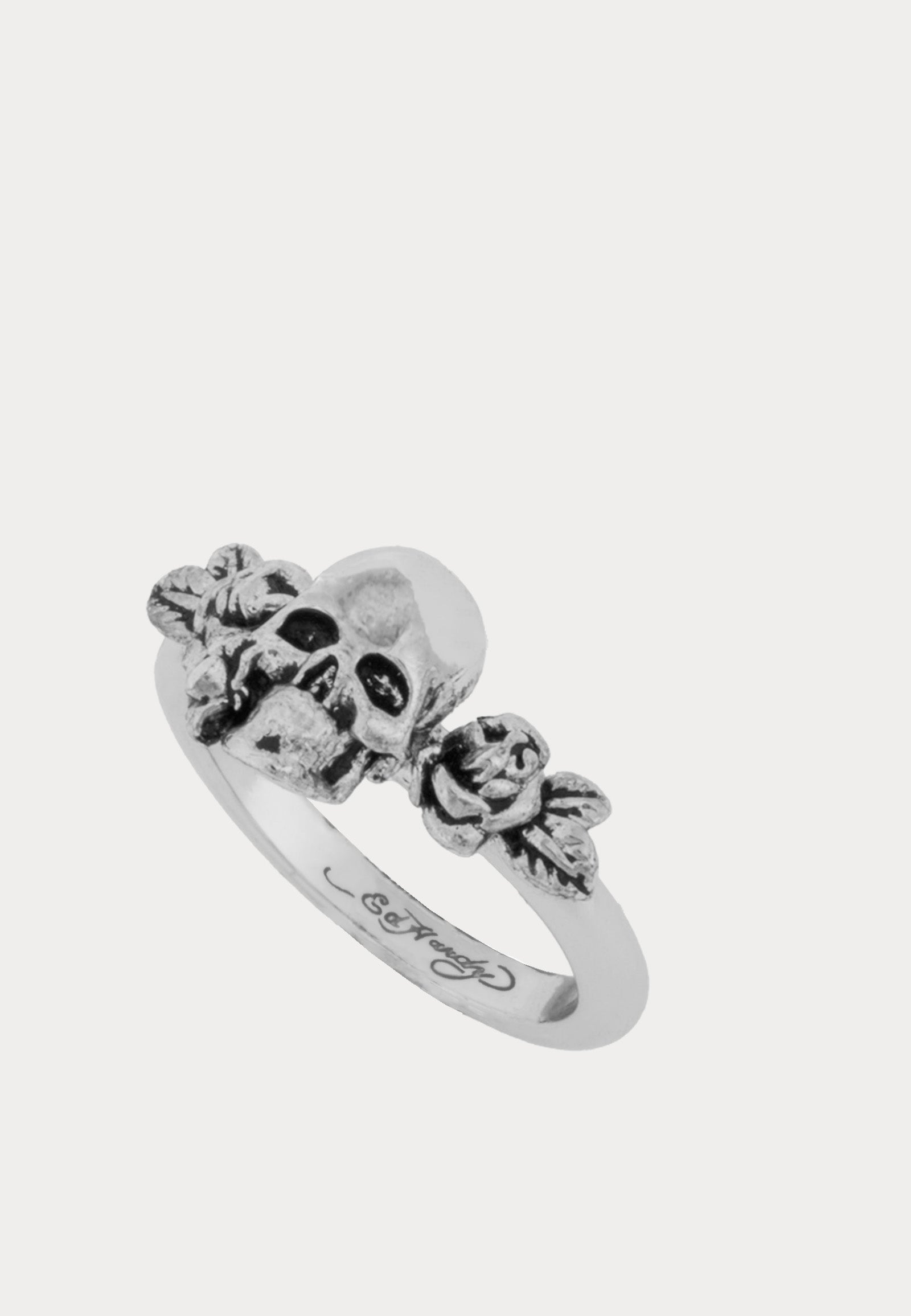Ed Hardy 5mm band ring, featuring an original and bespoke casting with the famous Don Ed Hardy tattoo skull and rose thorn design modelled into 3D relief. Hand-finished in silver plating with an antique polishing.