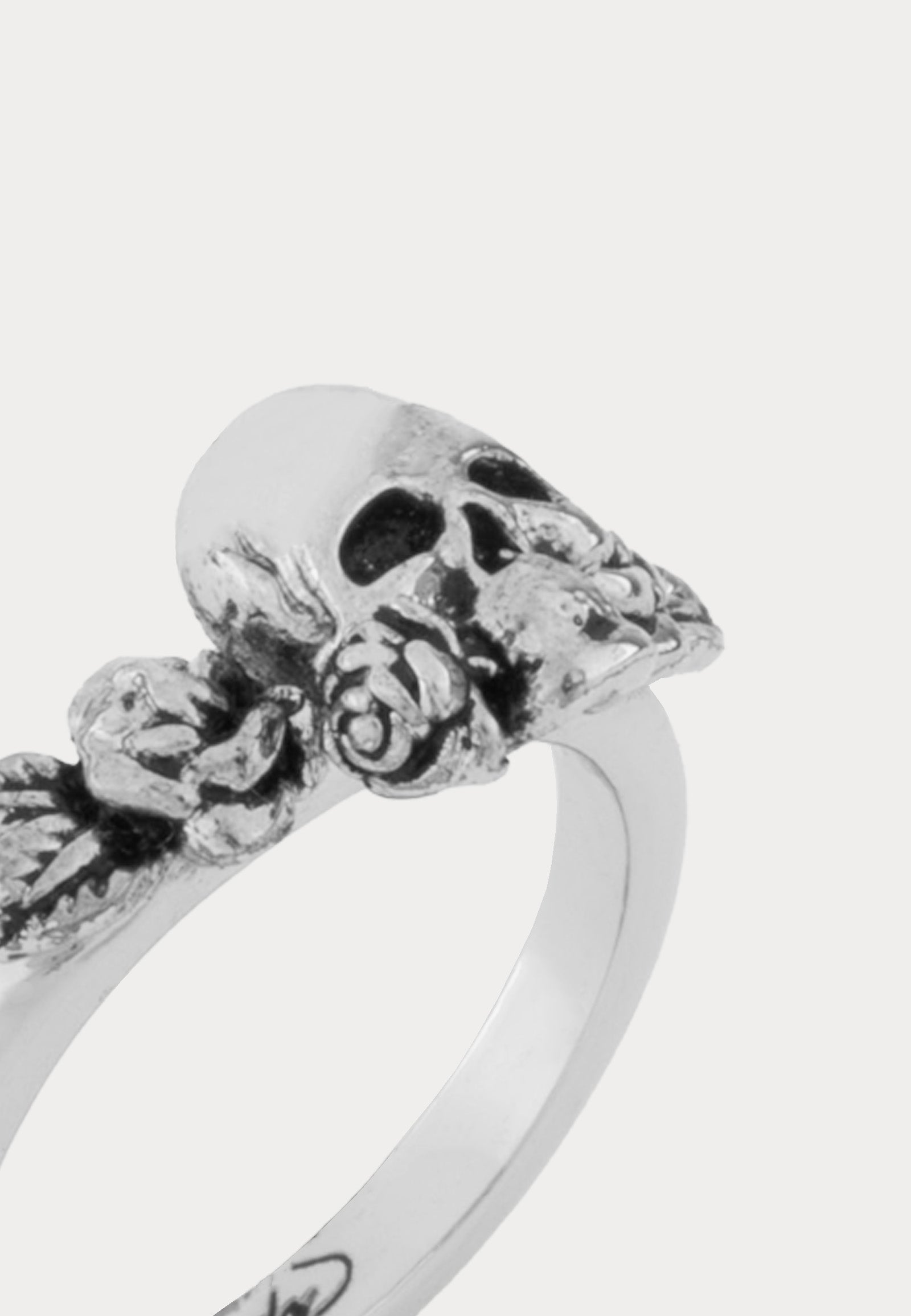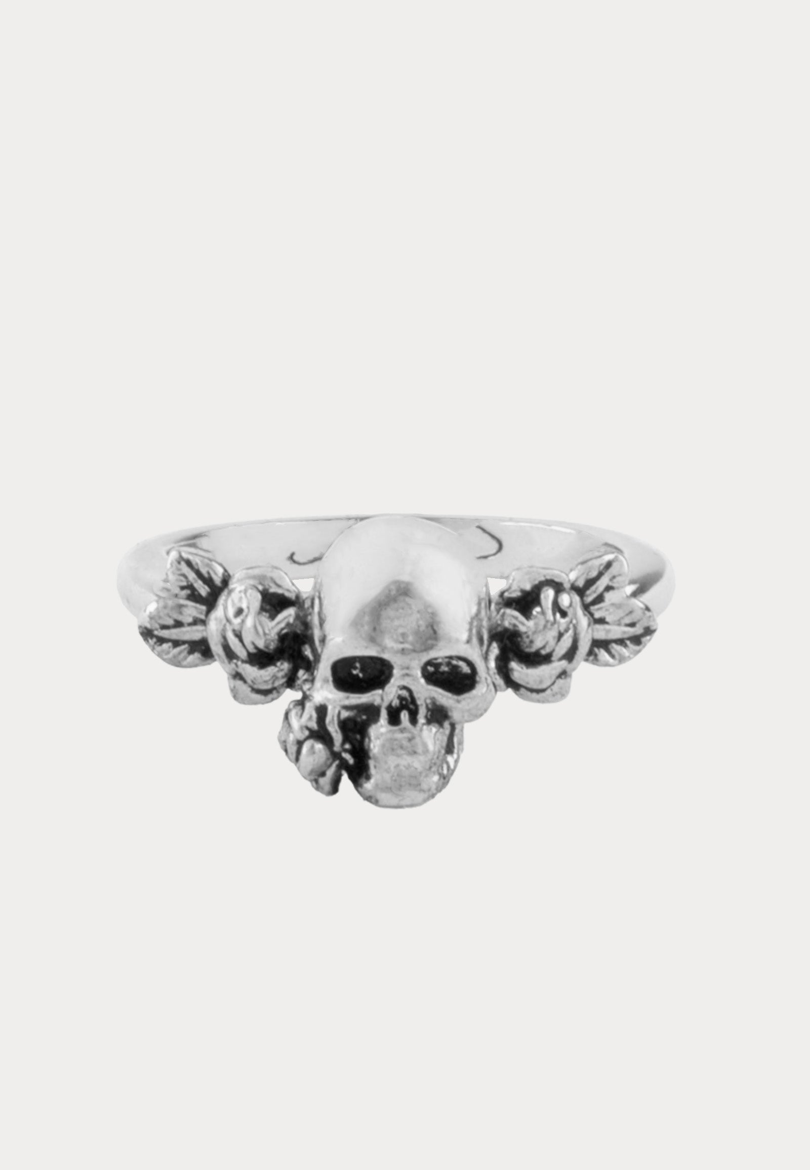 Skull & Rose Flower Custom-Cast Band Ring - Silver