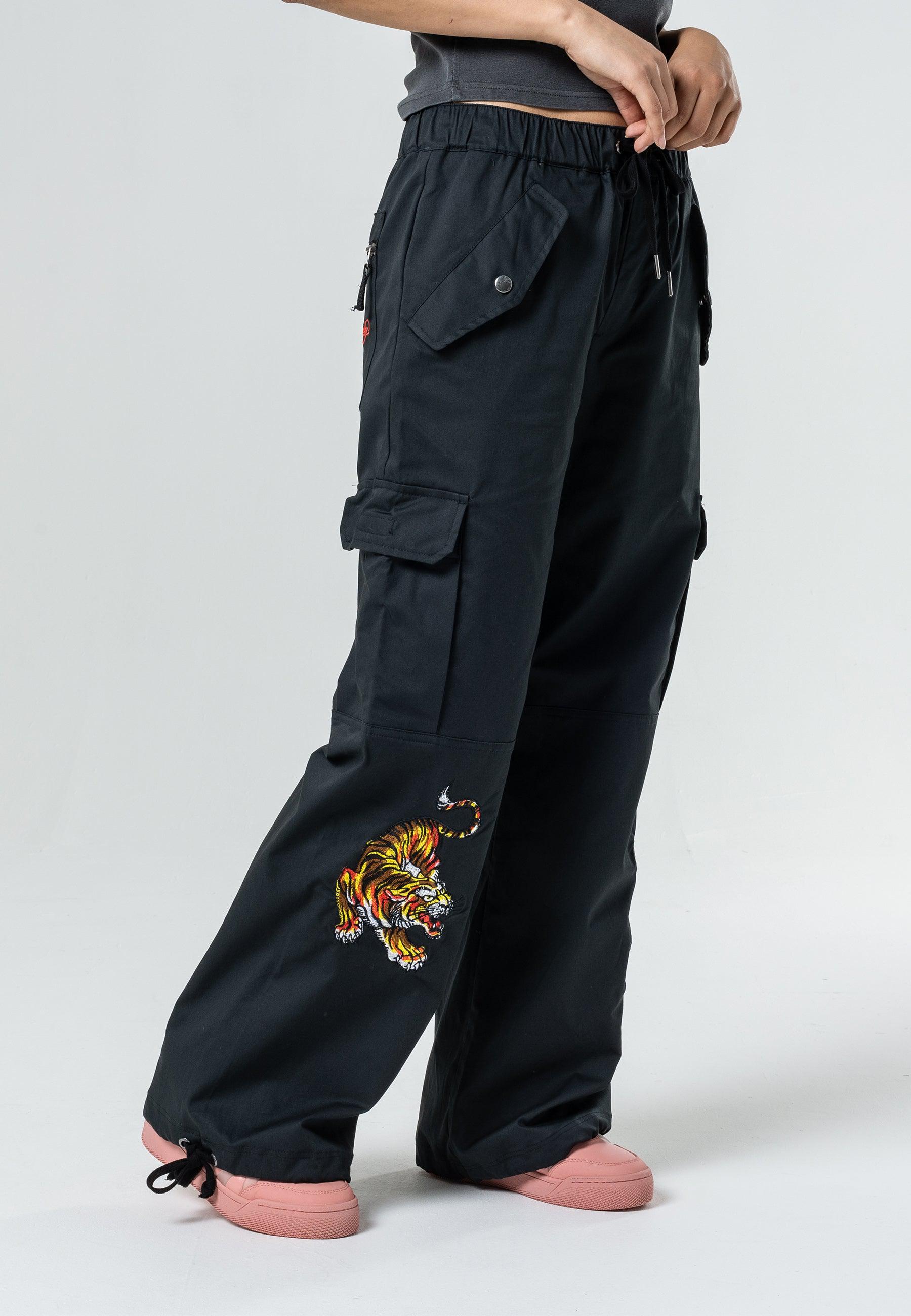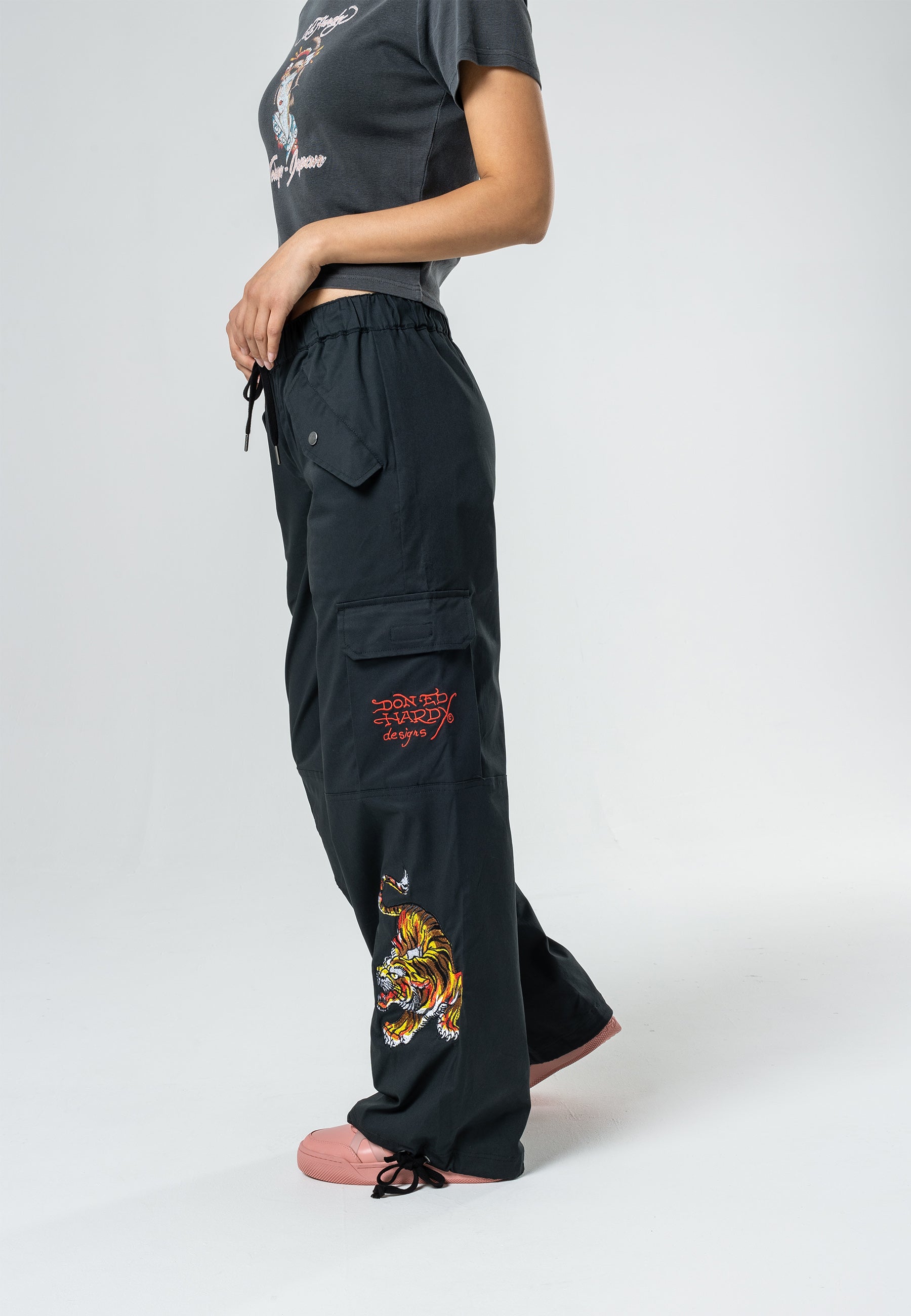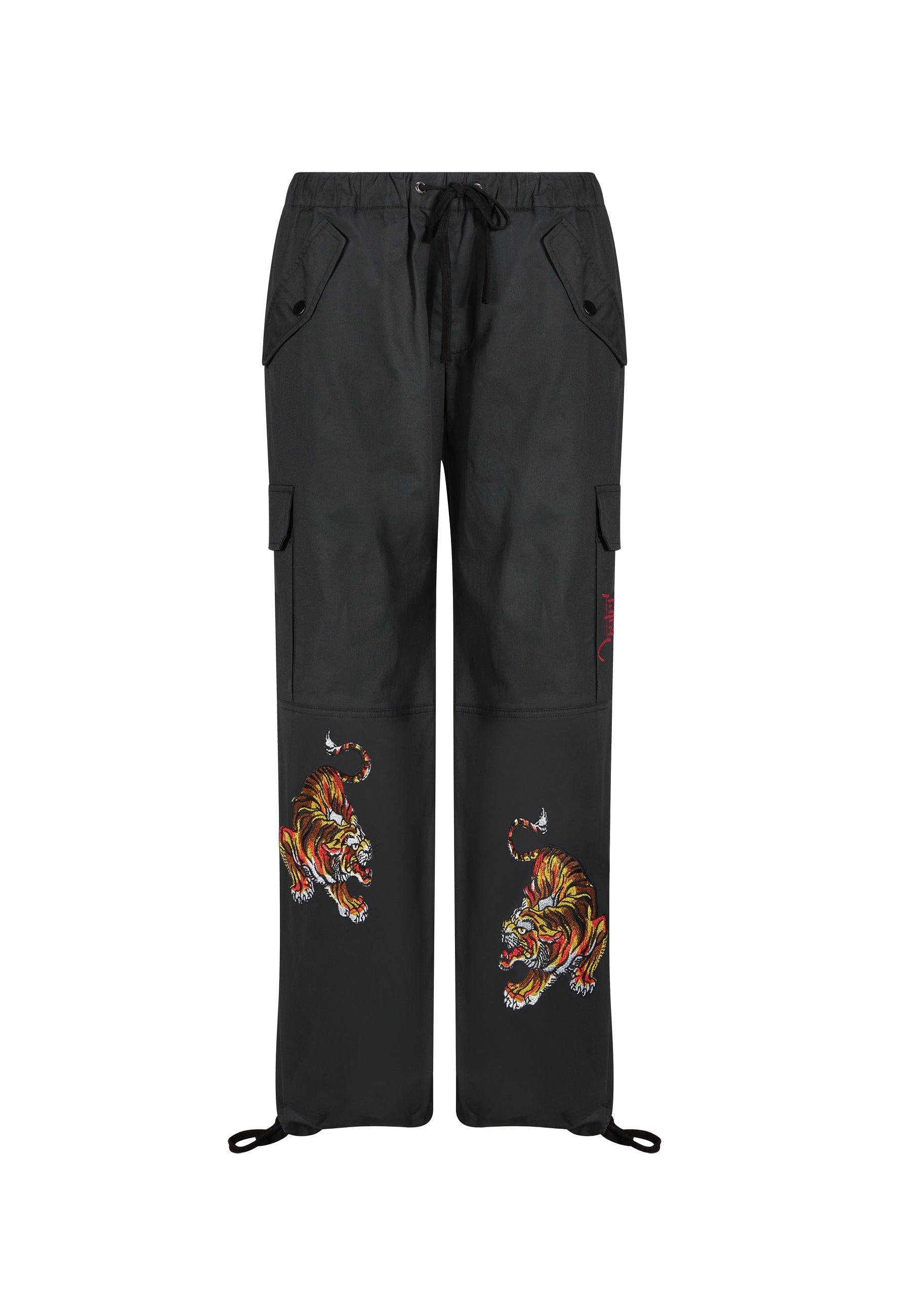 Tiger Cargo Pant-Washed Black byder på det berygtede Eds-arkiv af high-definition broderede Tigers ved både de nederste for-/sideben samt det broderede Ed Hardy-logo på baglomme med lynlås og venstre sidelomme. Disse komfortable laster er perfekte til chill, dag og nat vibes.