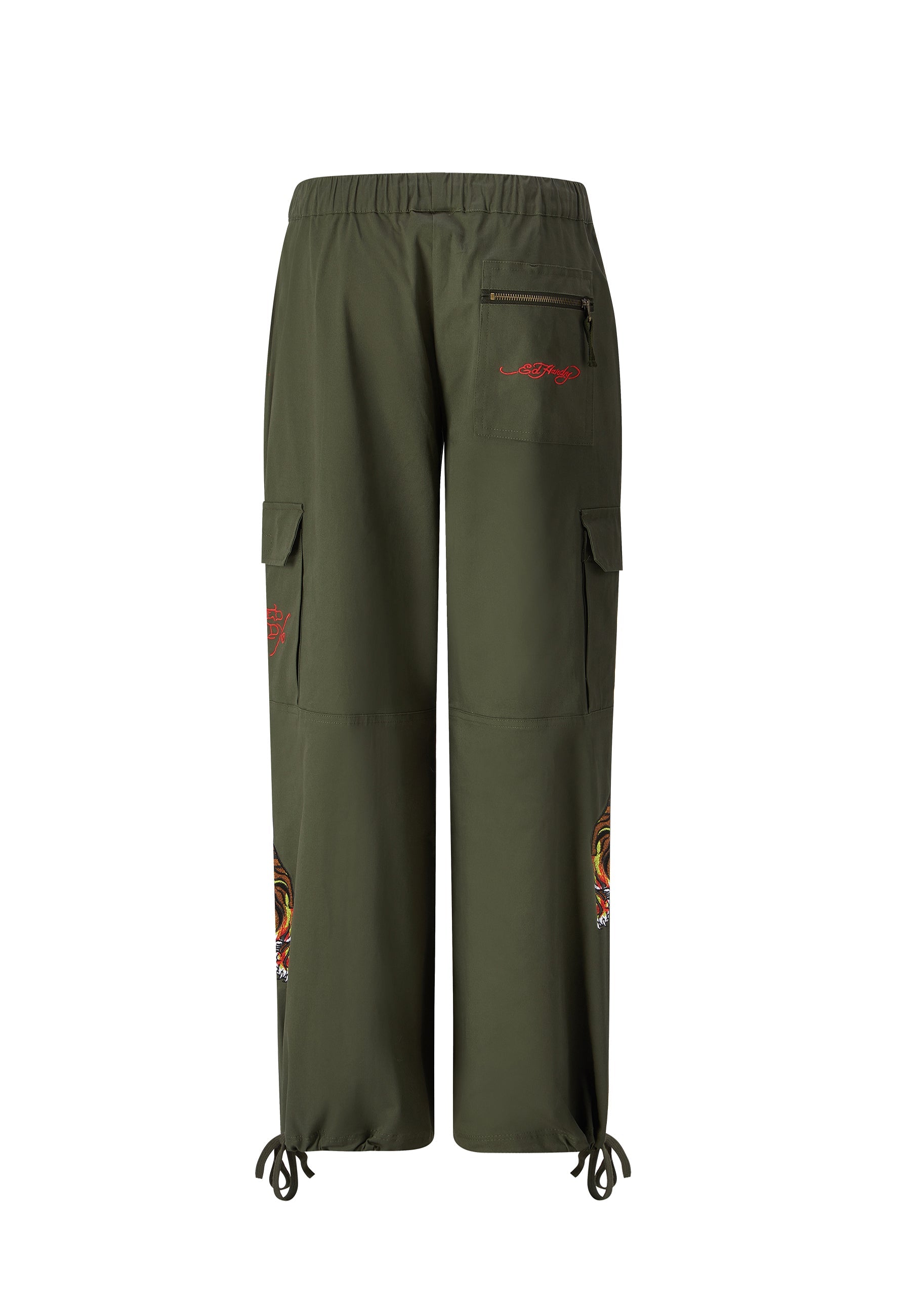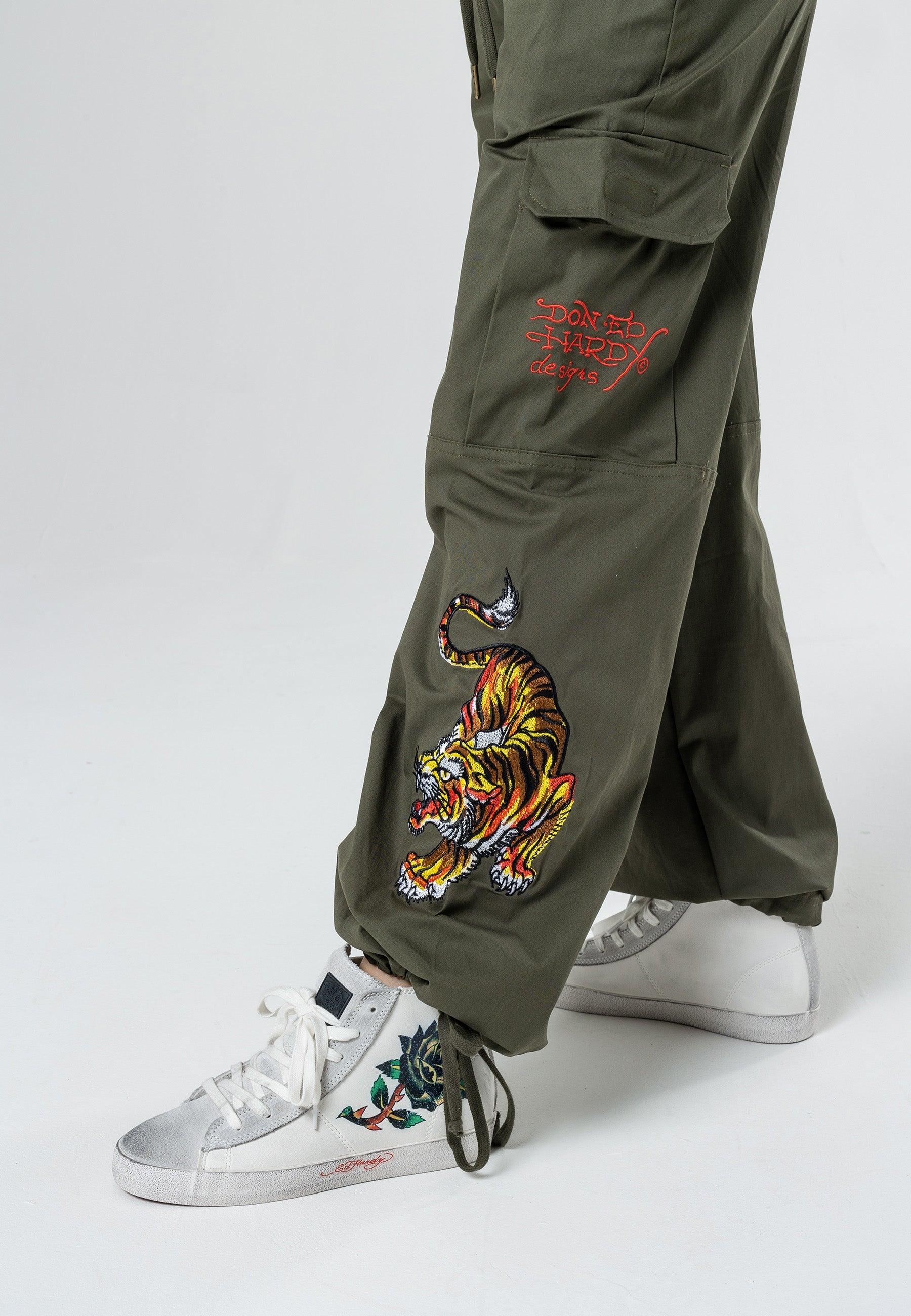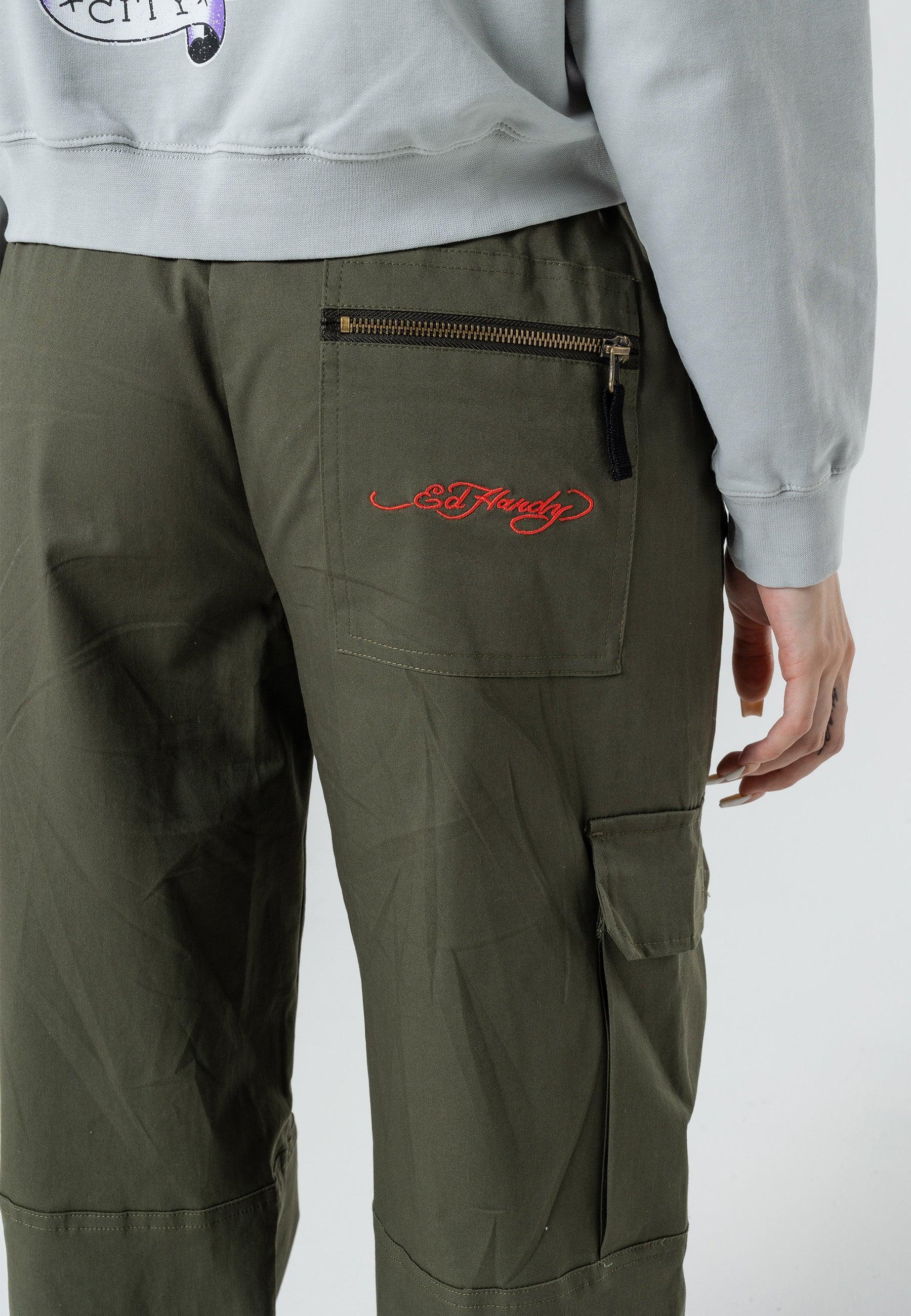 Tiger Cargo Pant-Dusty Olive byder på det berygtede Eds-arkiv af high-definition broderede Tigers ved både de nederste for-/sideben samt det broderede Ed Hardy-logo på baglomme med lynlås og venstre sidelomme. Disse behagelige laster er perfekte til afkøling, dag- og natstemning.