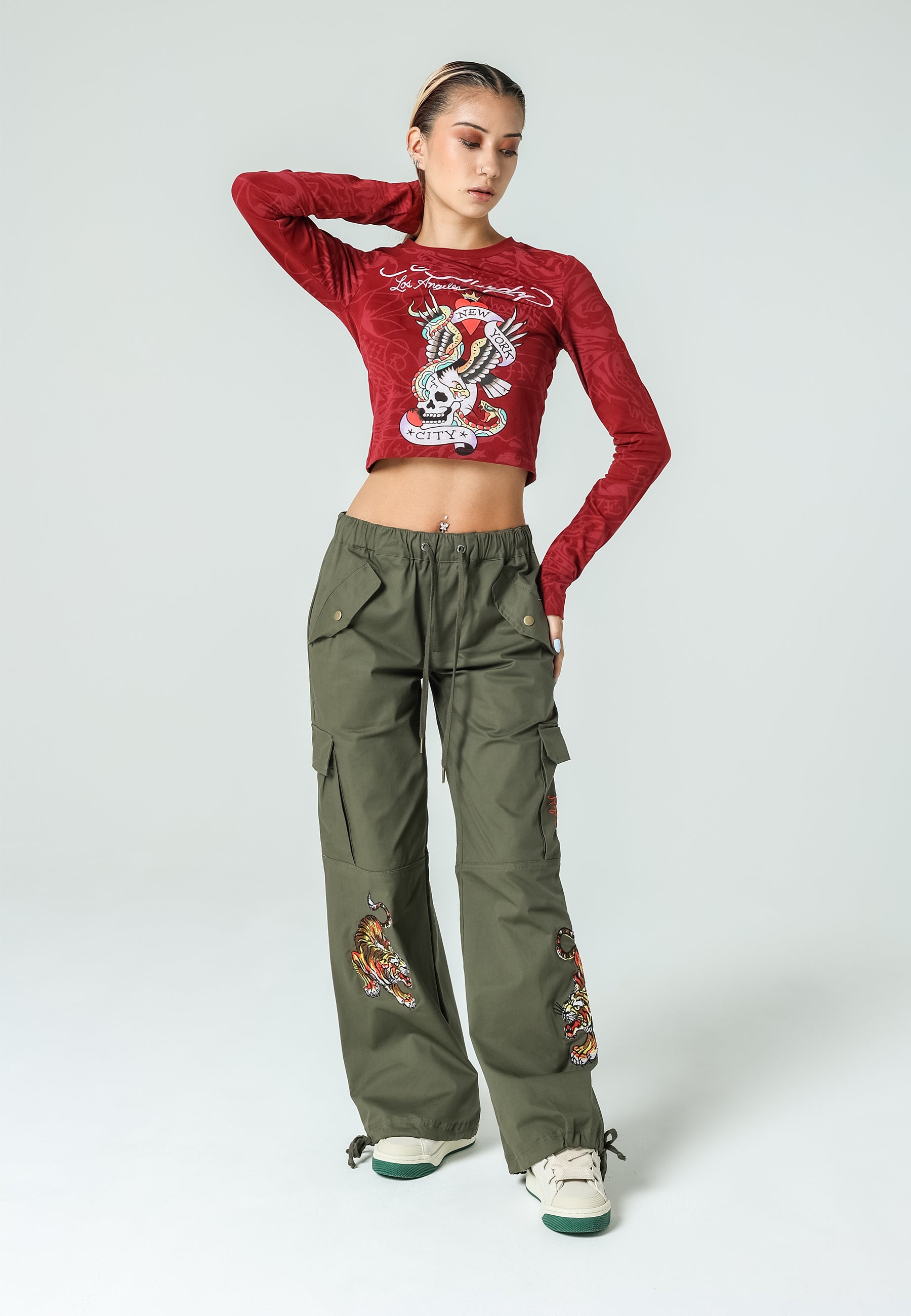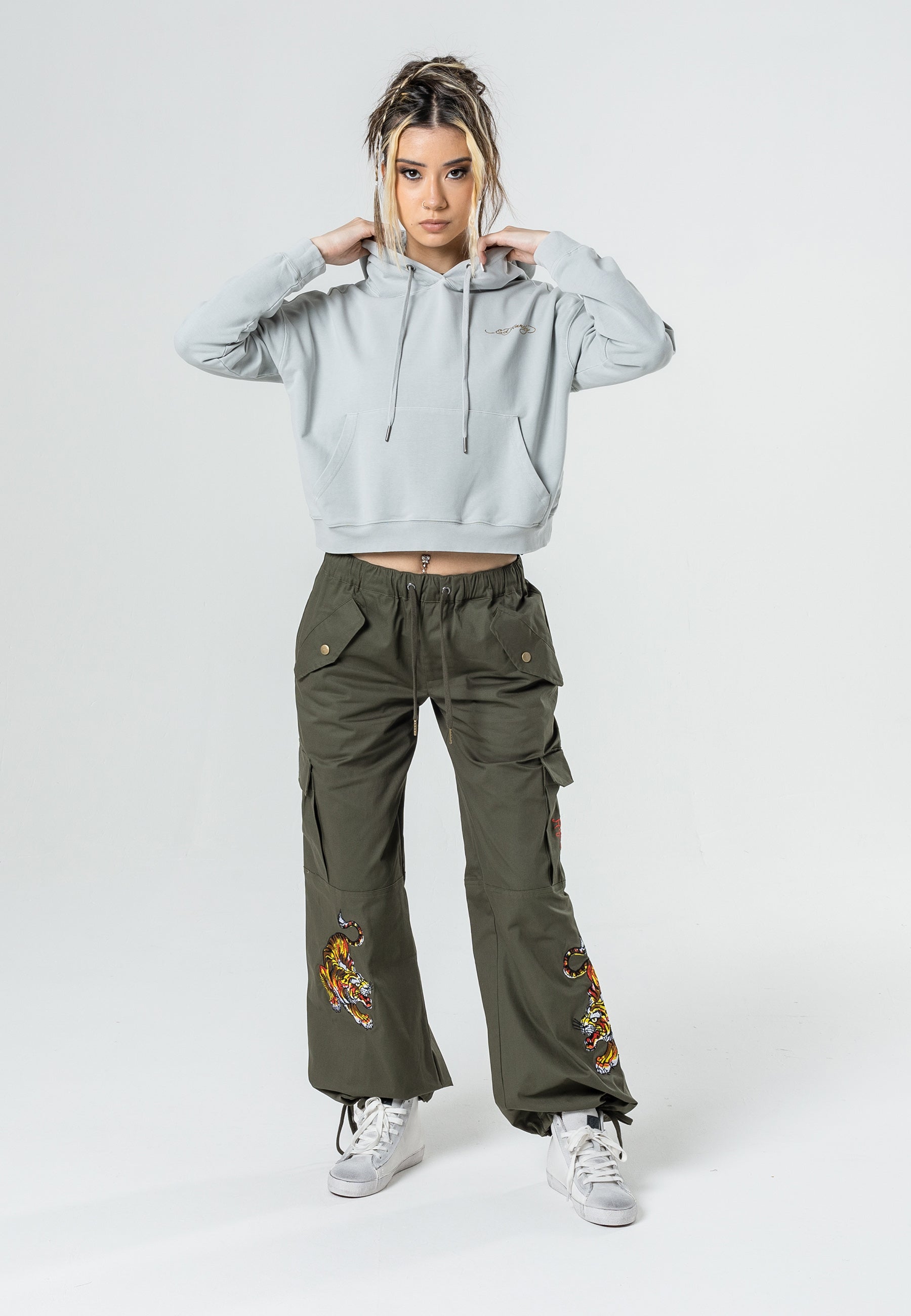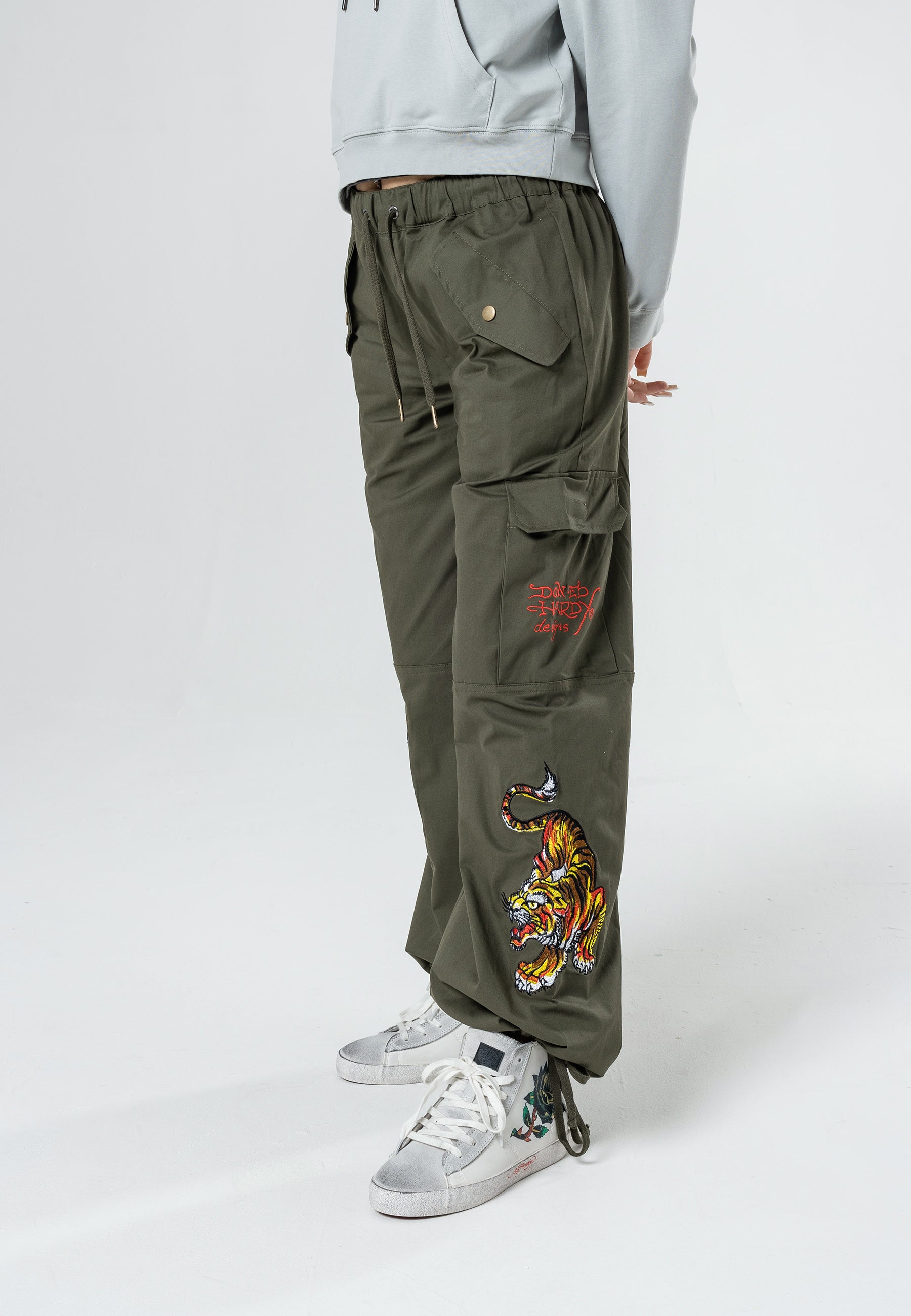 Tiger Cargo Pant-Dusty Olive byder på det berygtede Eds-arkiv af high-definition broderede Tigers ved både de nederste for-/sideben samt det broderede Ed Hardy-logo på baglomme med lynlås og venstre sidelomme. Disse behagelige laster er perfekte til afkøling, dag- og natstemning.