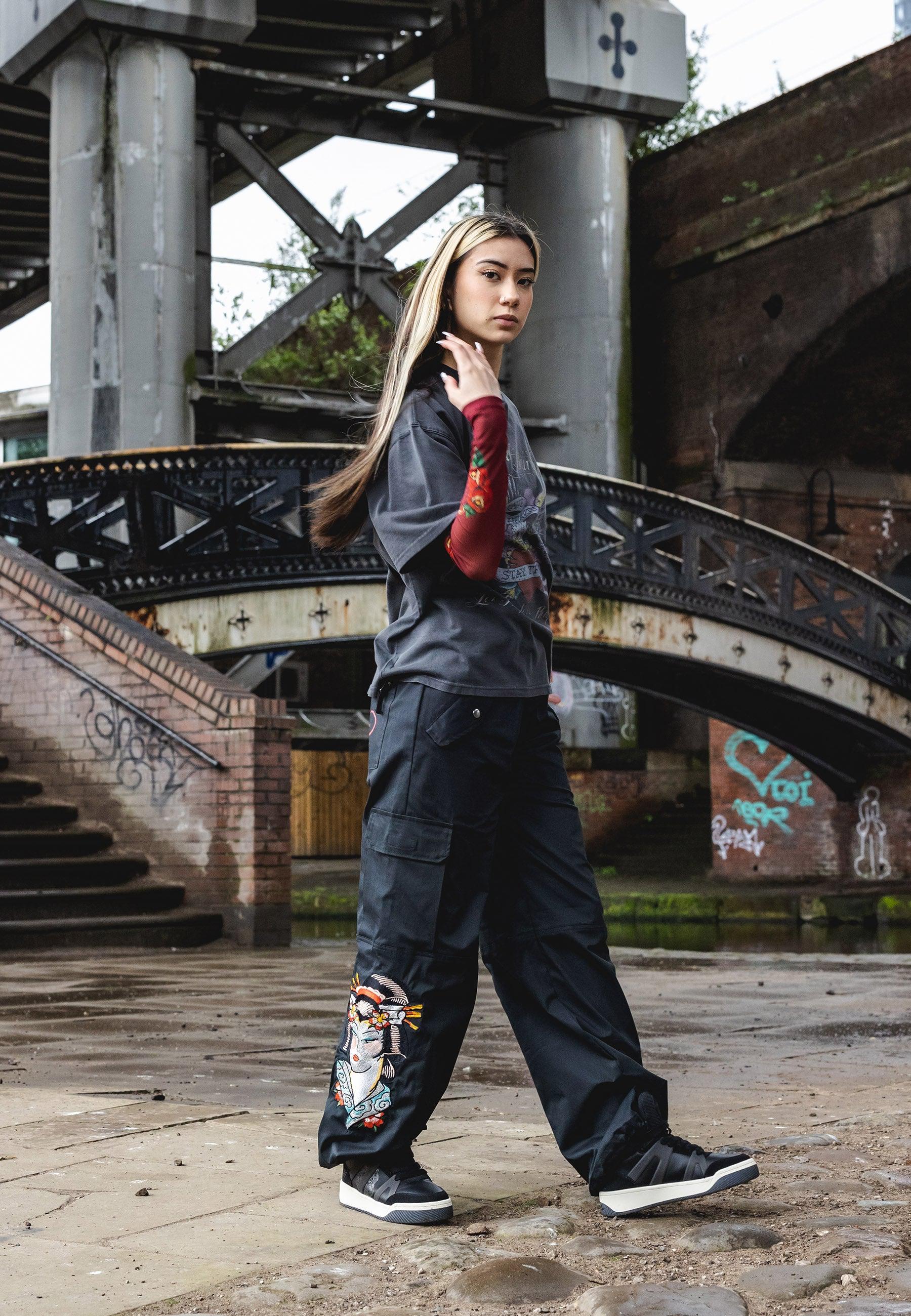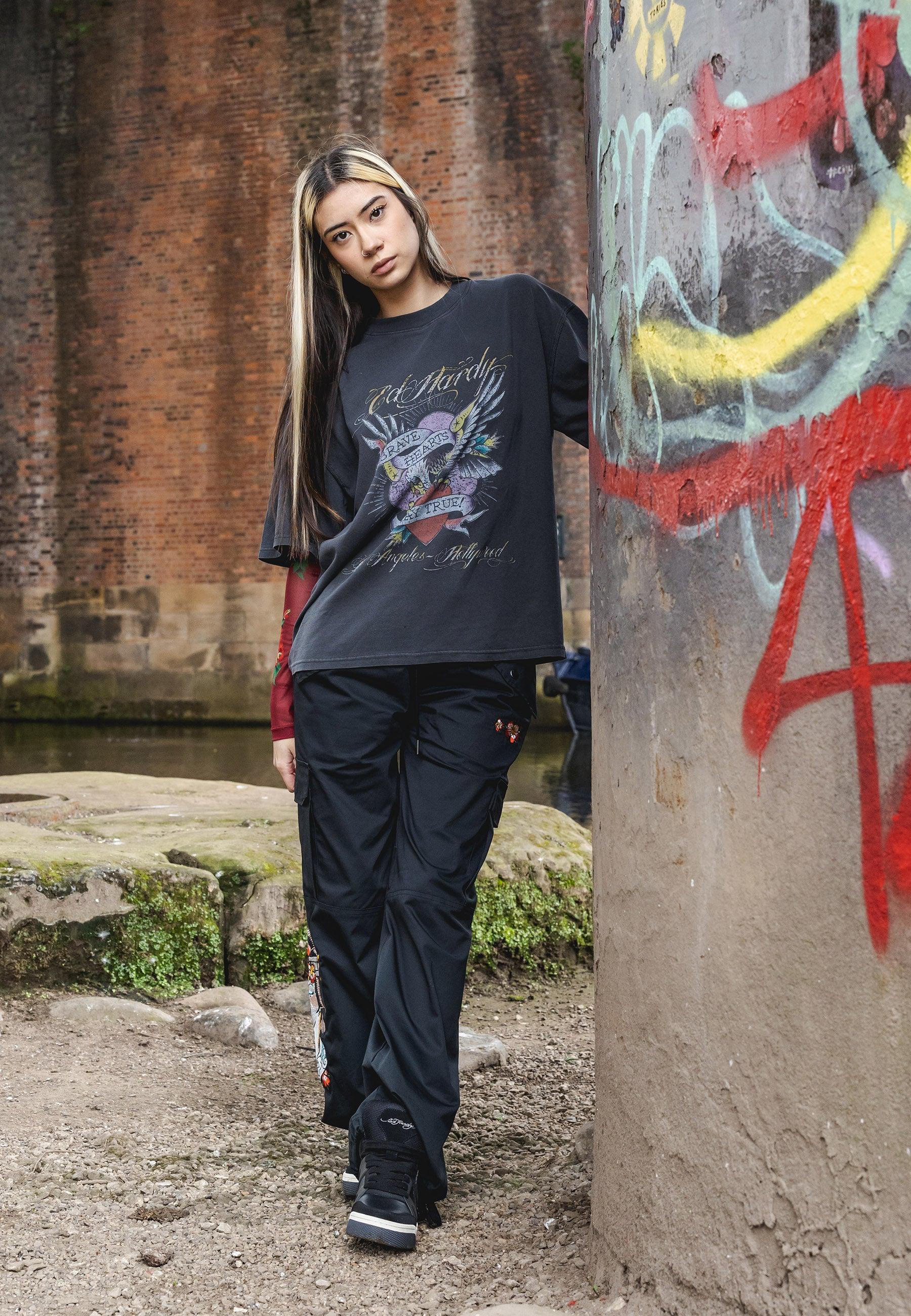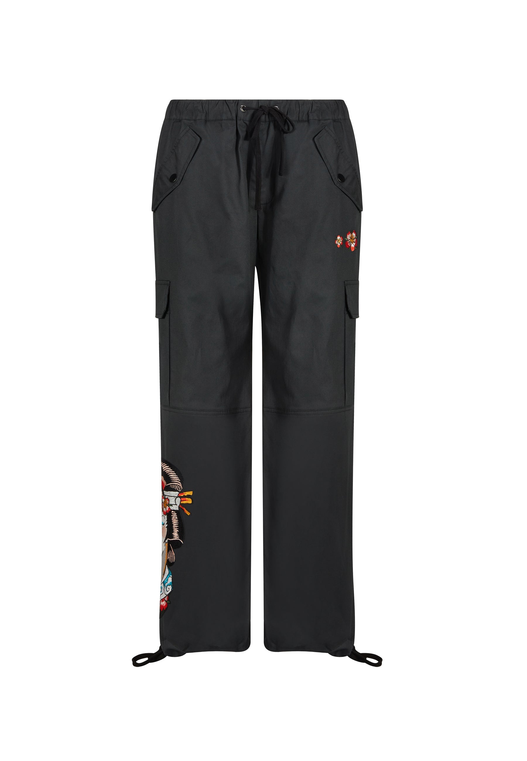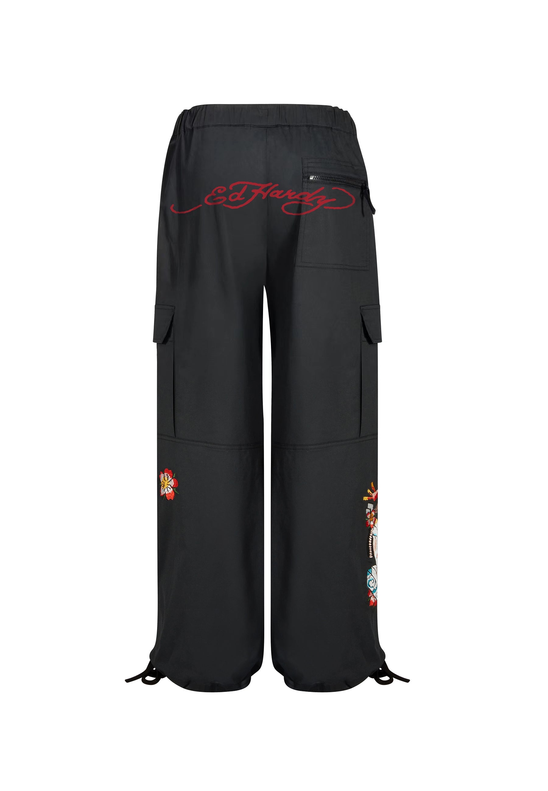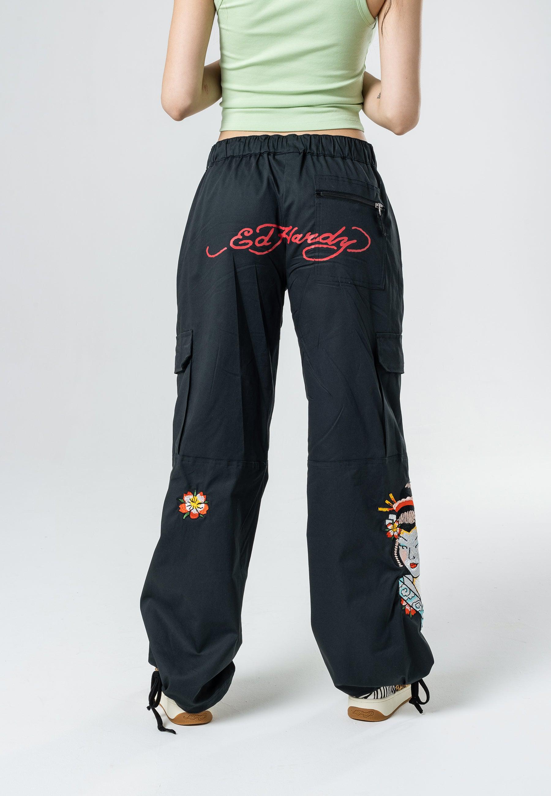 Tokyo Geisha Cargo Pant-Washed Black har det berygtede Eds-arkiv af high-definition broderet Geisha ved højre nederste for-/sideben, broderet venstre ben bagpå samt et trykt Ed Hardy-logo, der går hen over lynlåslommen på bagsiden. Disse komfortable laster er perfekte til chill, dag og nat vibes.