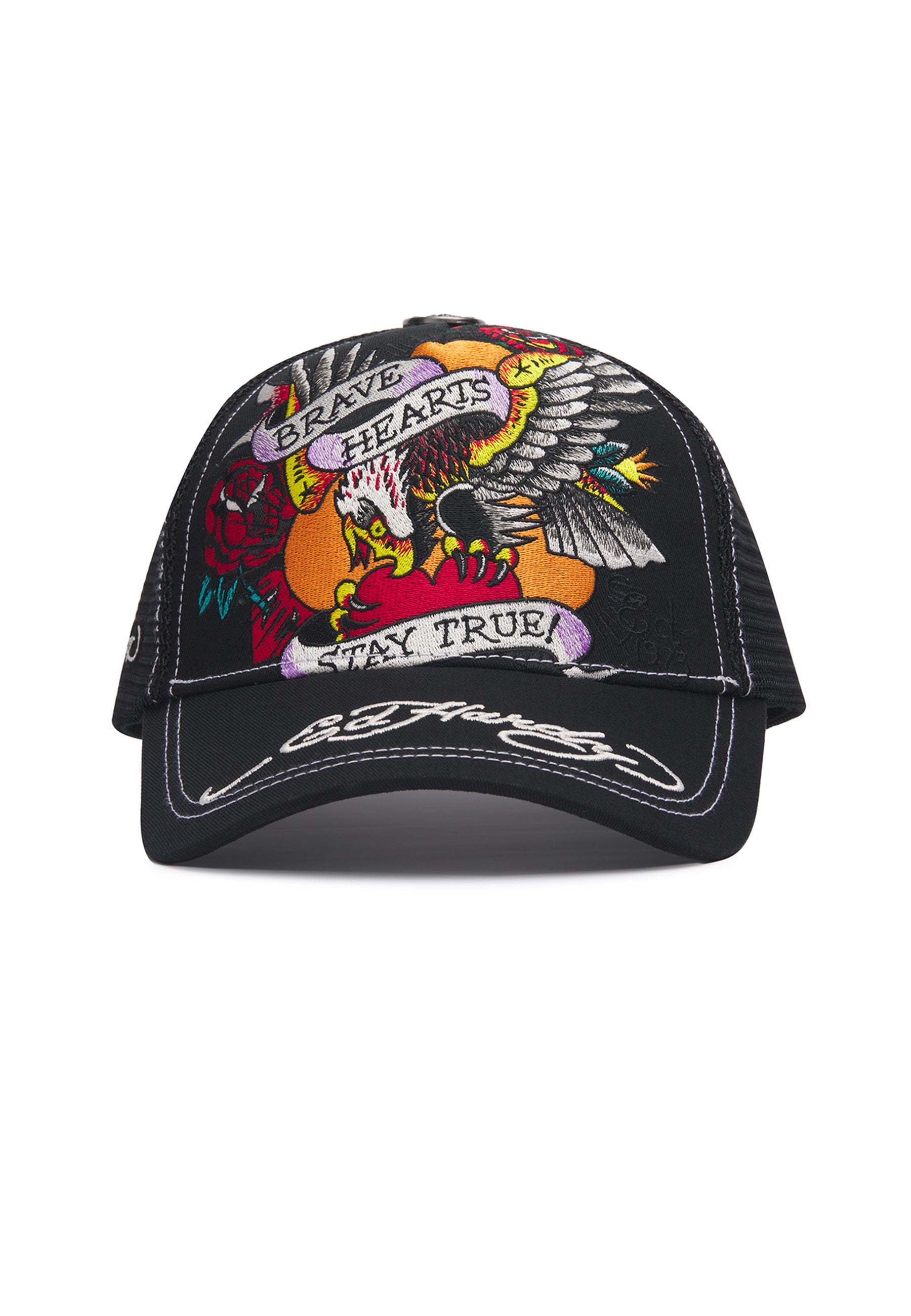 Unisex Brave Hearts Contrast Stitch 5 Panel Trucker Cap in Black/White