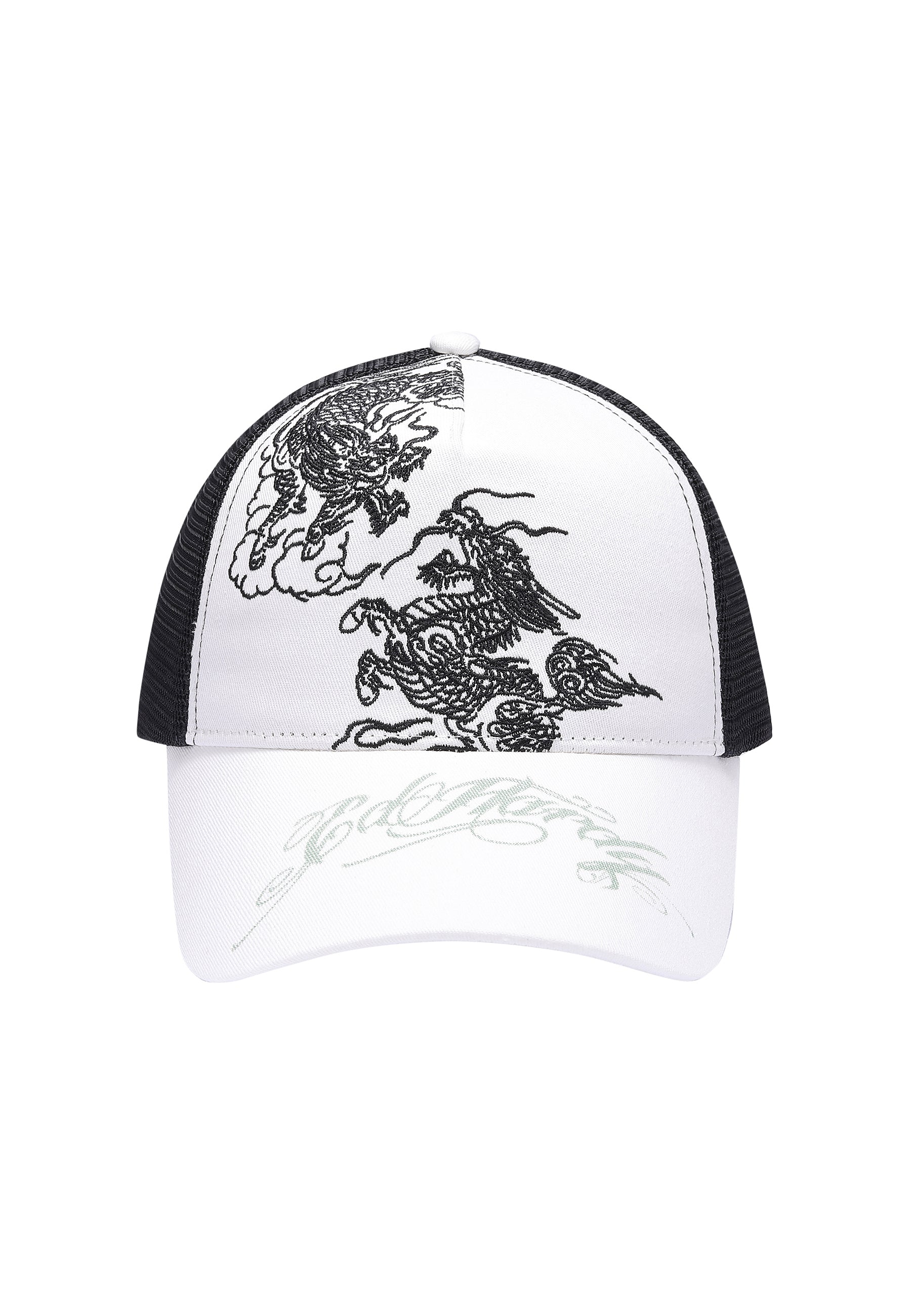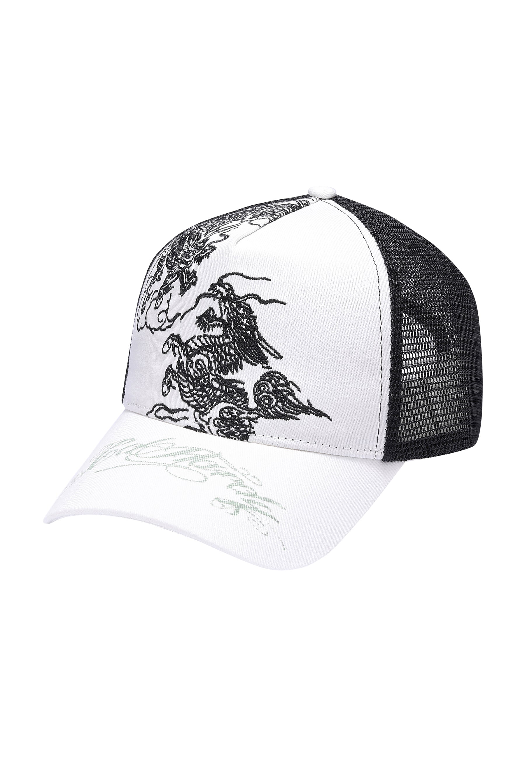 Featuring bold monotone battle dragon embroidery and a classic contrast Ed Hardy script logo on the peak.