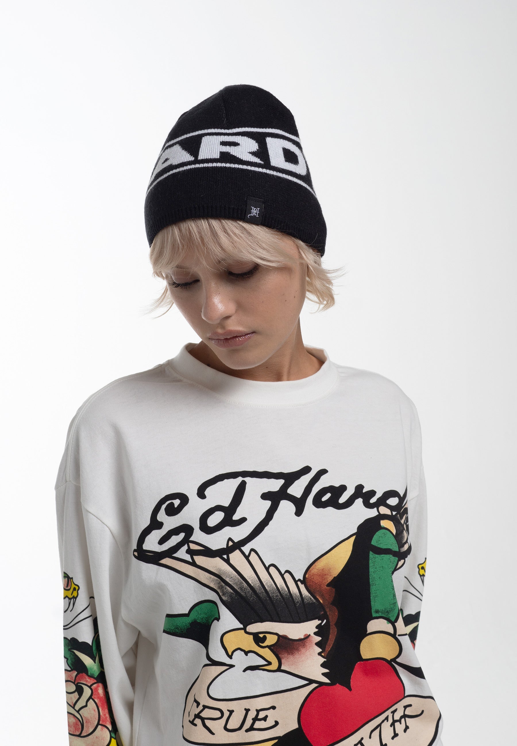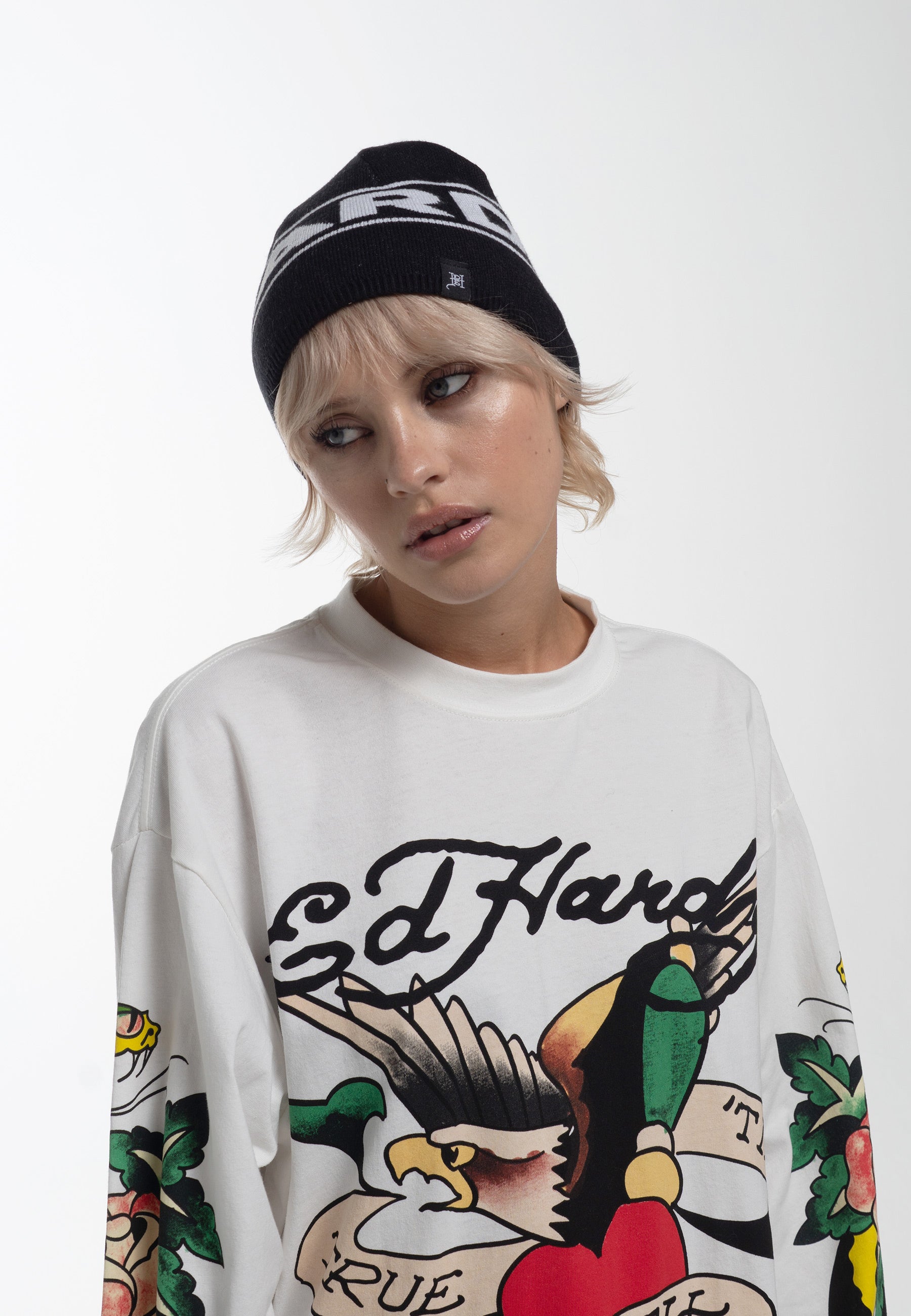 - Indeholder en vævet flagetiket med Ed Hardy-monogramlogoet langs manchetten