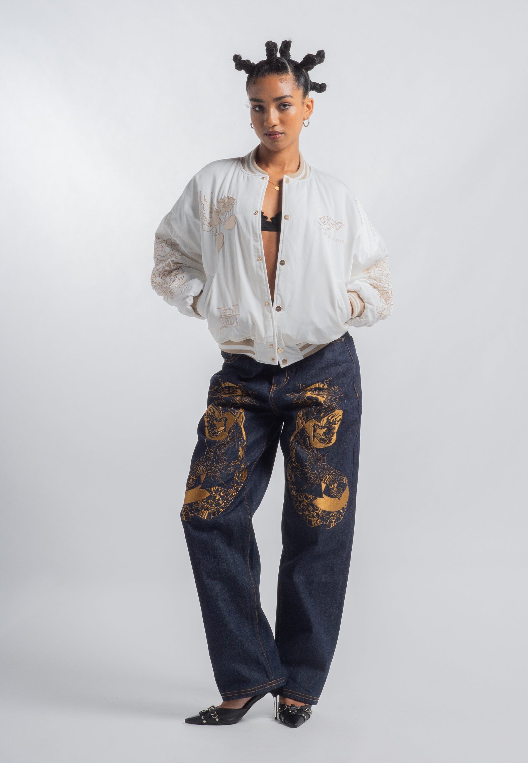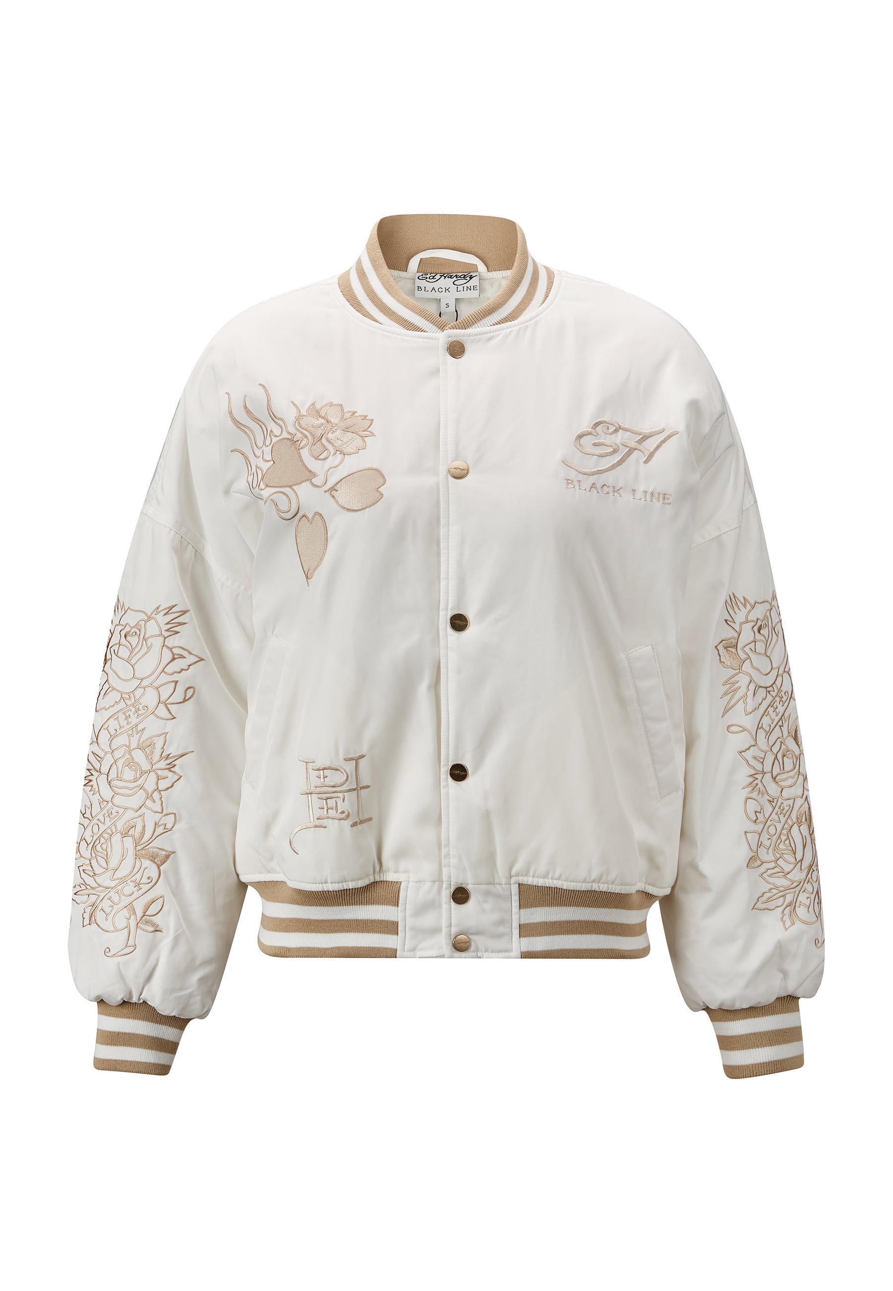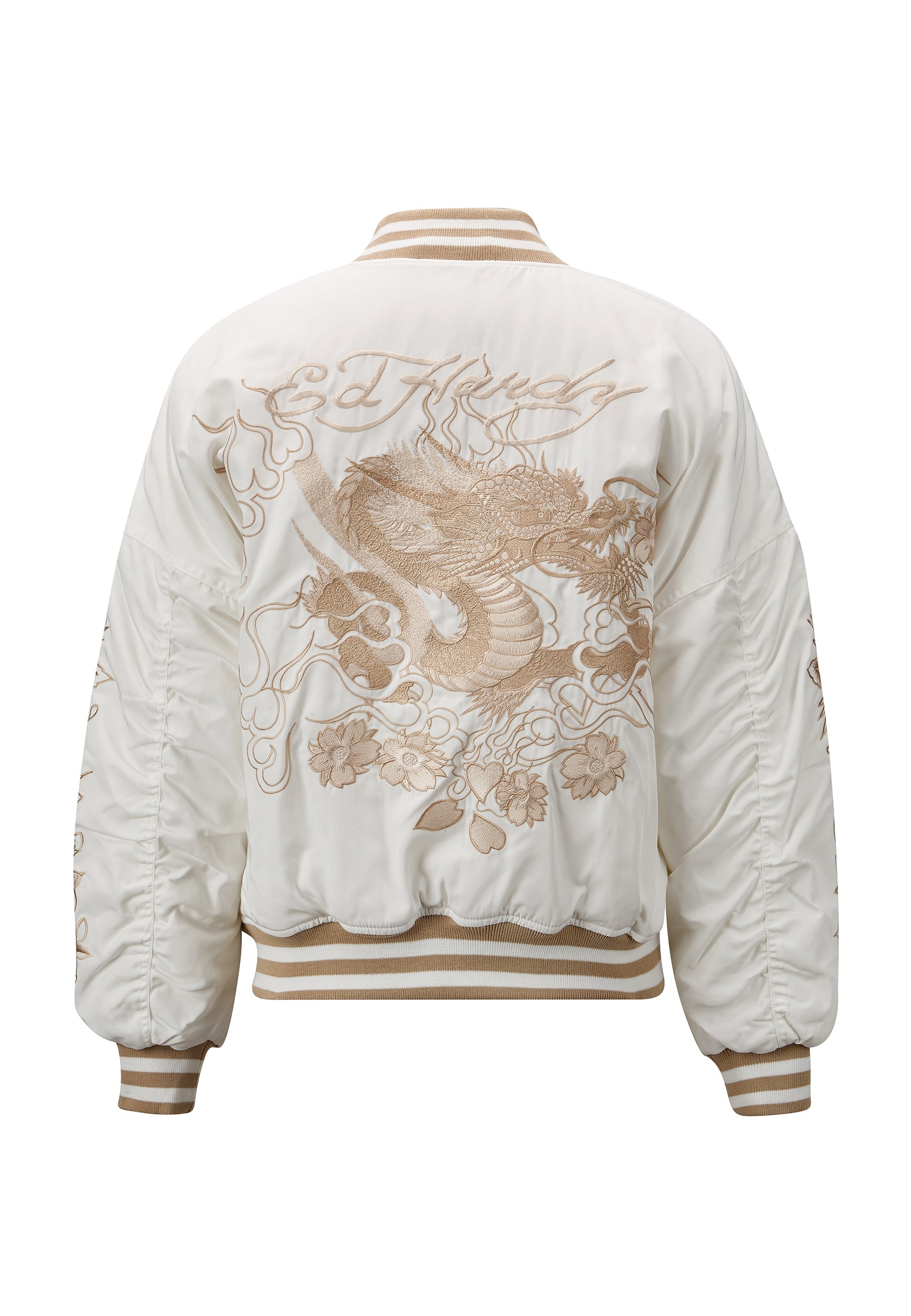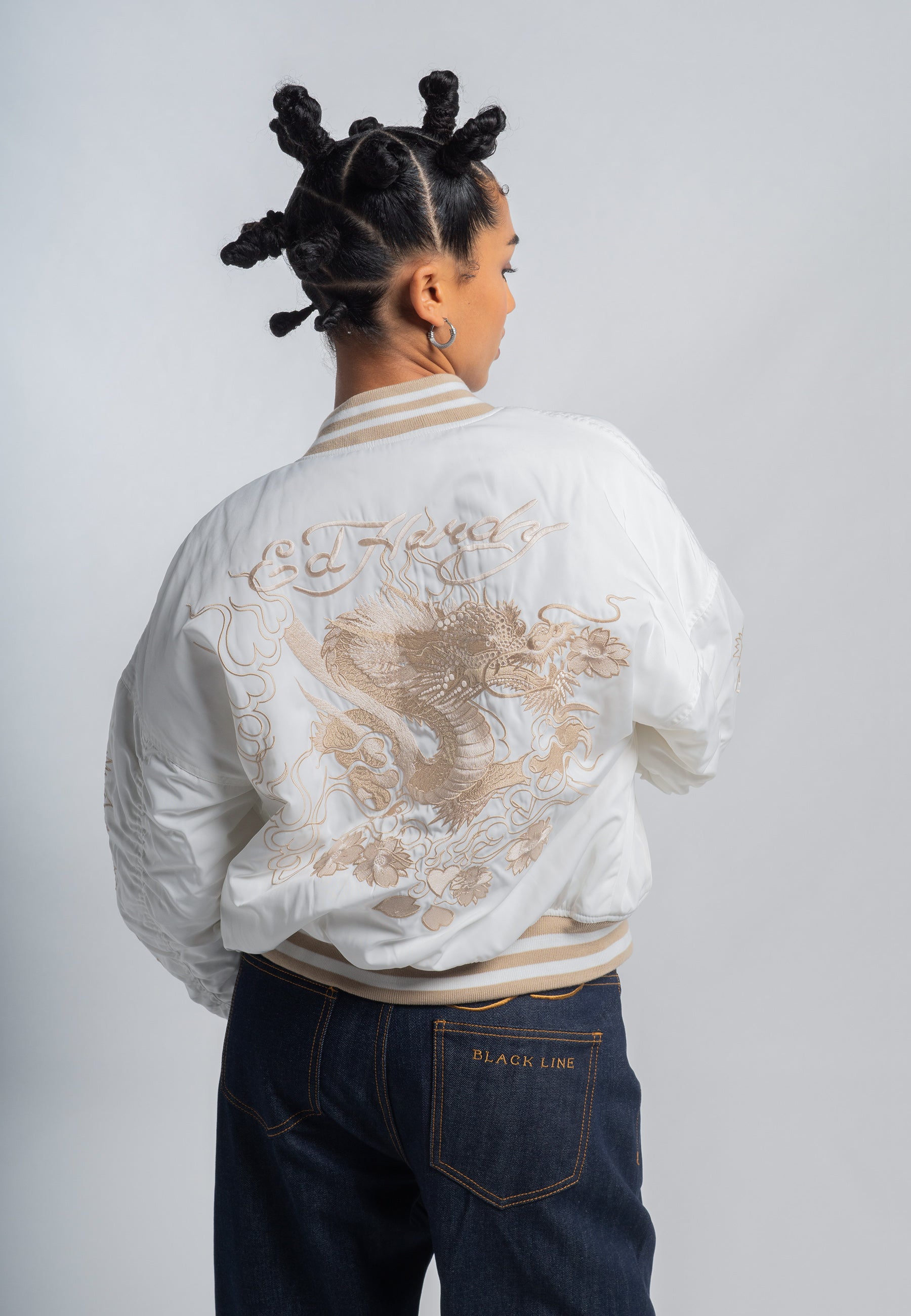 Vi præsenterer Women's Vintage-Dragon Varsity Bomber Jacket, en vidnesbyrd om Ed Hardys varige arv inden for mode.