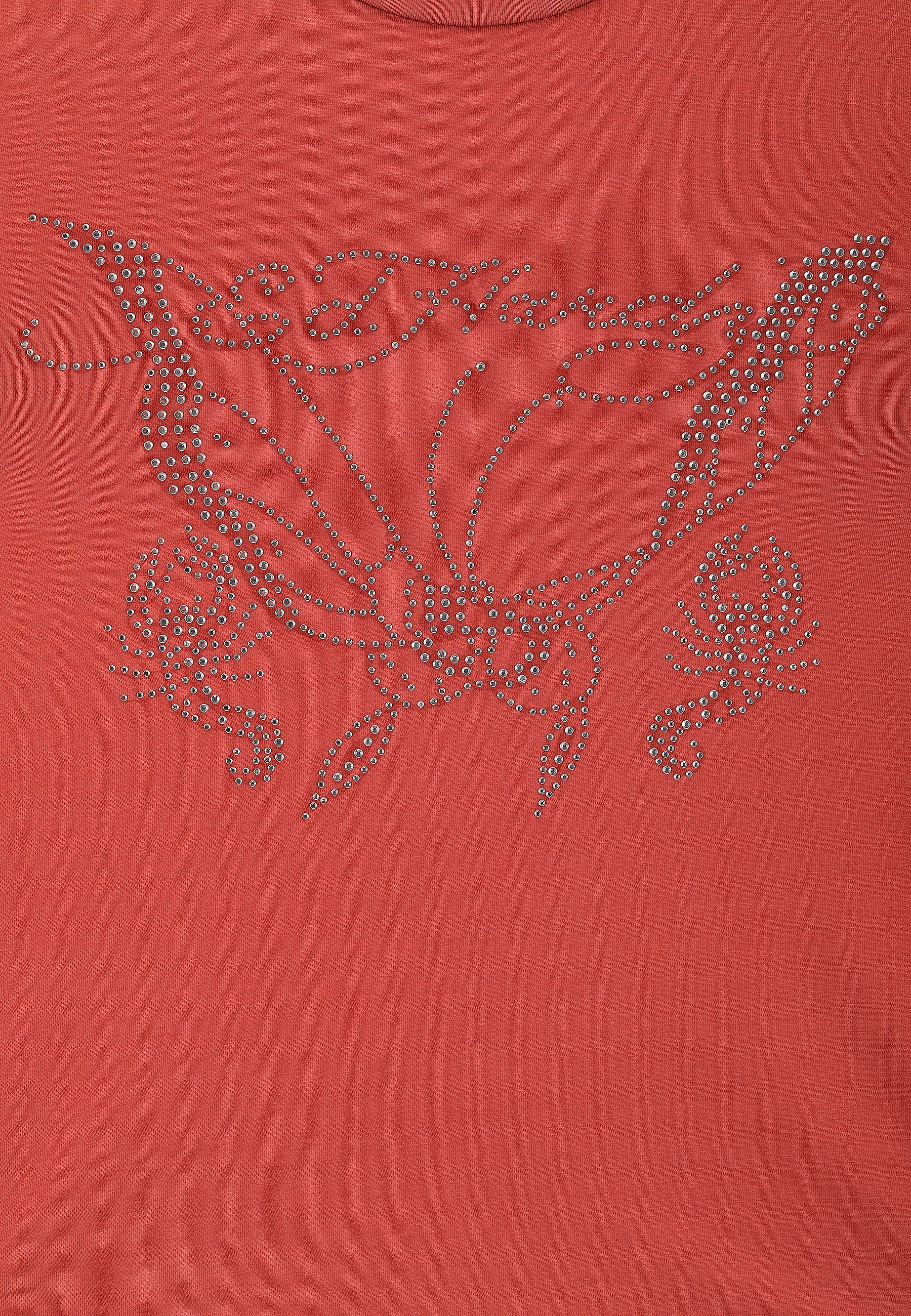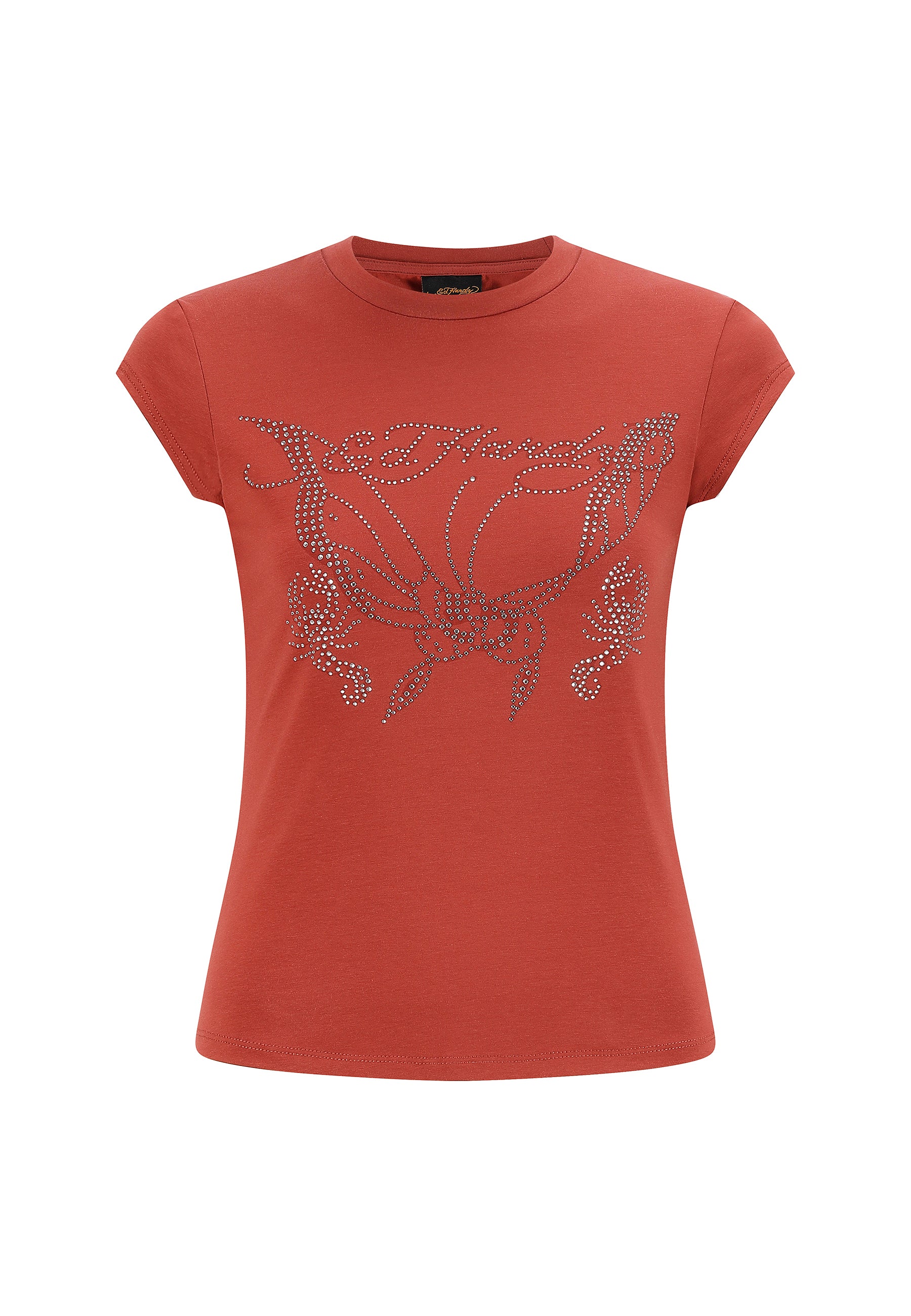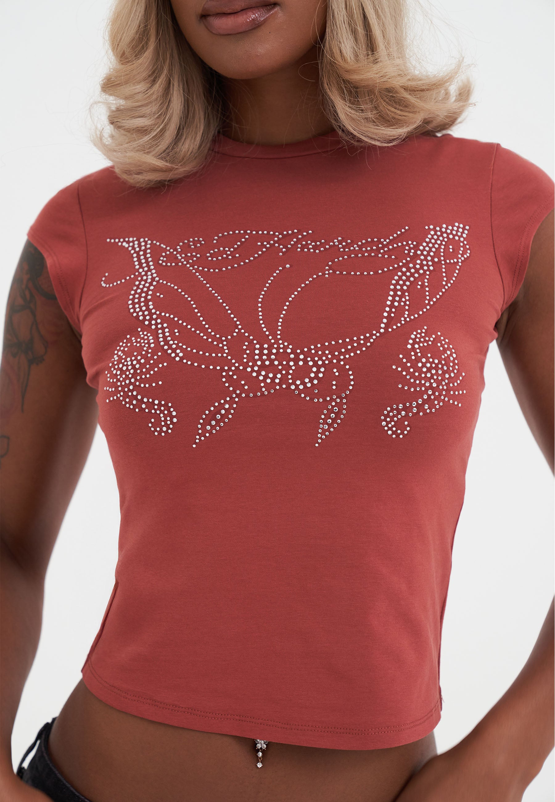 WOMENS BUTTERFLY DIAMANTE CAP SLEEVE T-SHIRT in Red