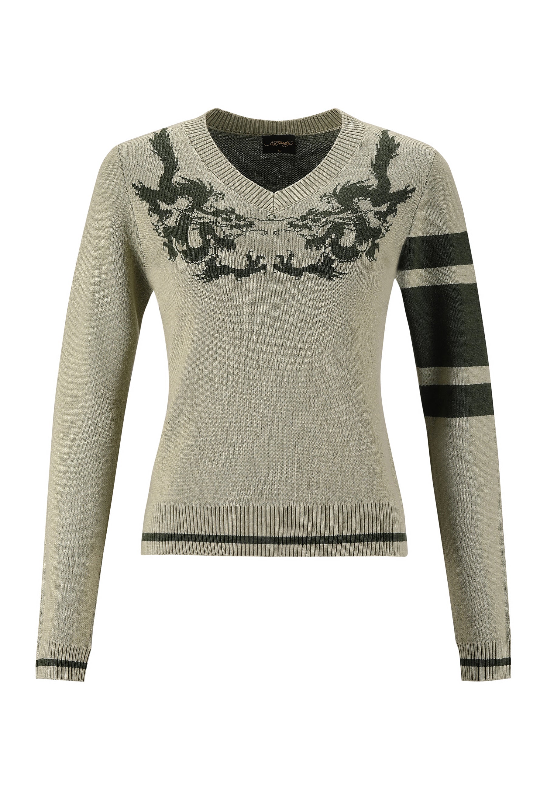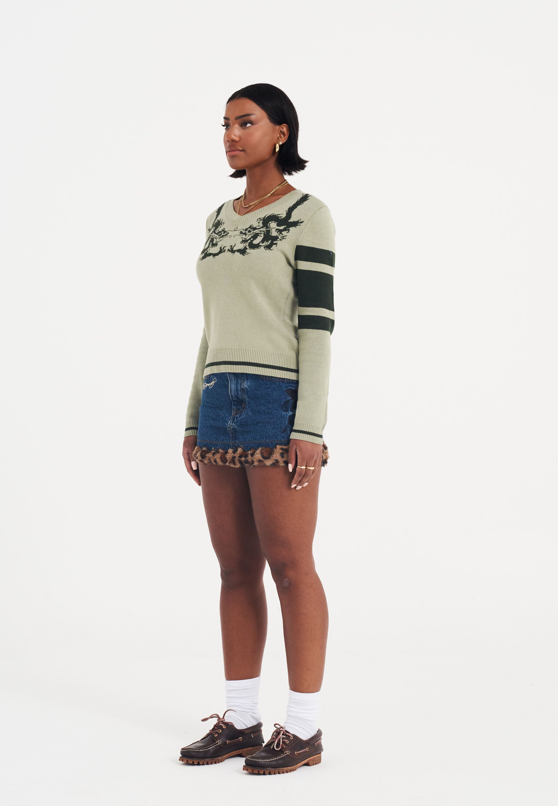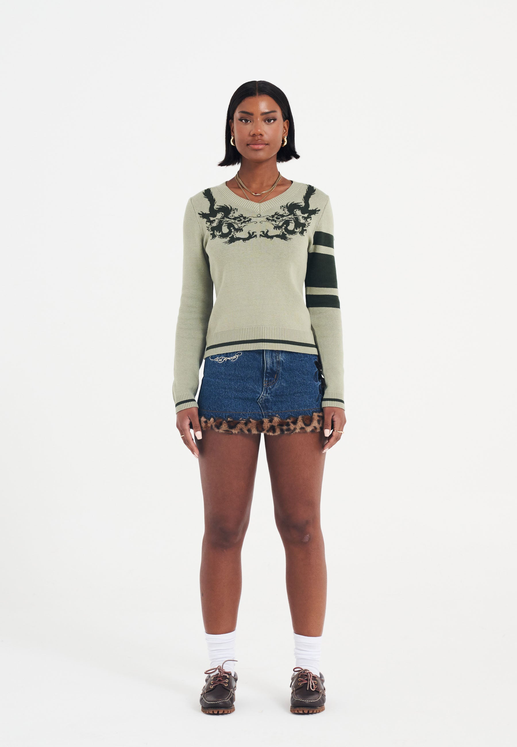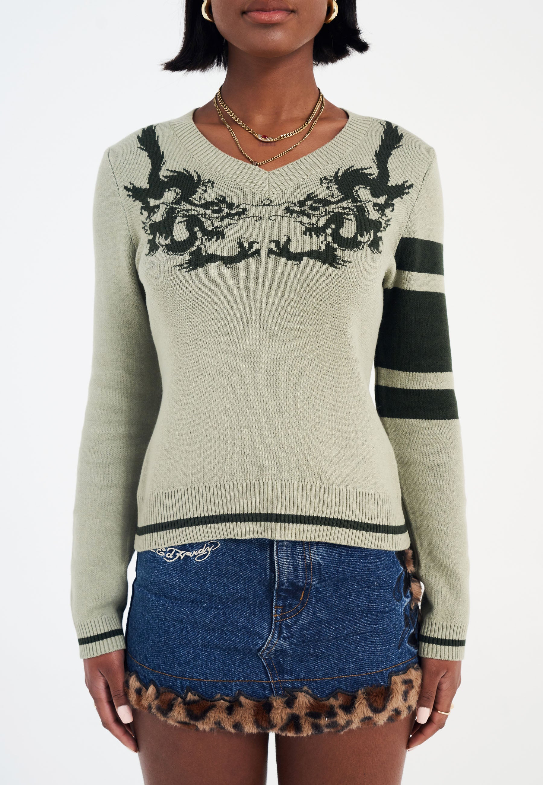 Womens Dancing Dragon V Neck Knitted Jumper - Green