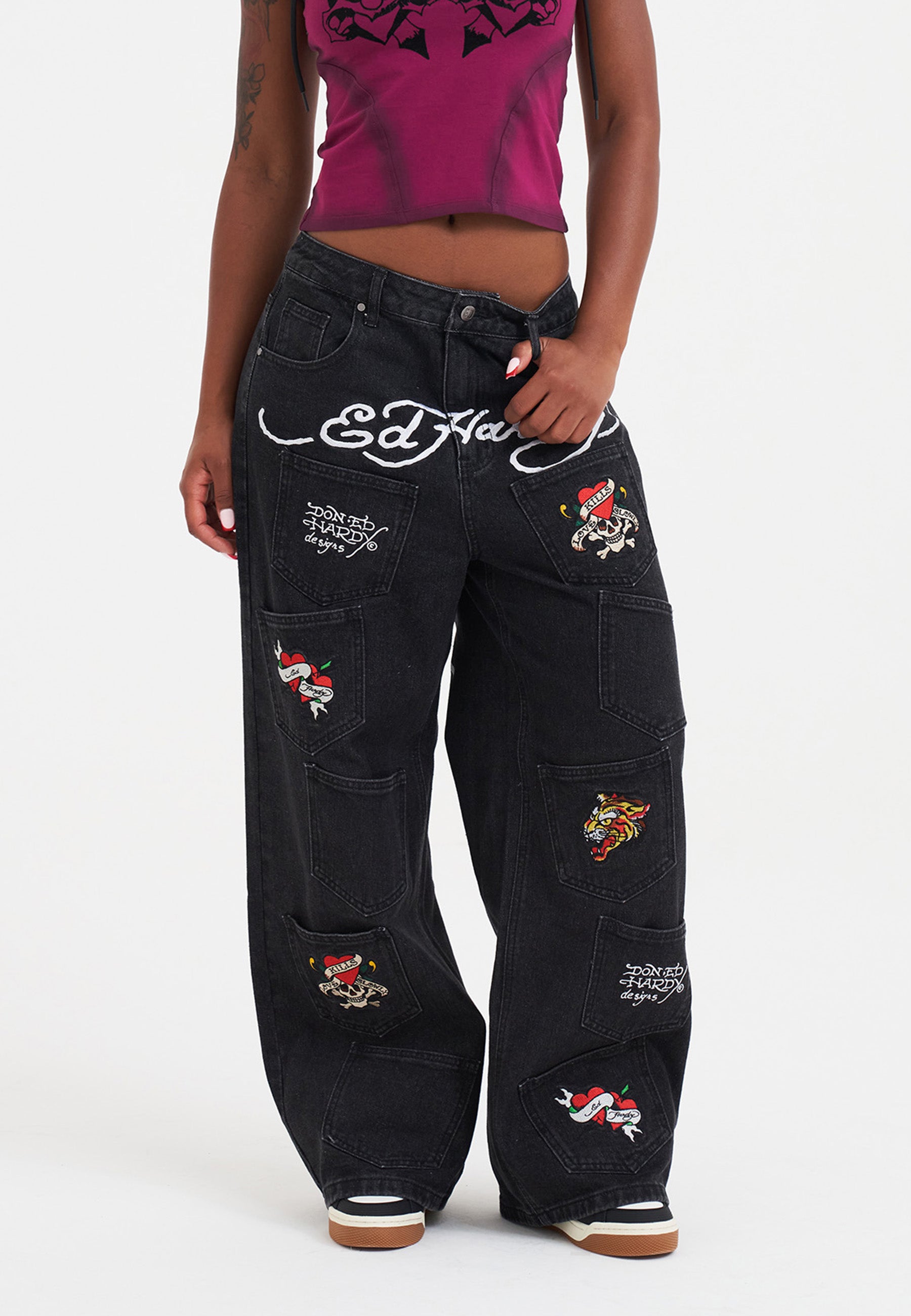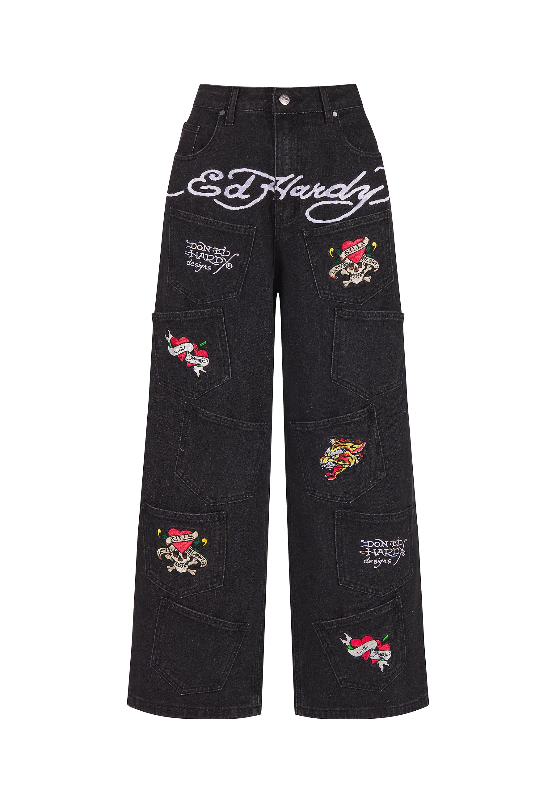 - MULTI EMBROIDERED TATTOO GRAPHIC POCKETS ON FRONT LEGS
