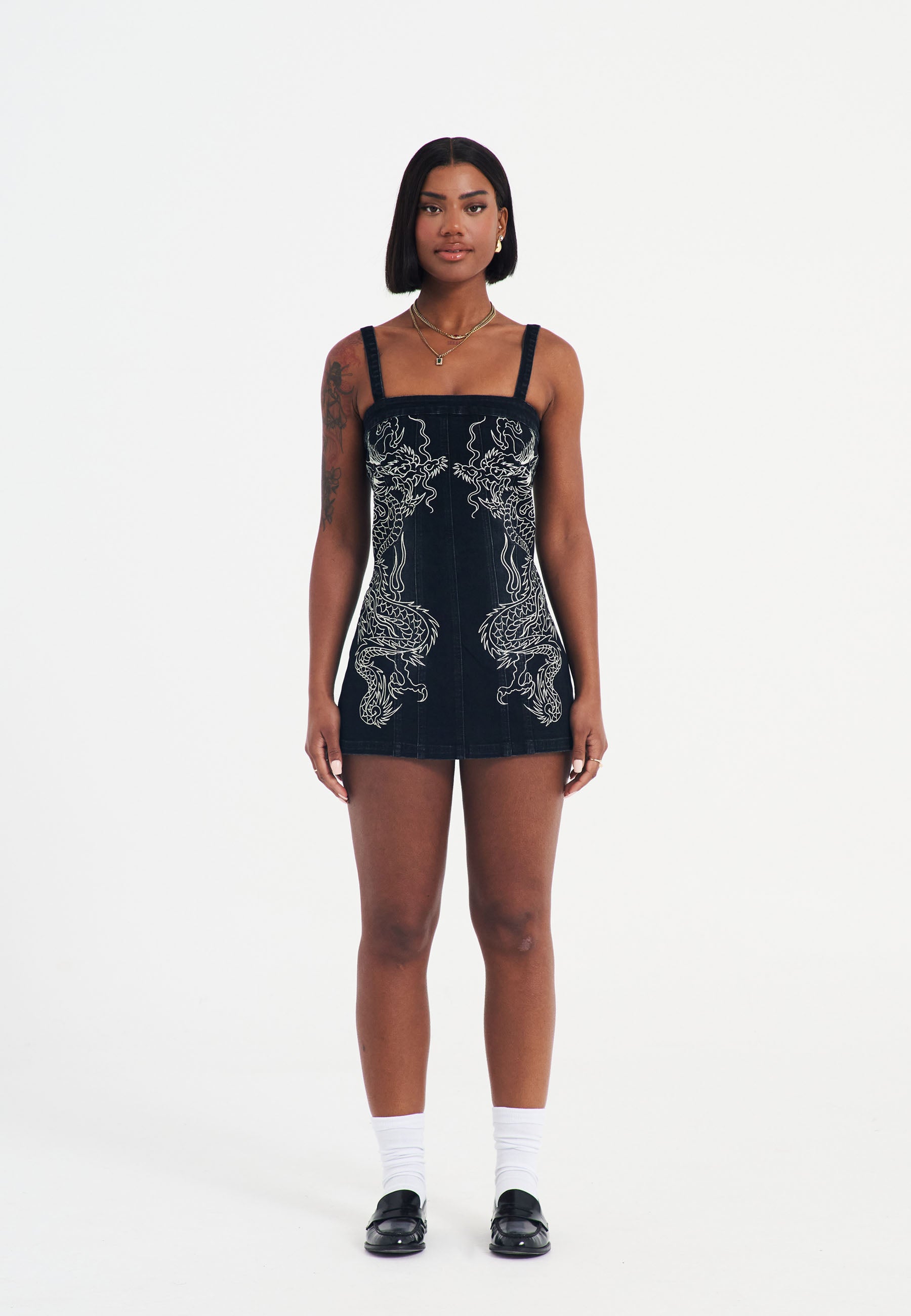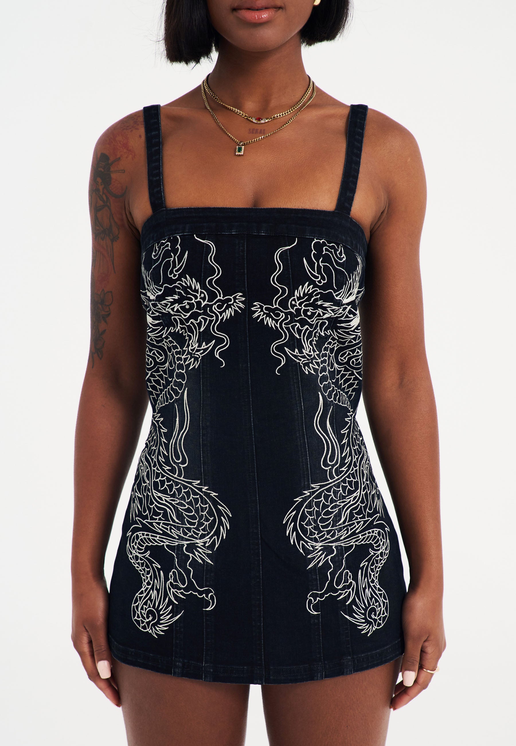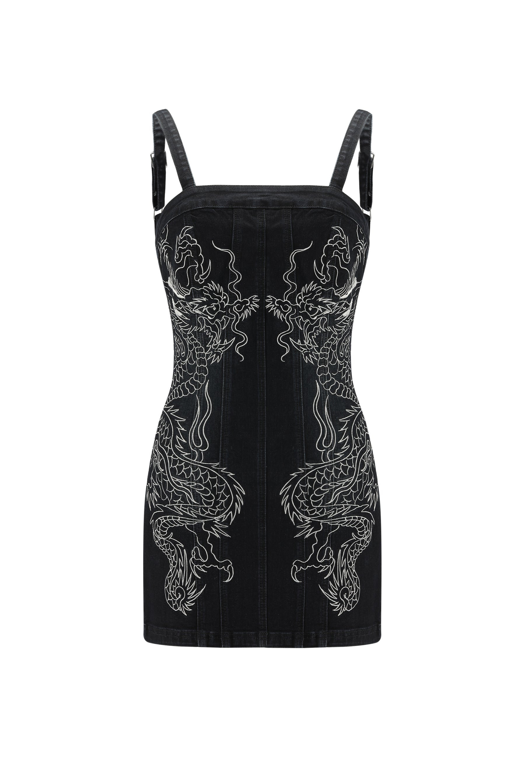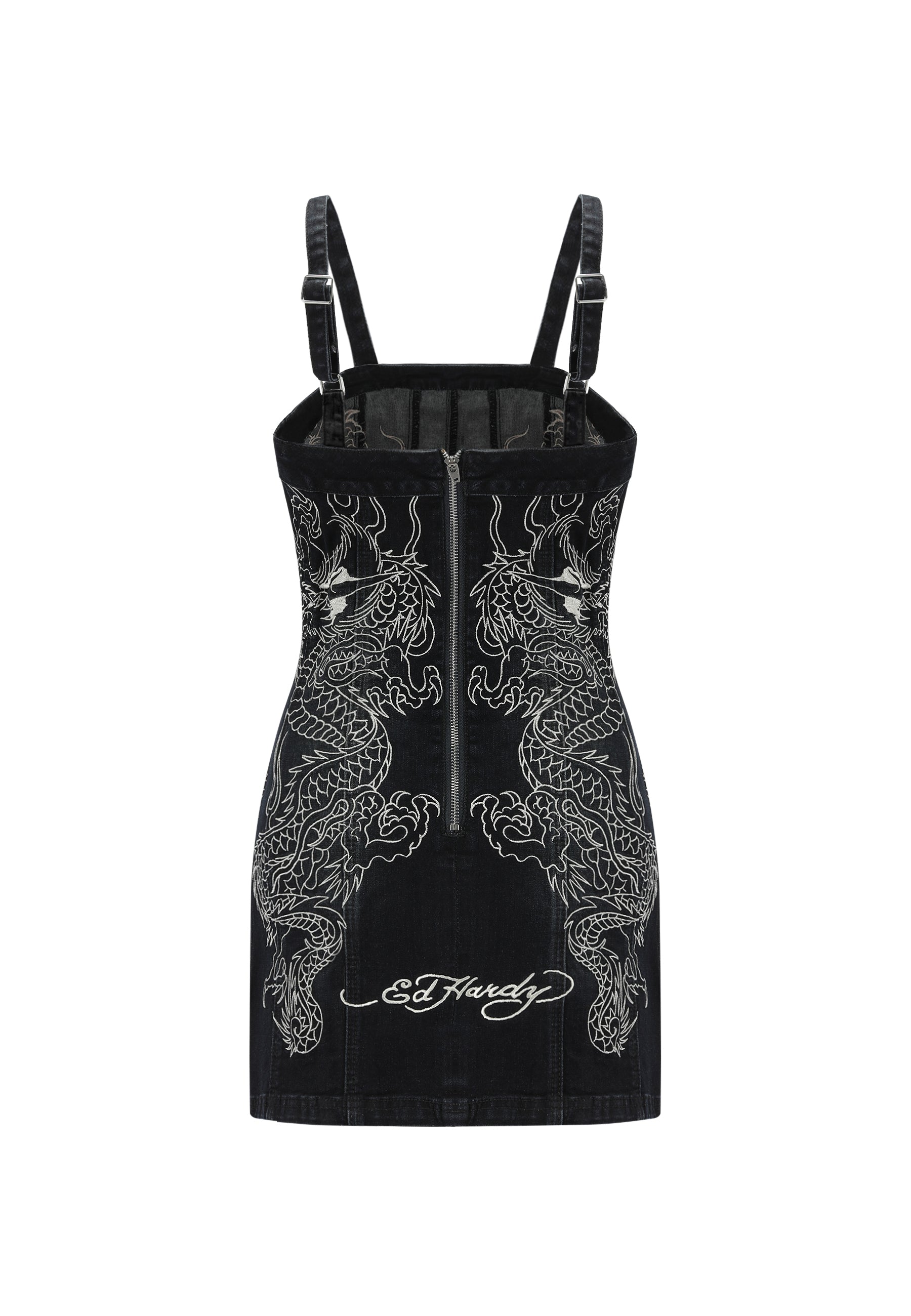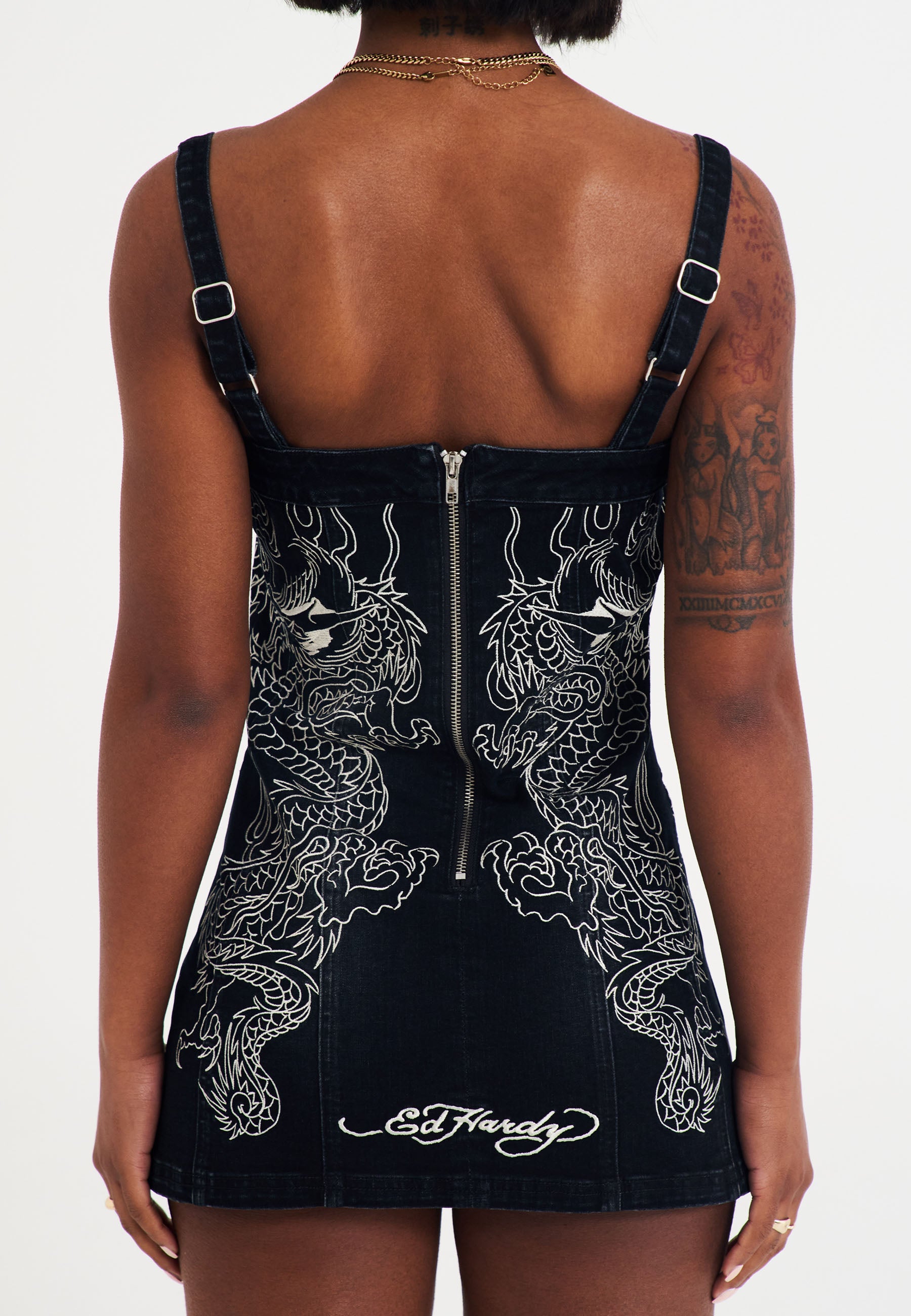 This ultra-mini dress in black washed denim features bold mirrored dragon flame embroidery from the archive on the front and back, embodying Ed Hardy's signature tattoo flair. The tight fit is complemented by adjustable straps for a personalized look, while the center-back zip closure ensures a sleek finish. Complete with the iconic Ed Hardy logo on the back hem, this dress is a showstopper in every sense.