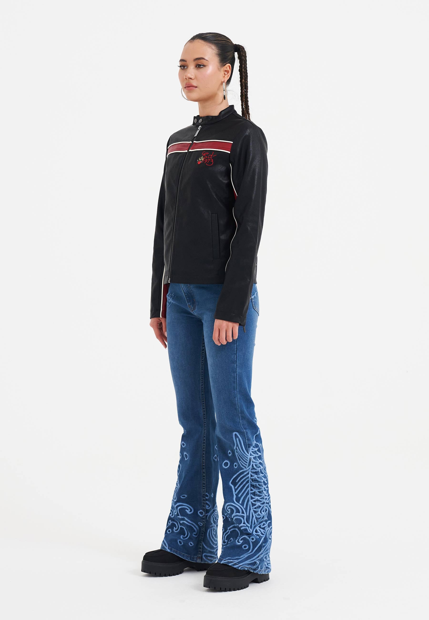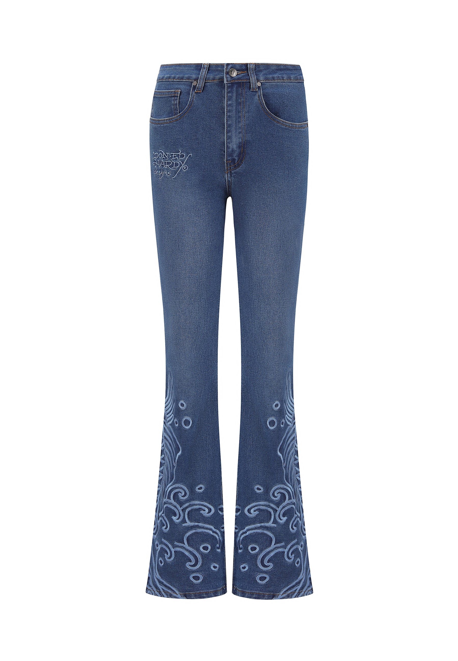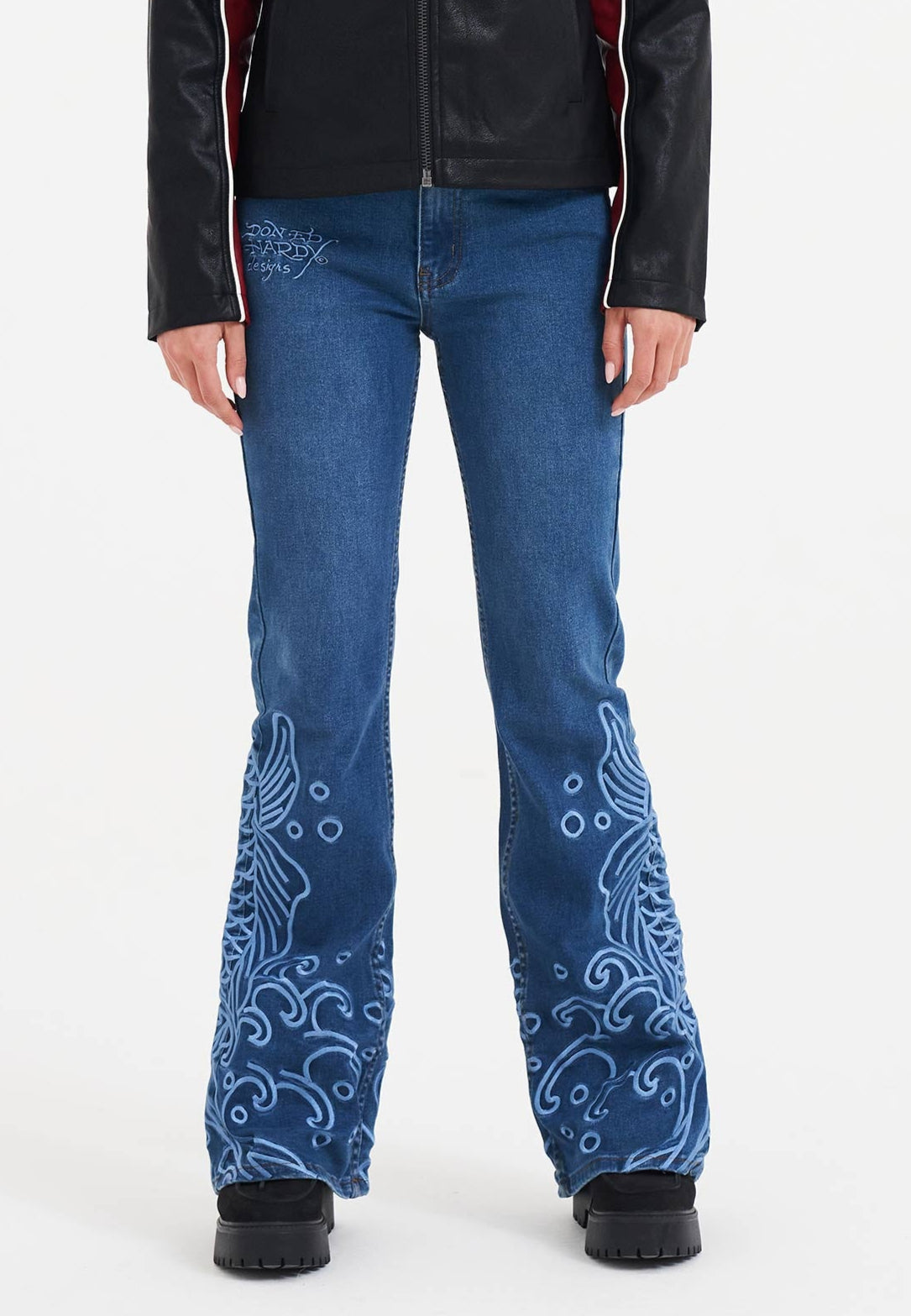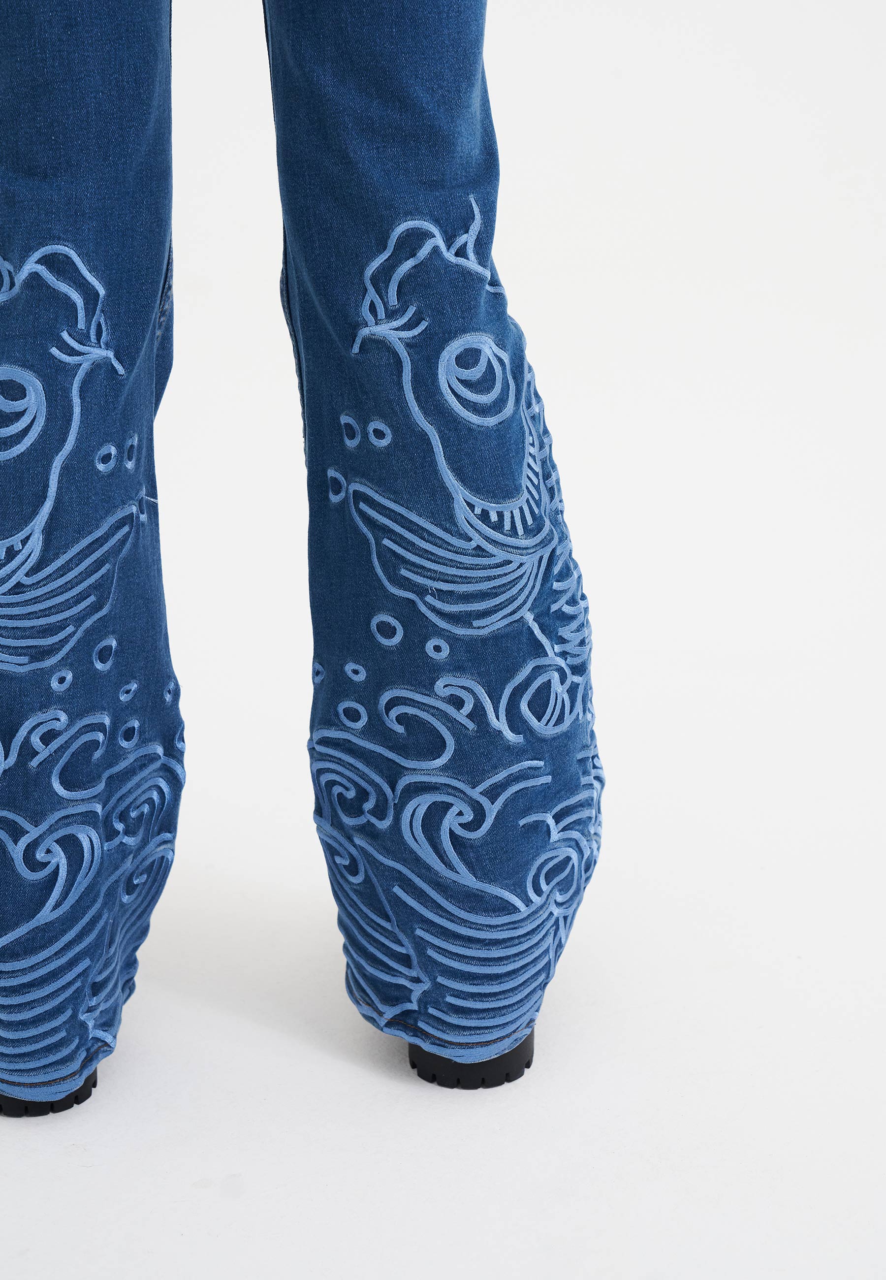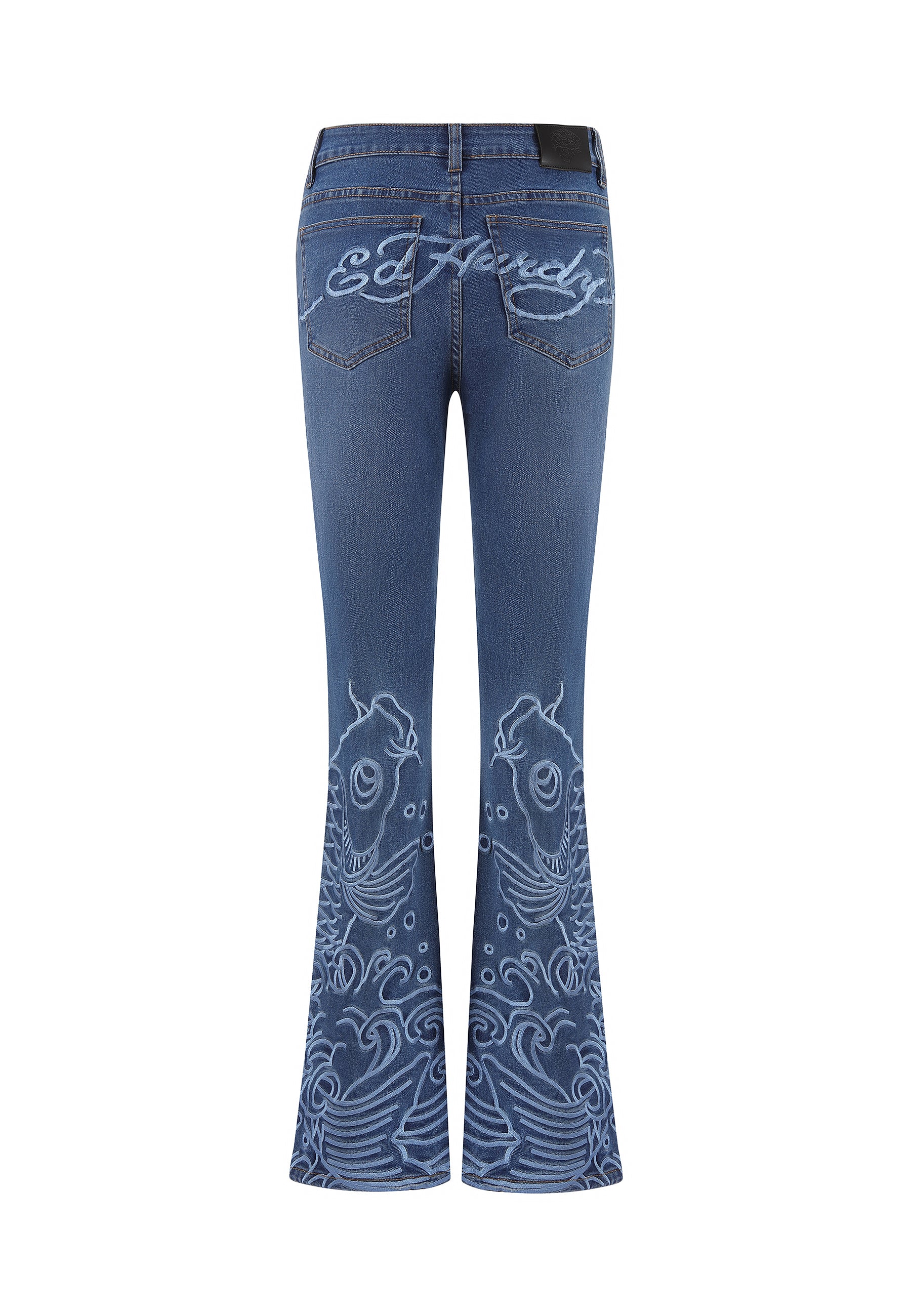 Womens Jumping Koi Denim Flared Jeans - Indigo