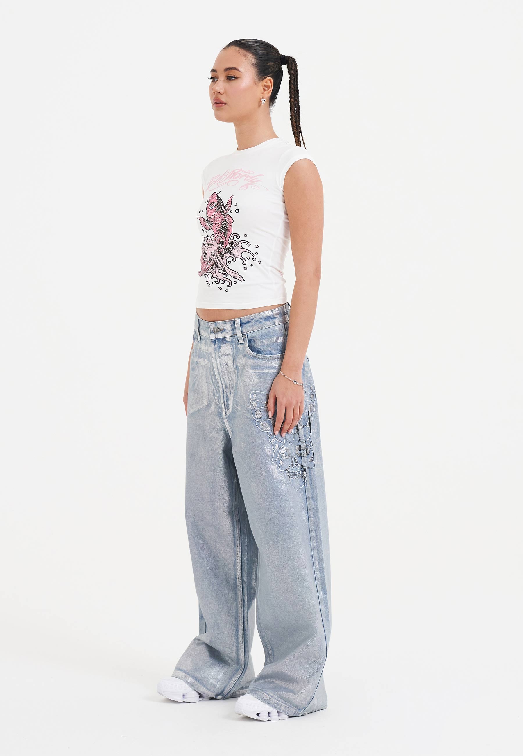 Womens Koi Fish Diamante Cap Sleeve T-Shirt Top - White