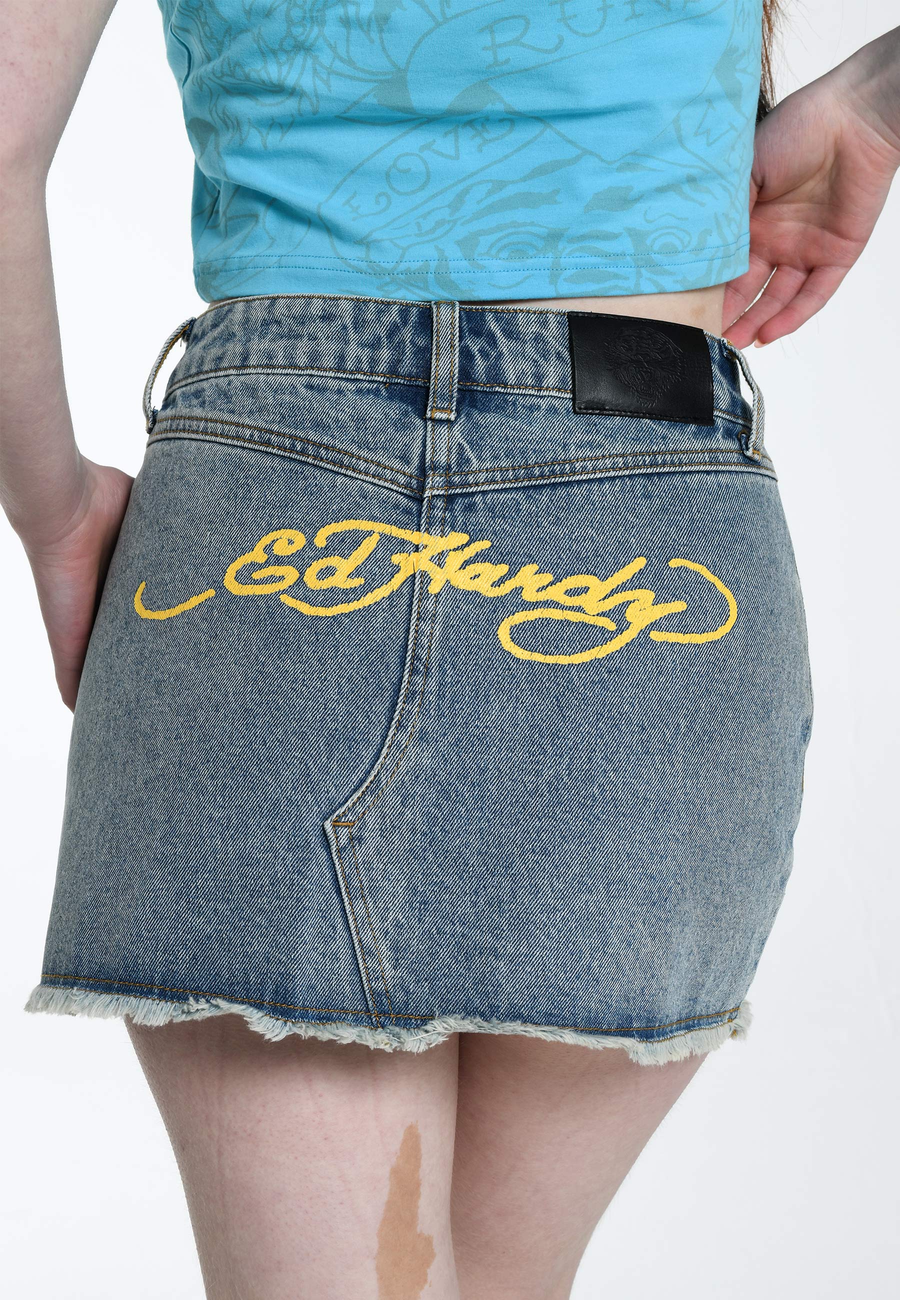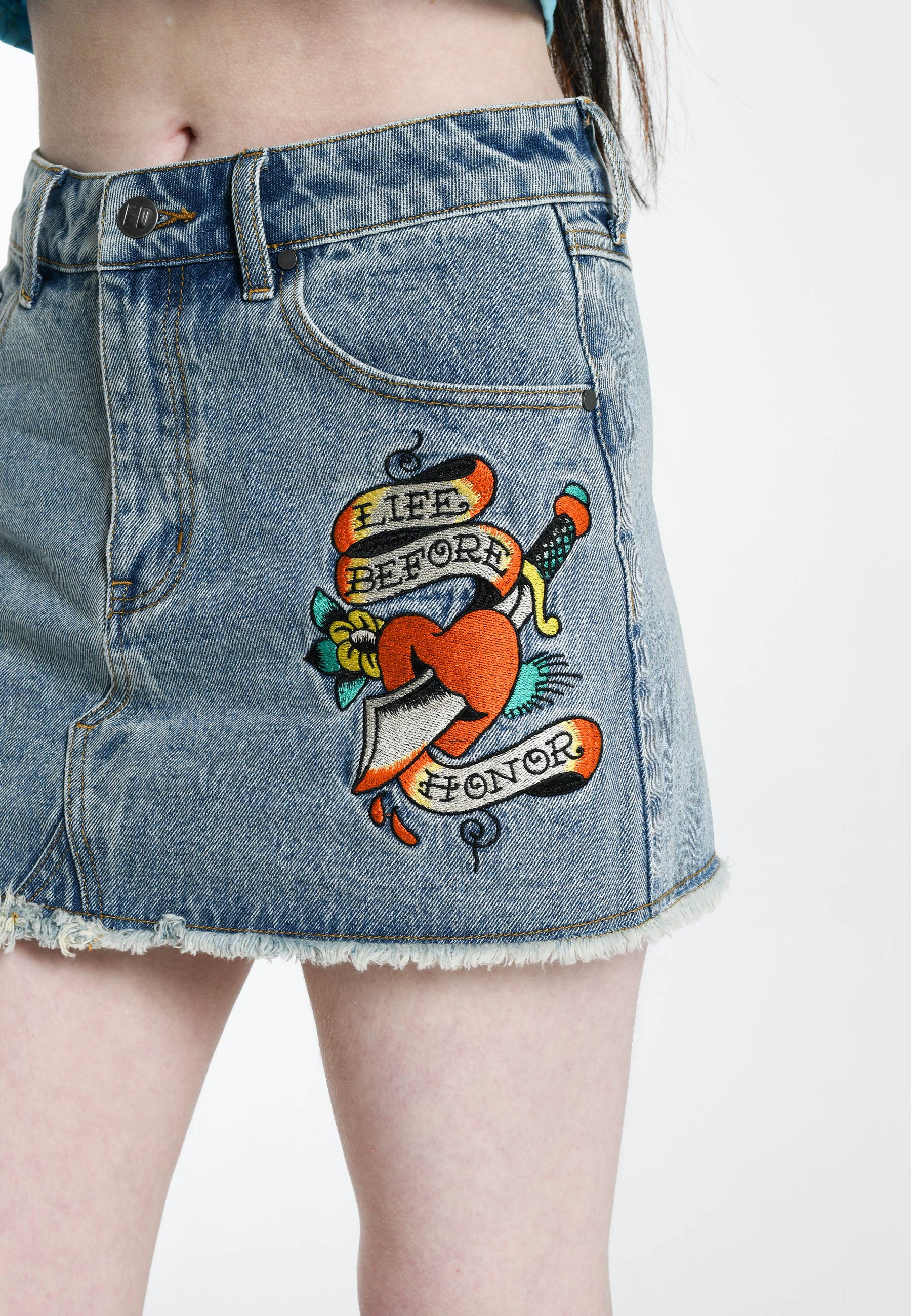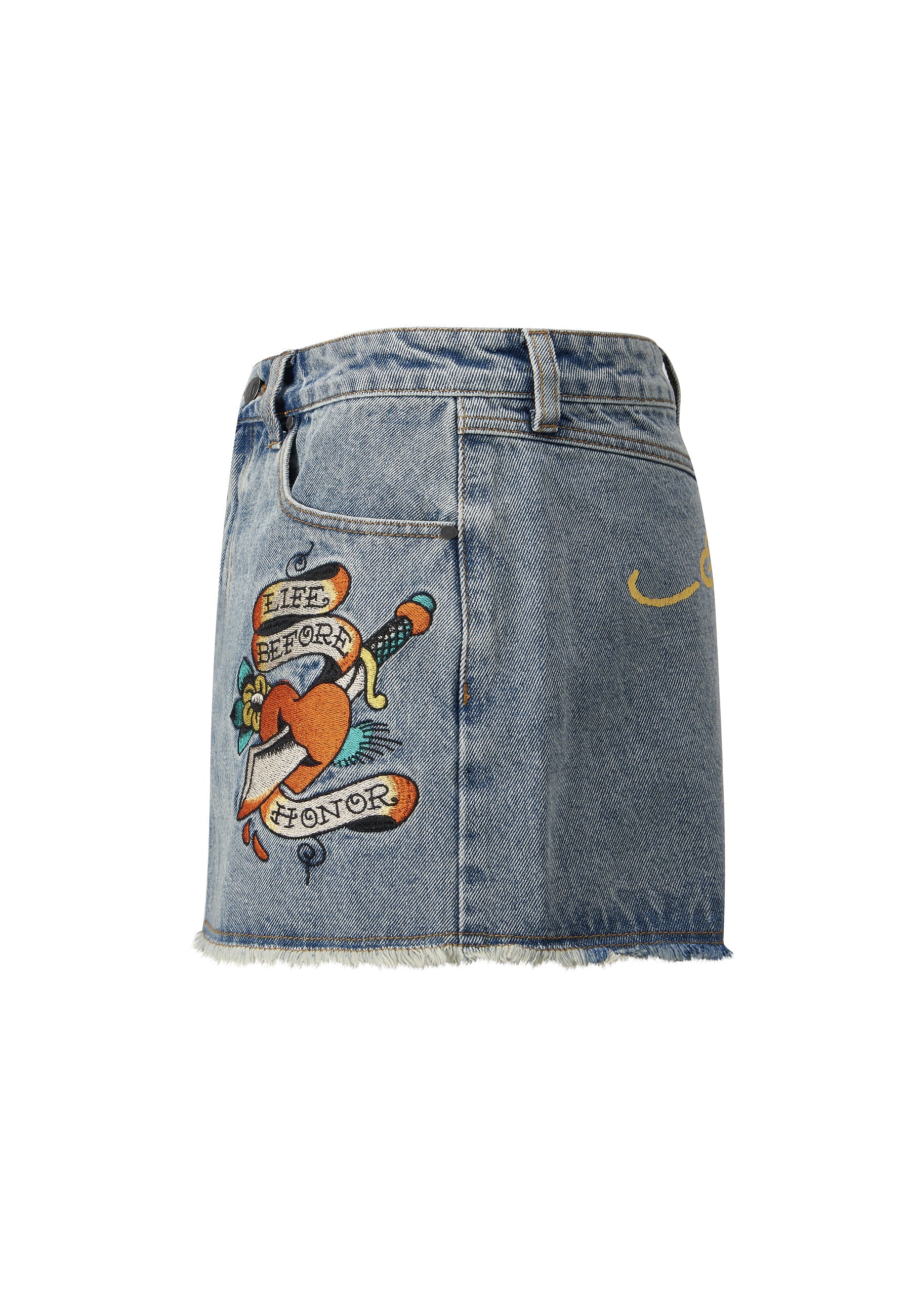 A spring and summer wardrobe staple that pairs with every top in your arsenal, the Life Before Honor denim skirt features a vibrant heart, sword, and banner graphic embroidered into the left thigh, and the Ed Hardy signature across the back yoke in yellow. A raw-edge hem that hits mid-thigh completes the look.