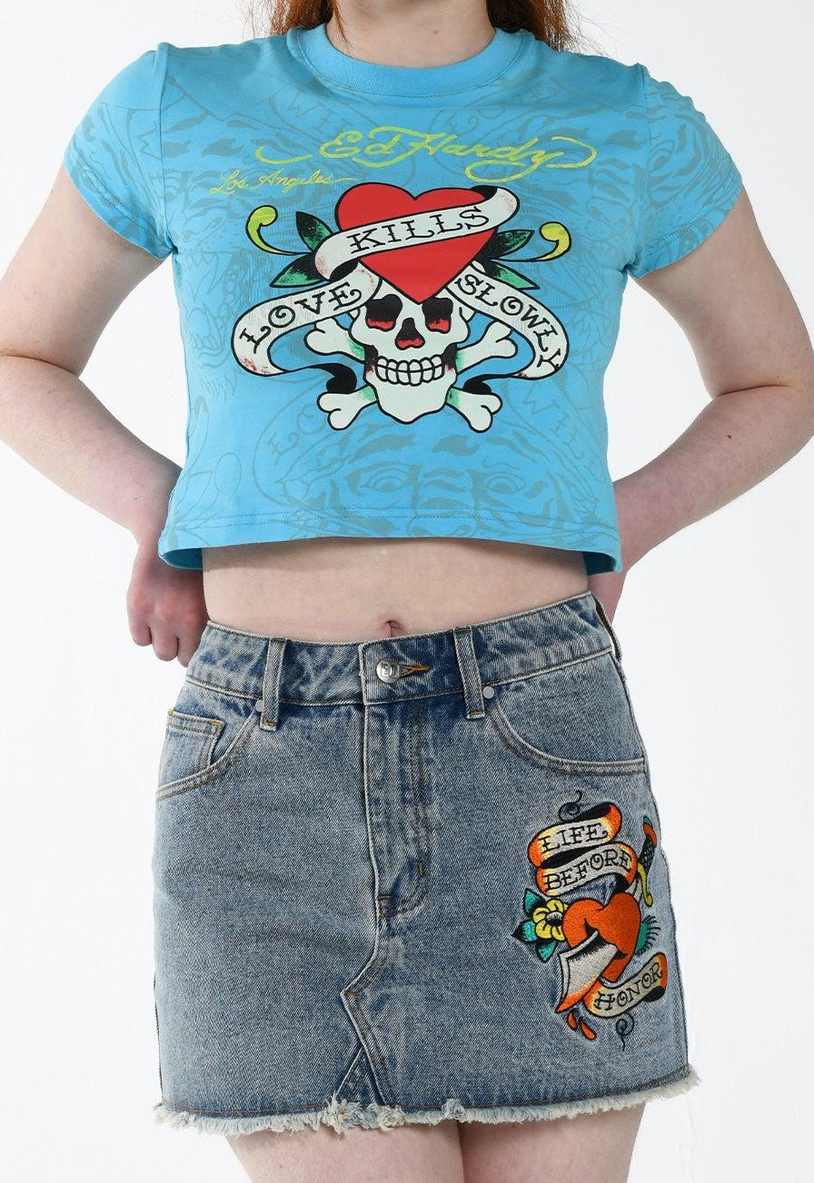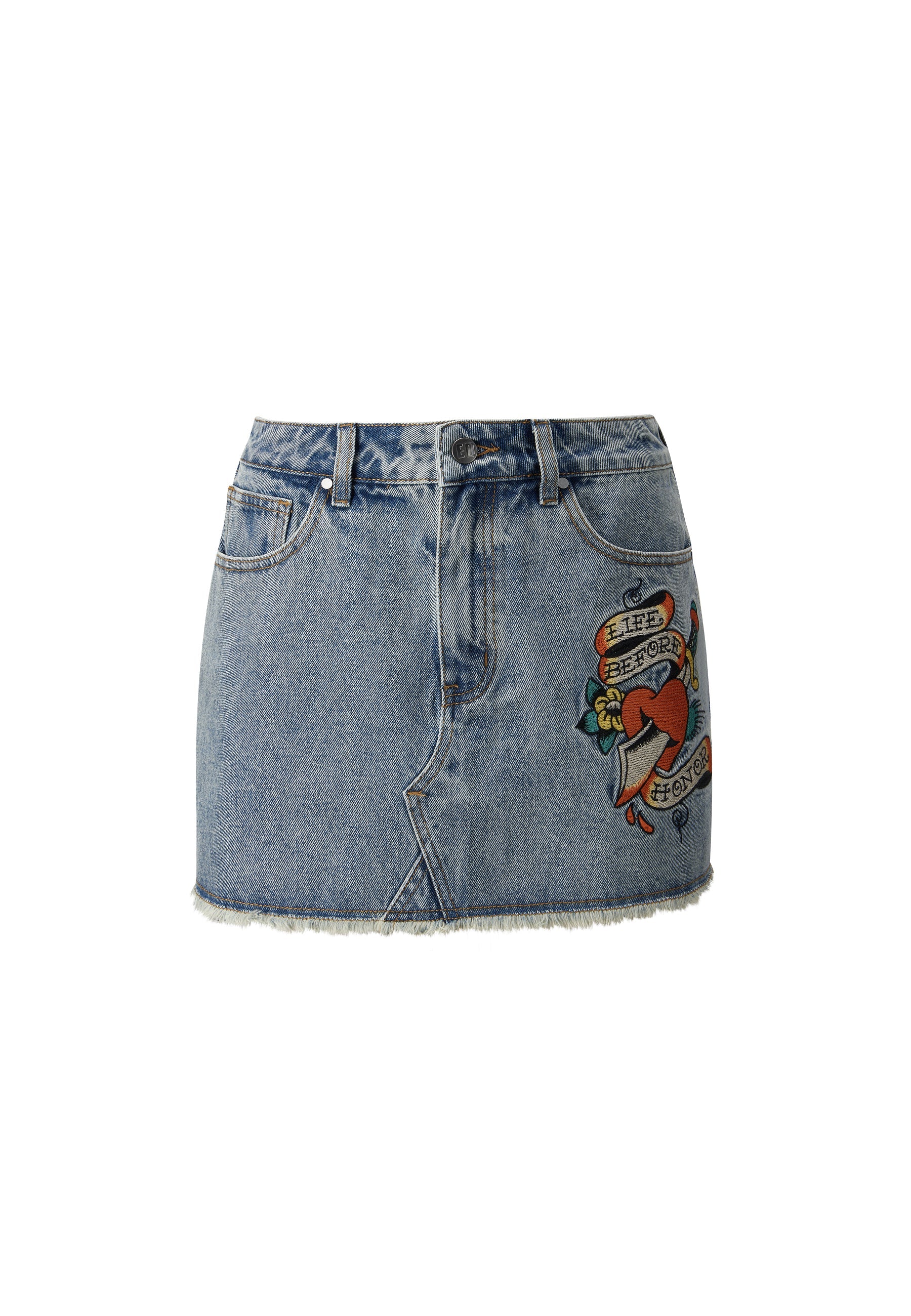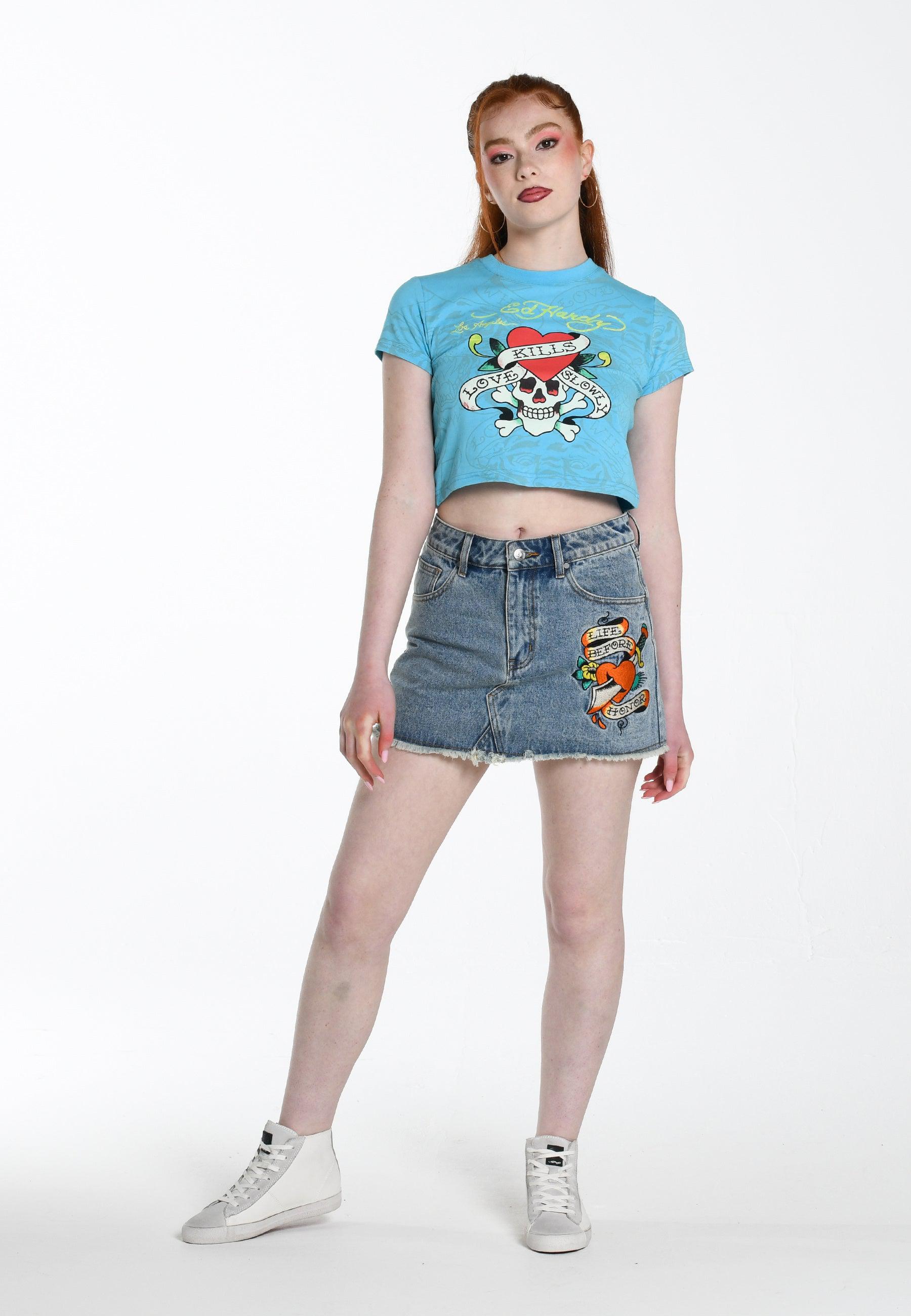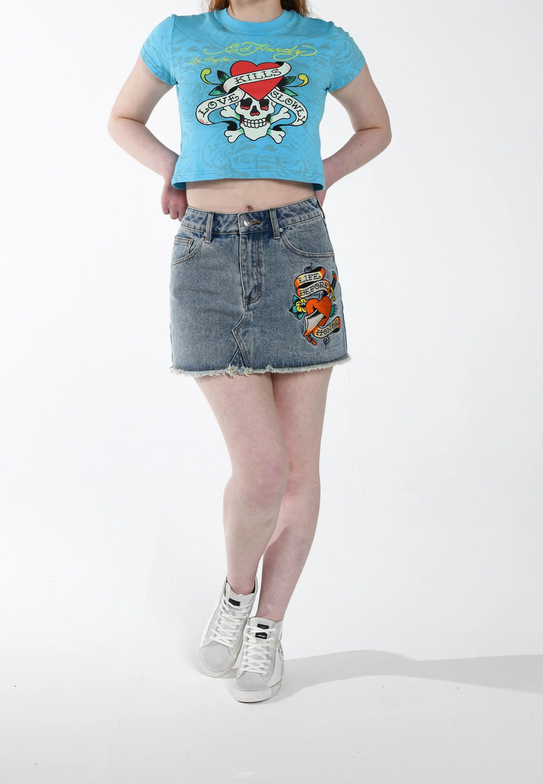 A spring and summer wardrobe staple that pairs with every top in your arsenal, the Life Before Honor denim skirt features a vibrant heart, sword, and banner graphic embroidered into the left thigh, and the Ed Hardy signature across the back yoke in yellow. A raw-edge hem that hits mid-thigh completes the look.