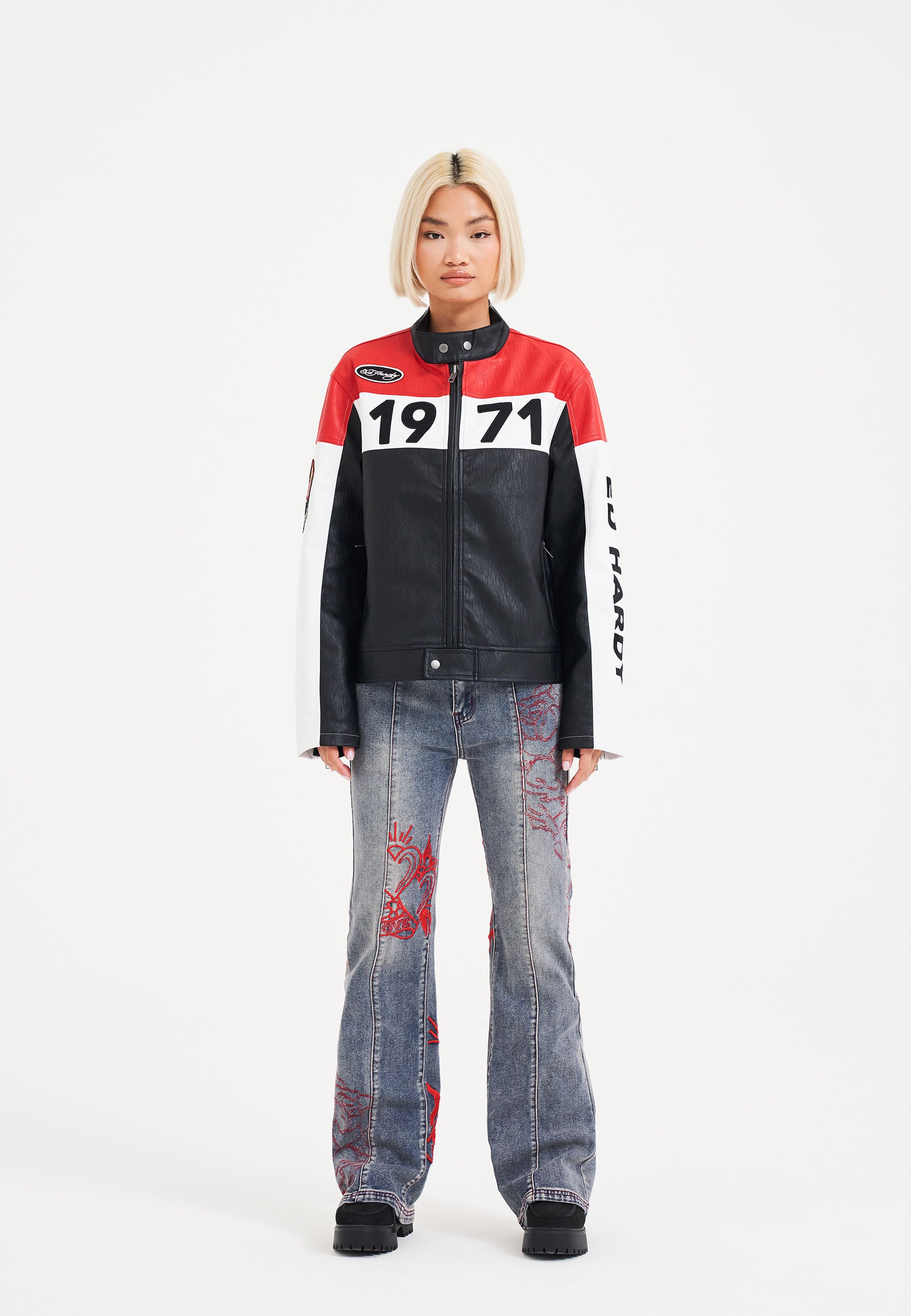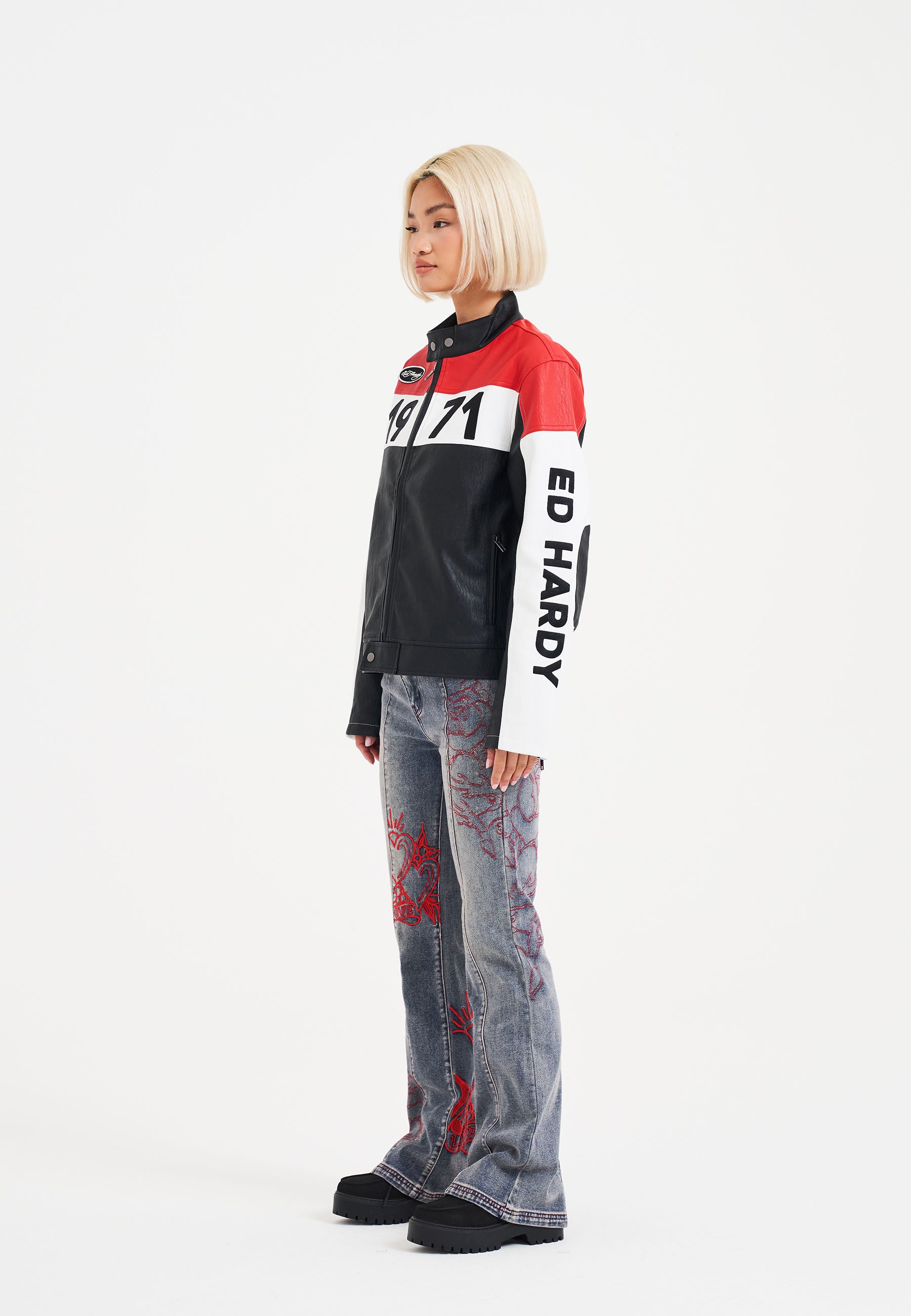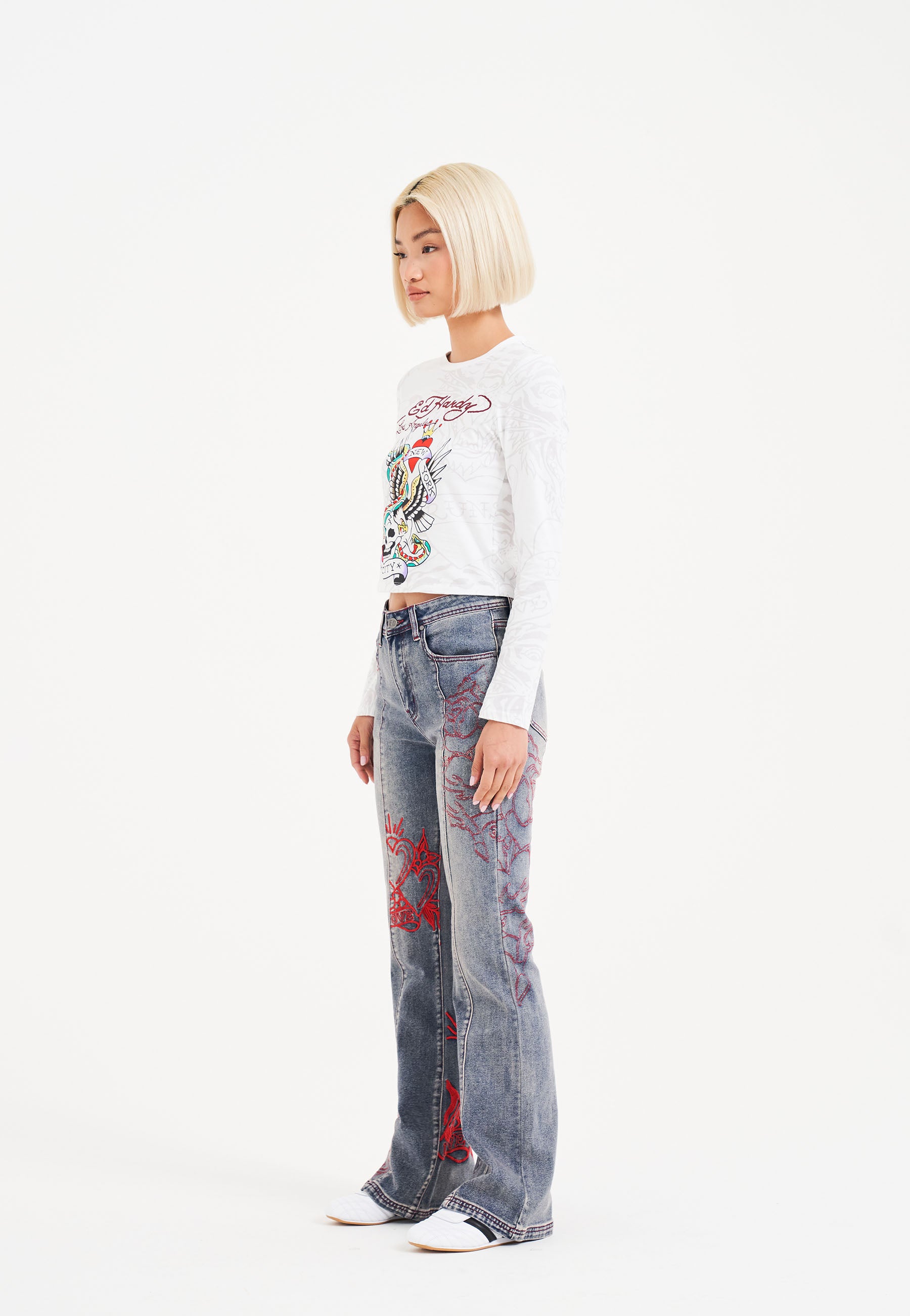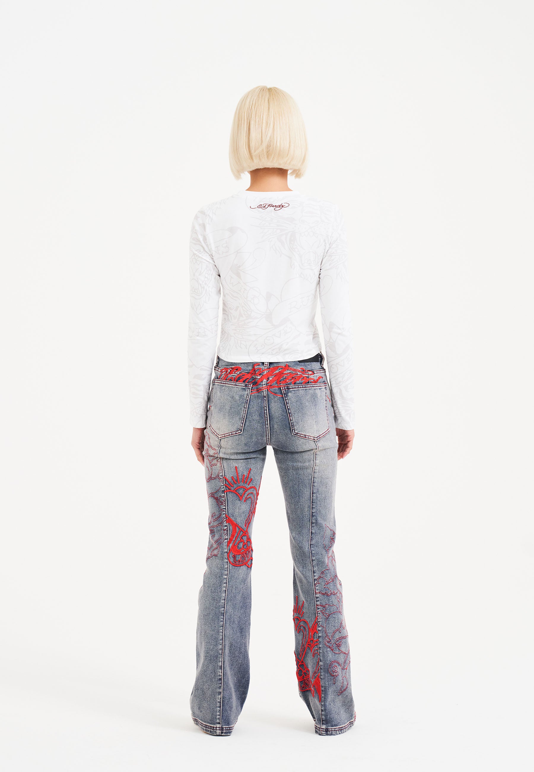 These mid-blue jeans are designed for a figure-hugging fit with an extra-tight flare, perfect for making a bold statement. Embellished with striking red heart embroidery and intricate chain stitching, these jeans capture the essence of Ed Hardy’s graphic style. The design is completed with panel embroidery, center-front seams, and contrast stitching. Featuring two front pockets, Ed Hardy’s signature on the yoke, and a leather embossed tag, these jeans are as stylish as they are distinctive.