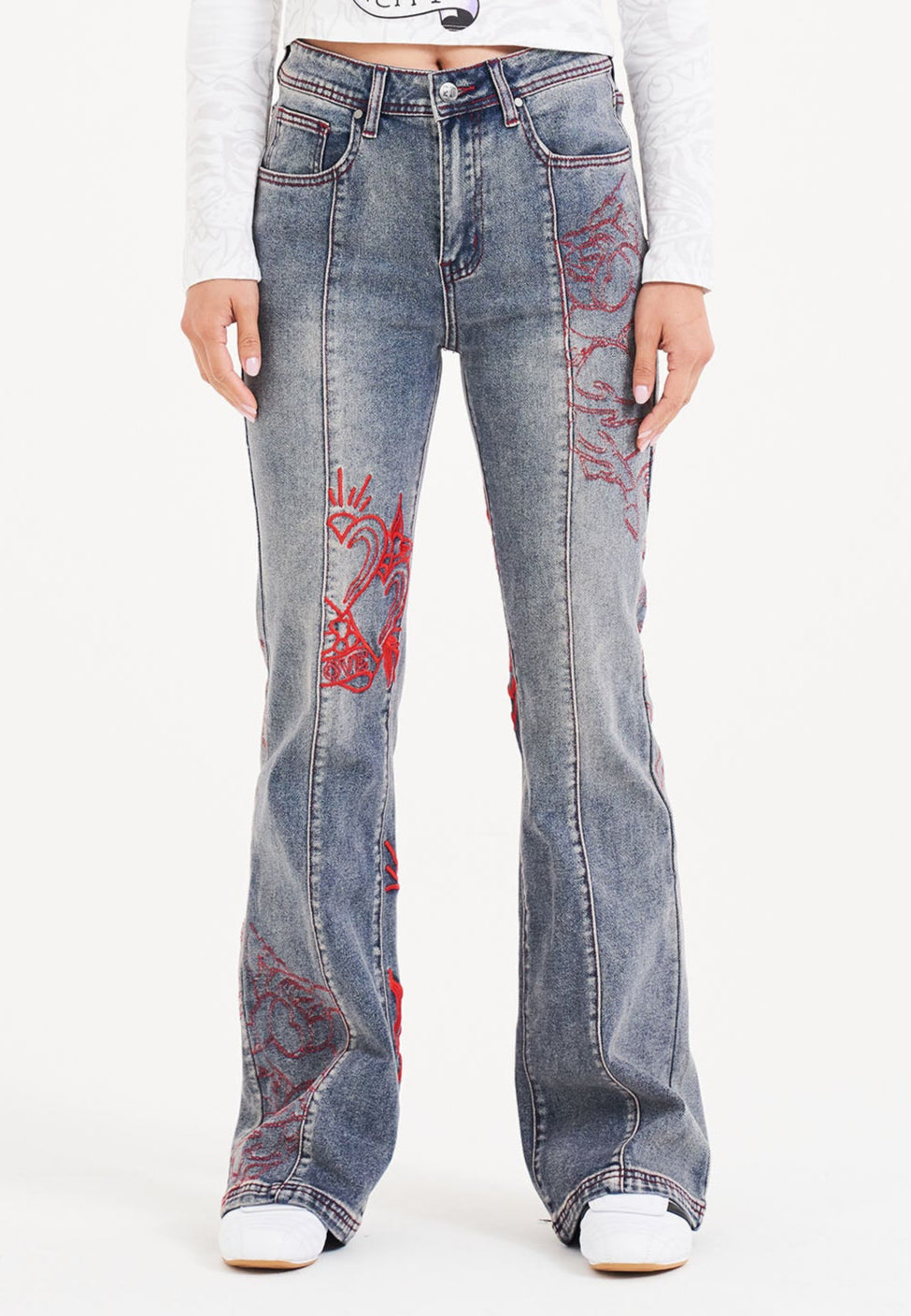 Womens Rouge Hearts Flared Denim Trousers Jeans - Mid Blue