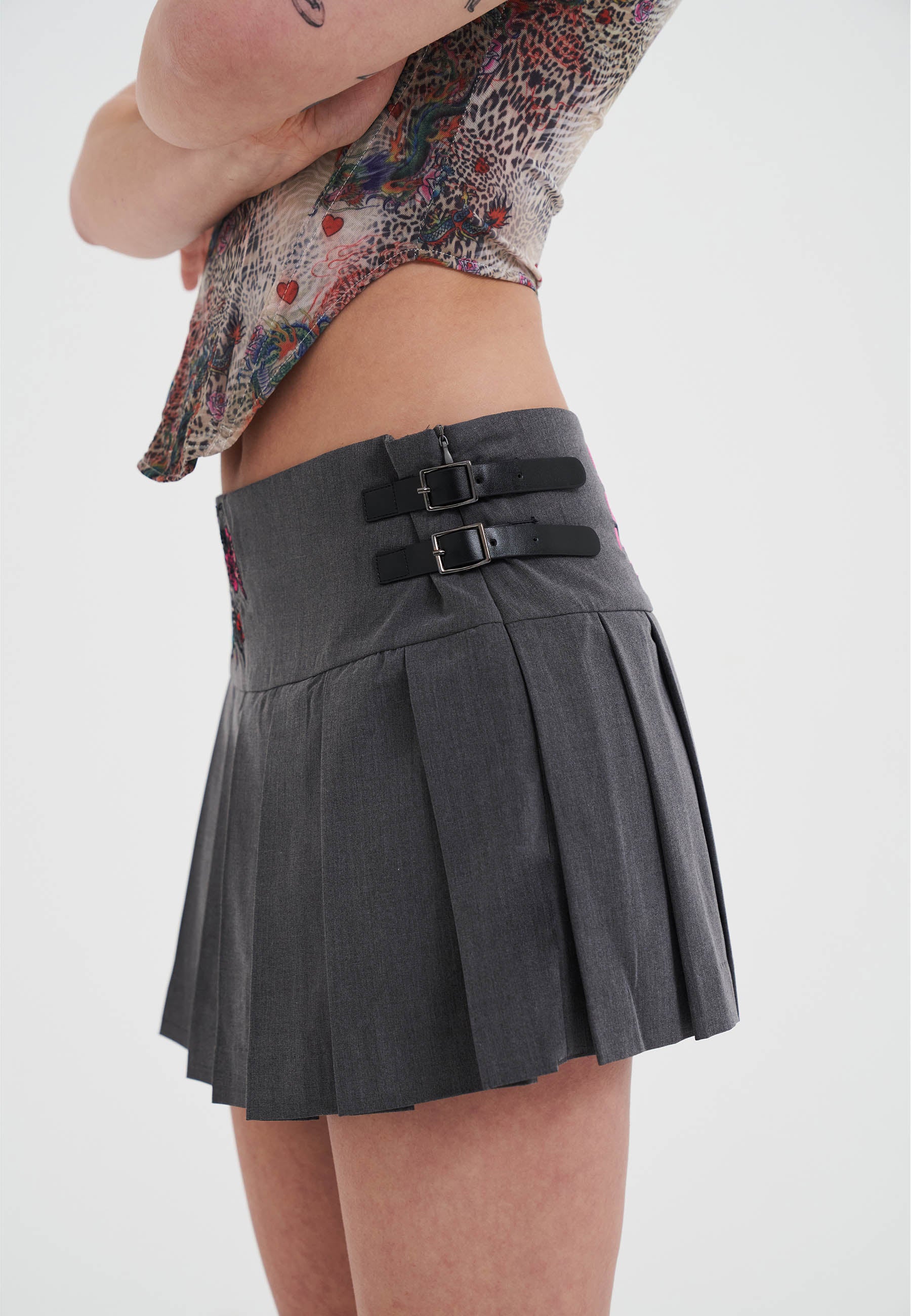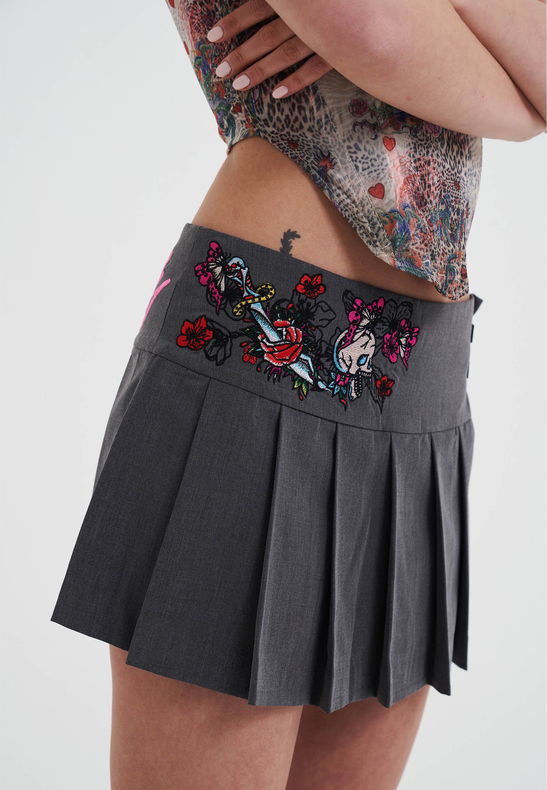 Womens Skull And Panther Pleated Mini Skirt - Grey