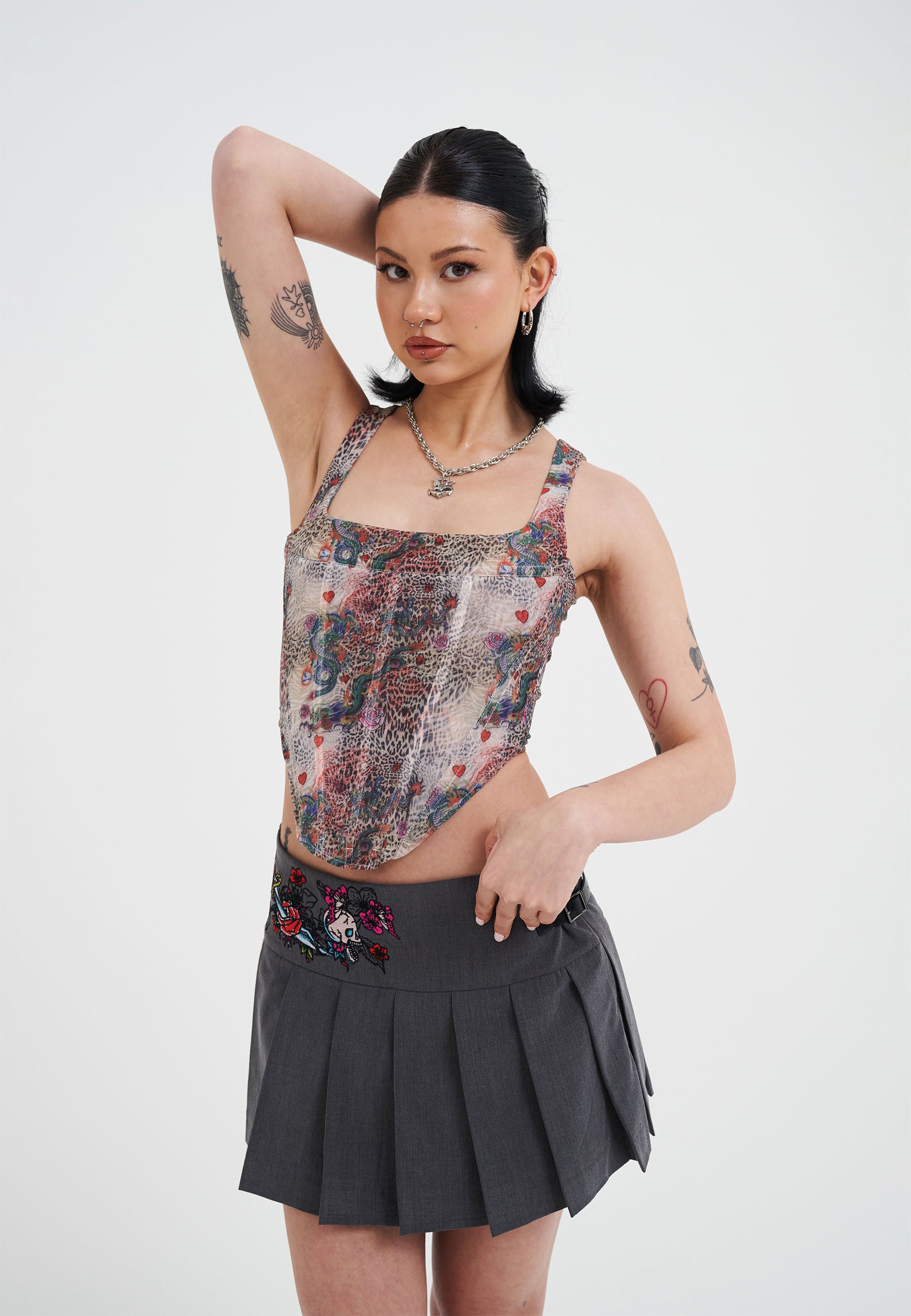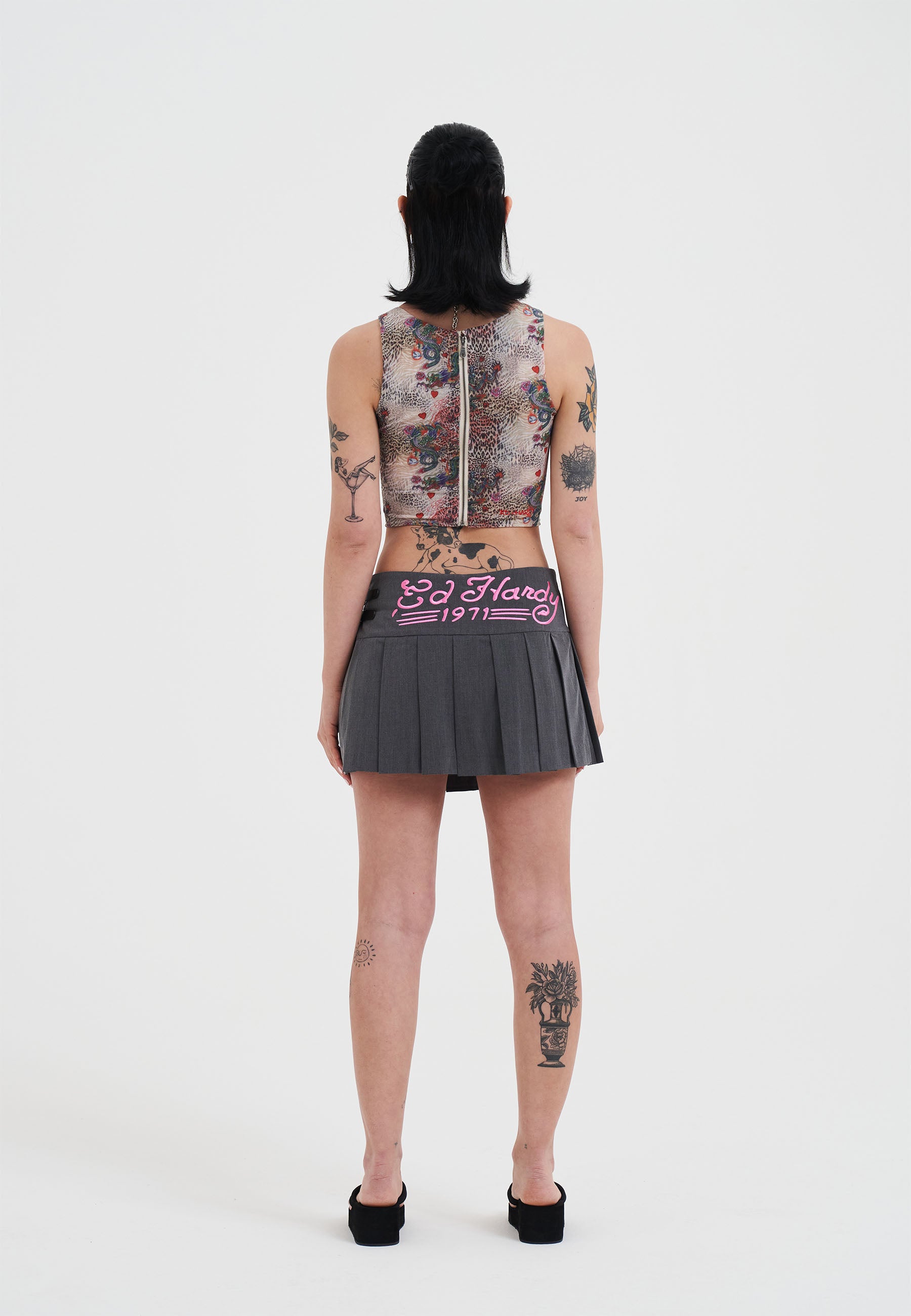 SKULL AND PANTHER PLEATED MINI SKIRT