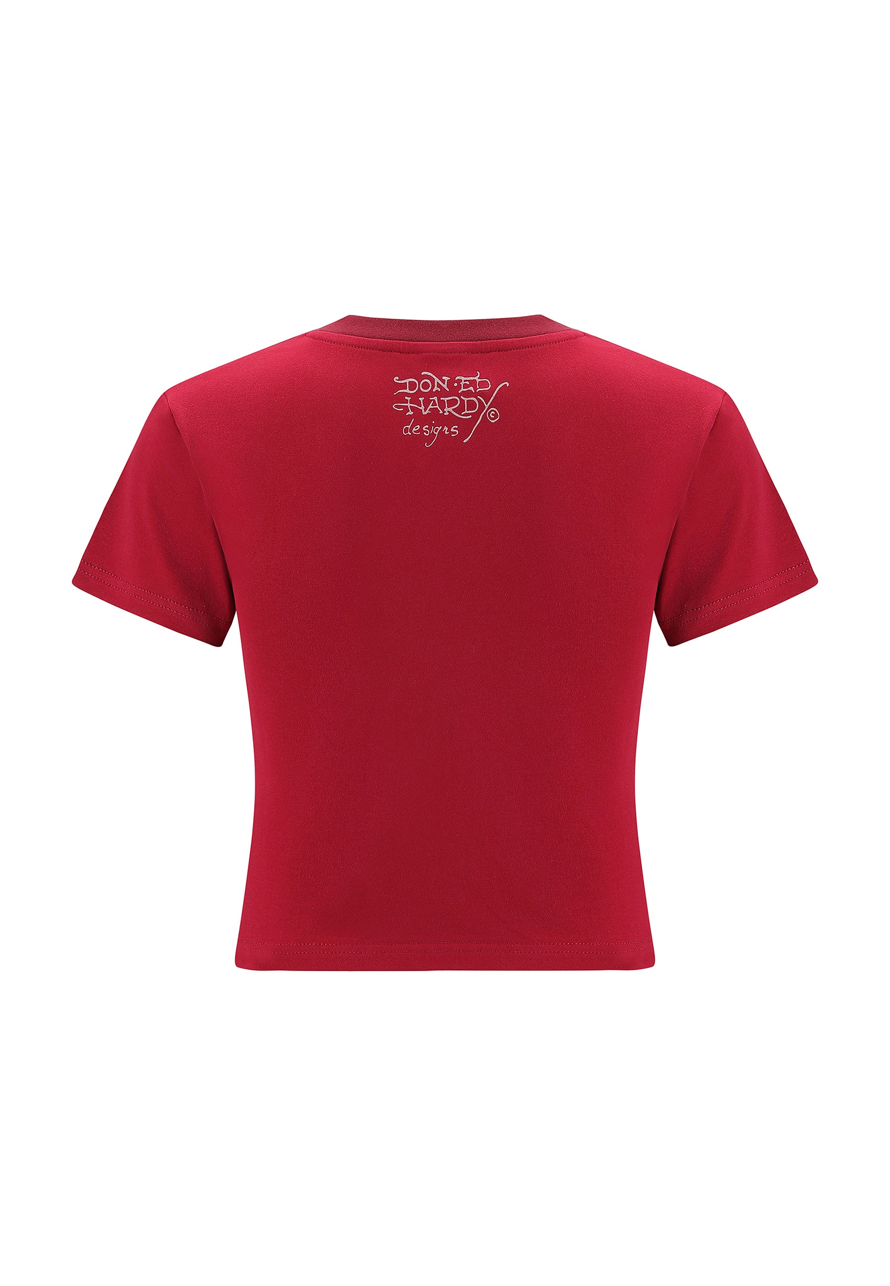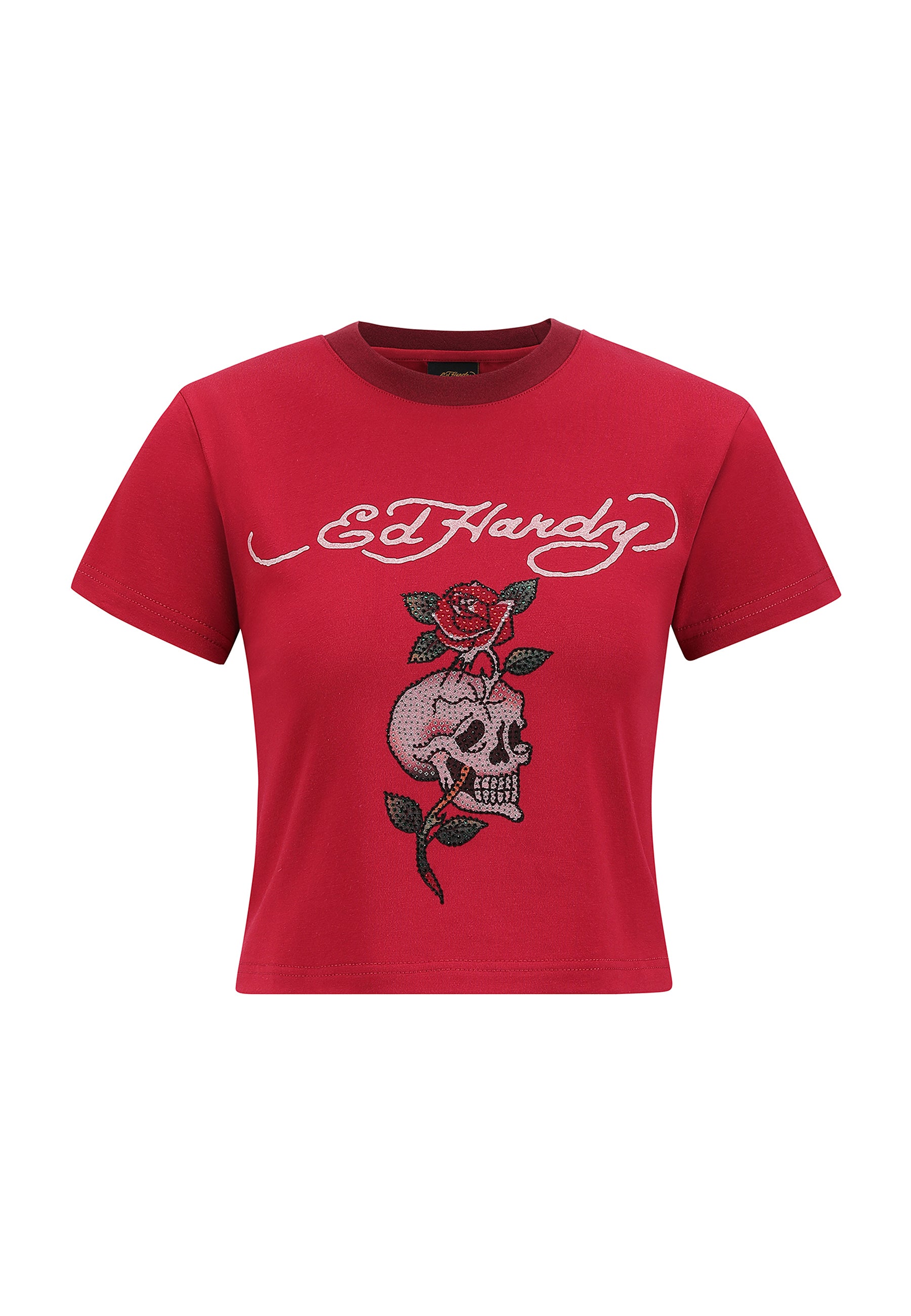Womens Skull Rose Diamante Baby T-Shirt Top - Red
