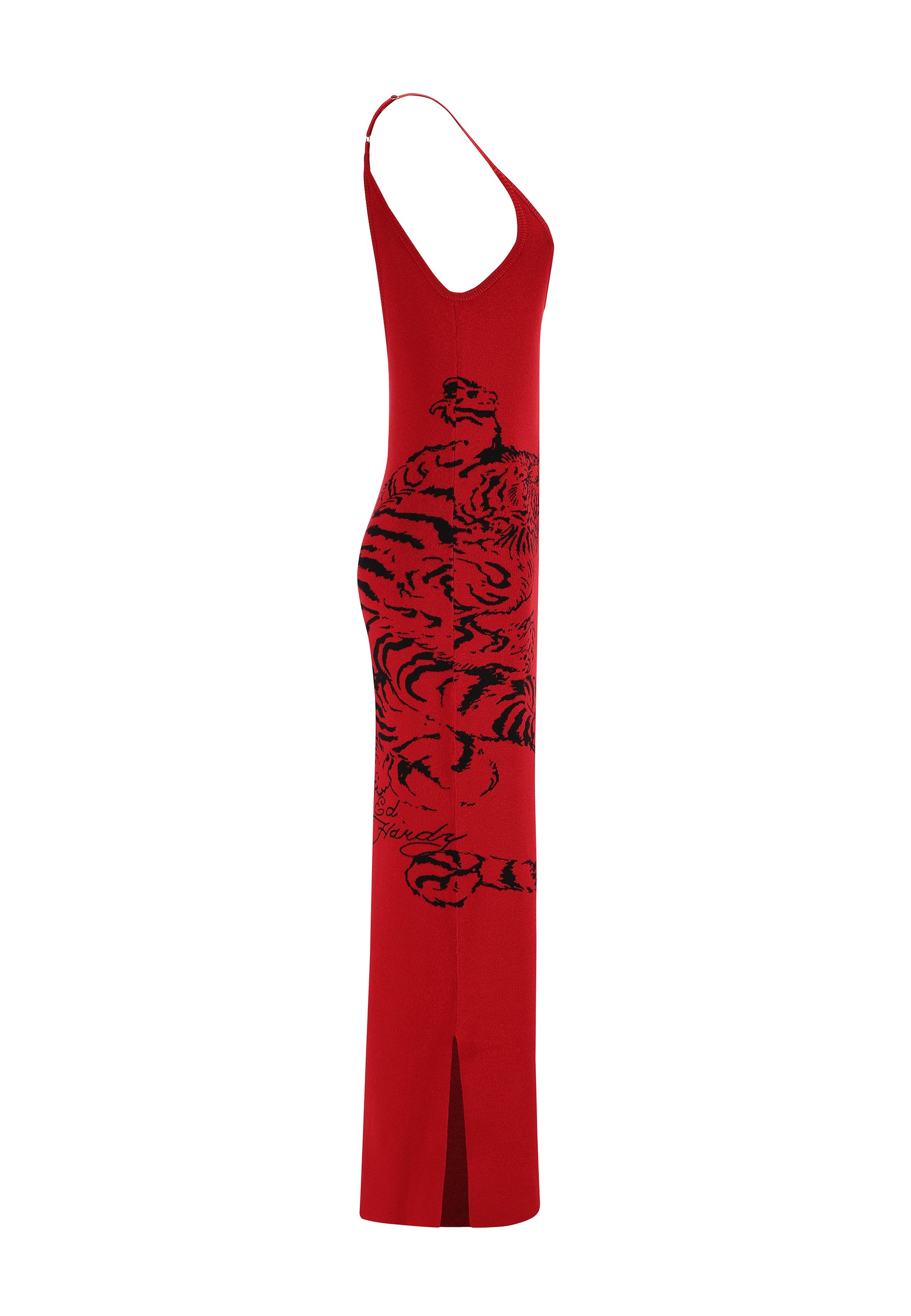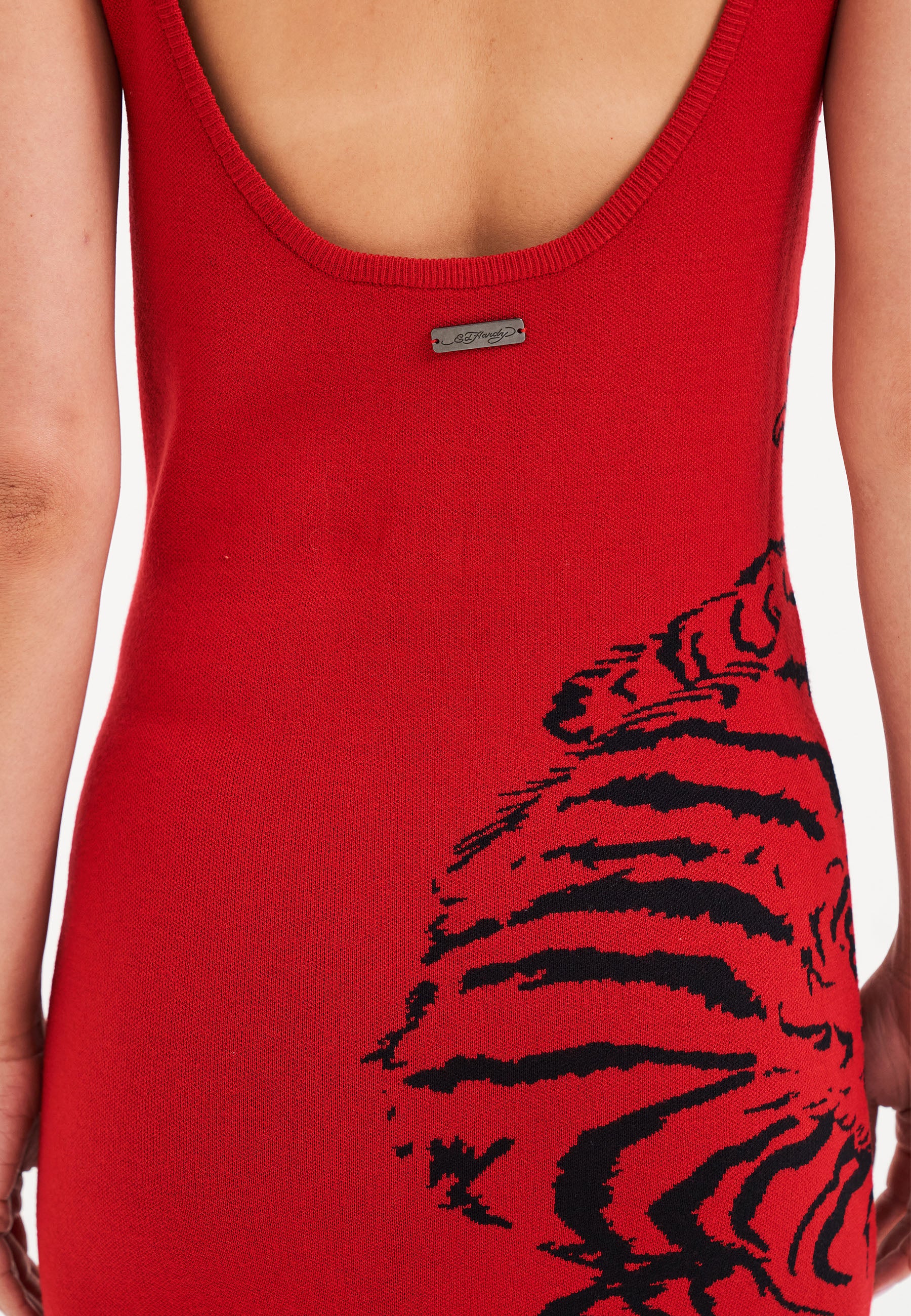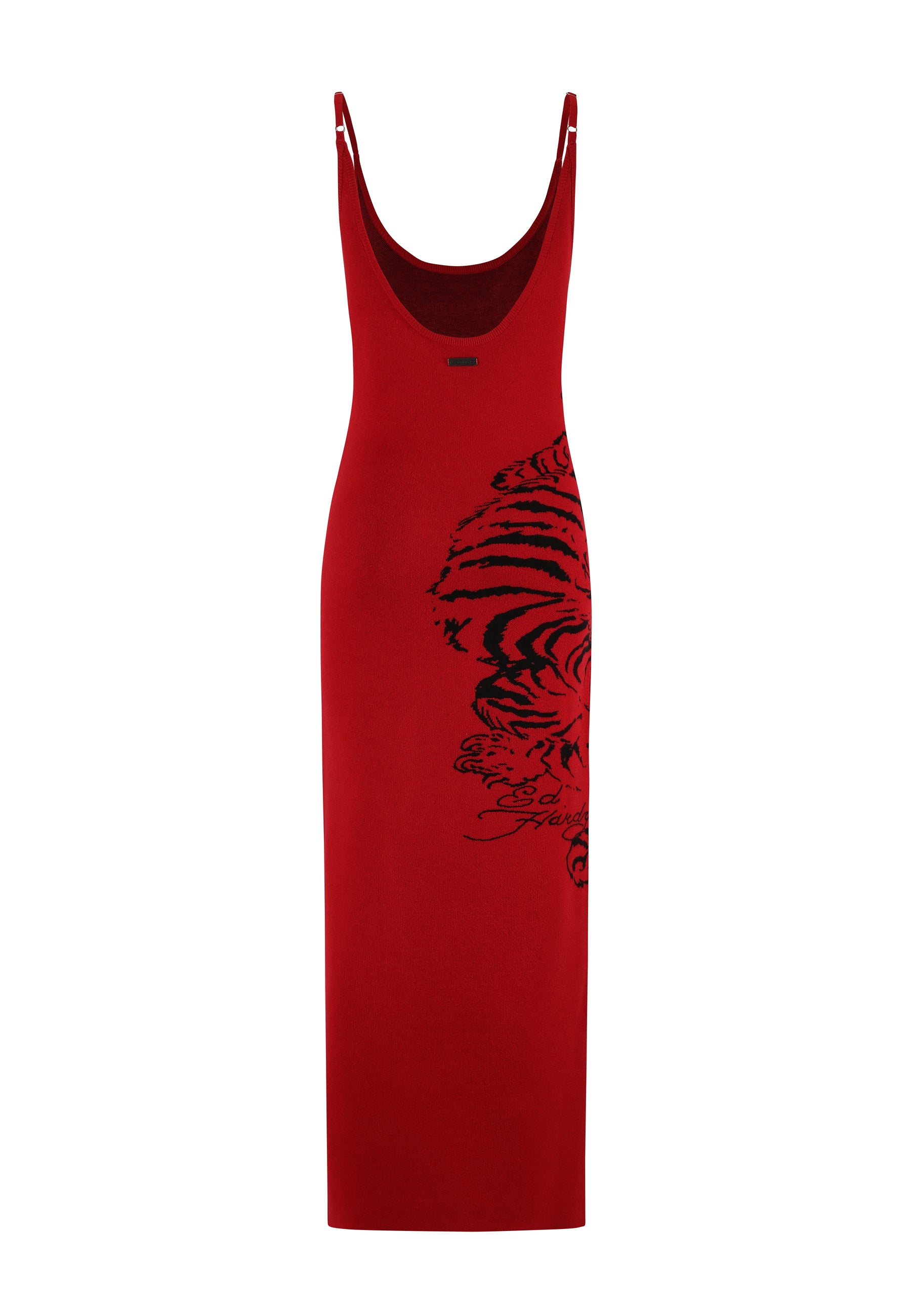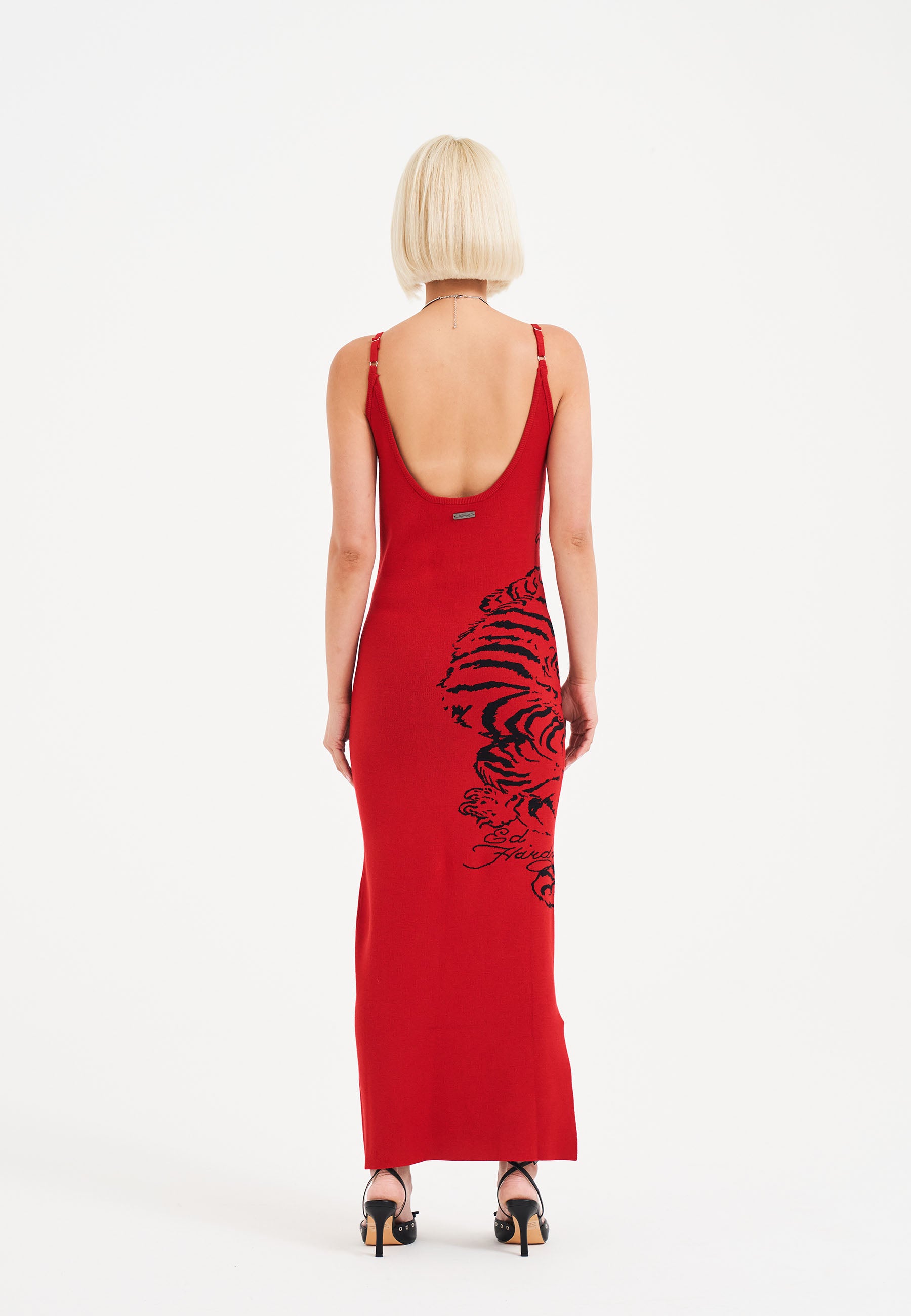 In a striking samba red, this tight-fit maxi dress features an all-over knitted tiger graphic that embodies Ed Hardy's bold tattoo design ethos. Crafted from an ultra-fine, compact knit, it offers adjustable spaghetti straps for a custom fit and a side split for added movement. The back neckline is finished with a metal Ed Hardy embossed tab, adding a signature touch to this standout piece.