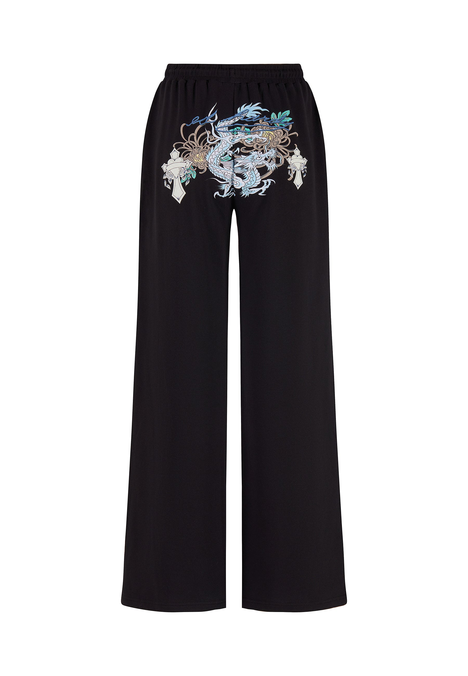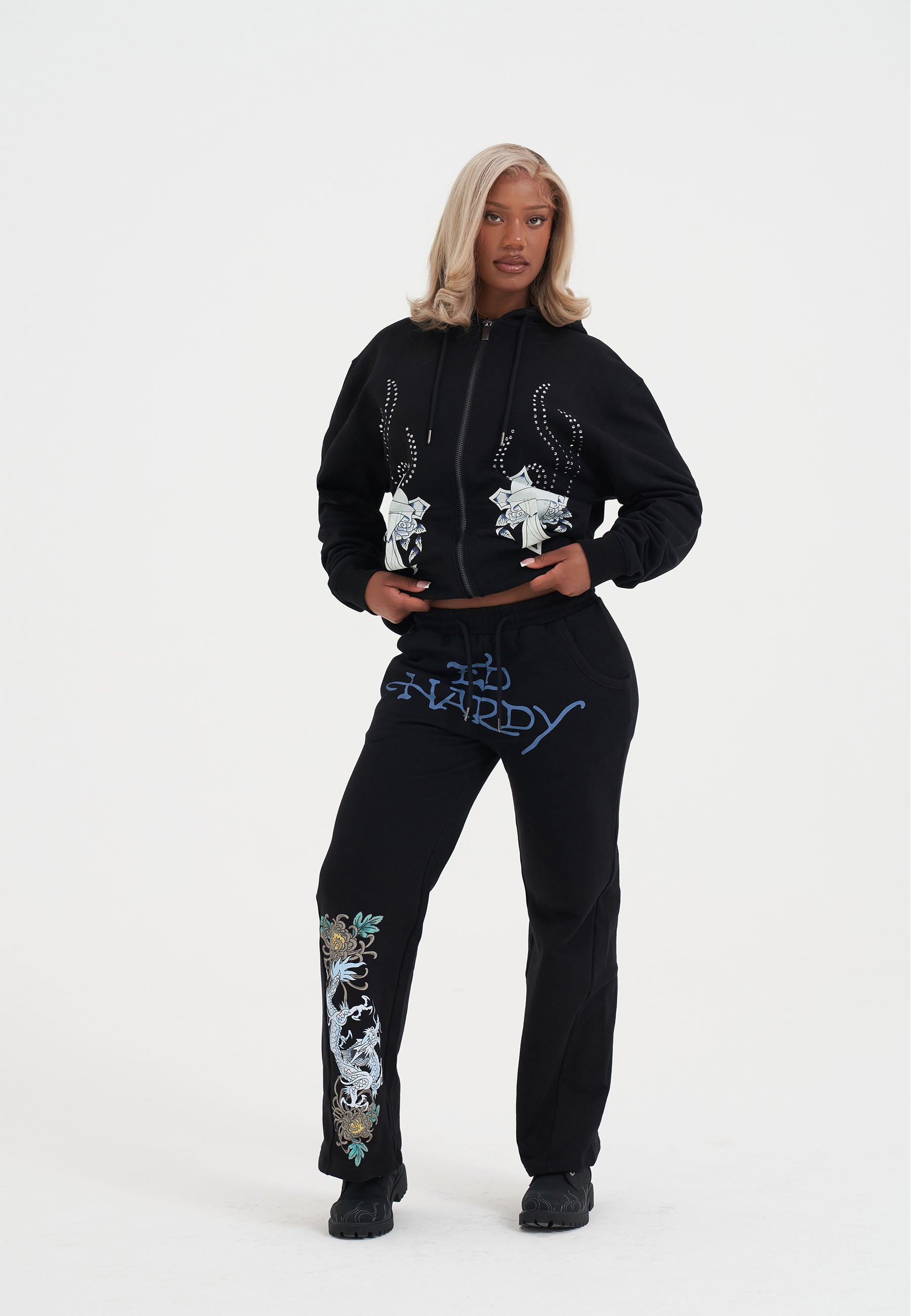 Womens Studded Floral Dragon Tracksuit Pants - Black