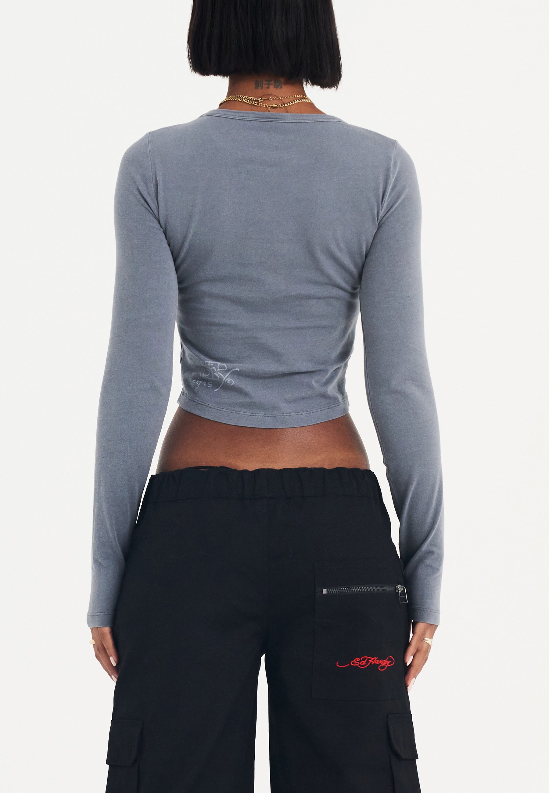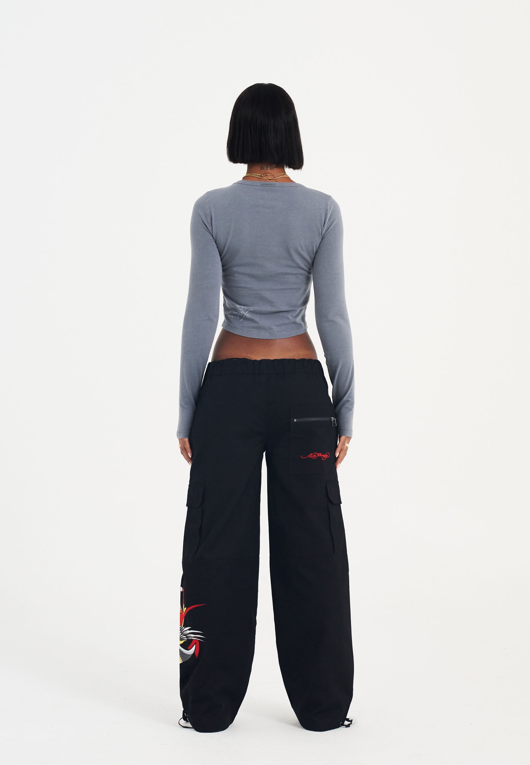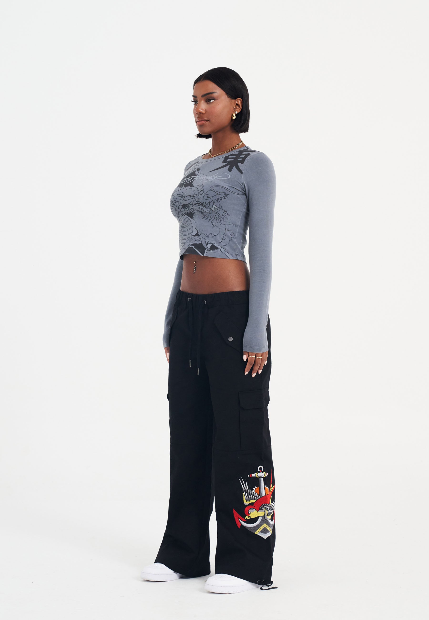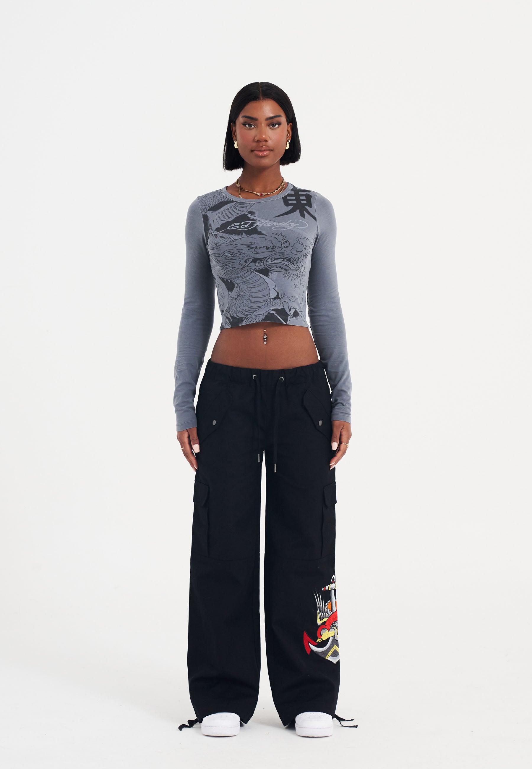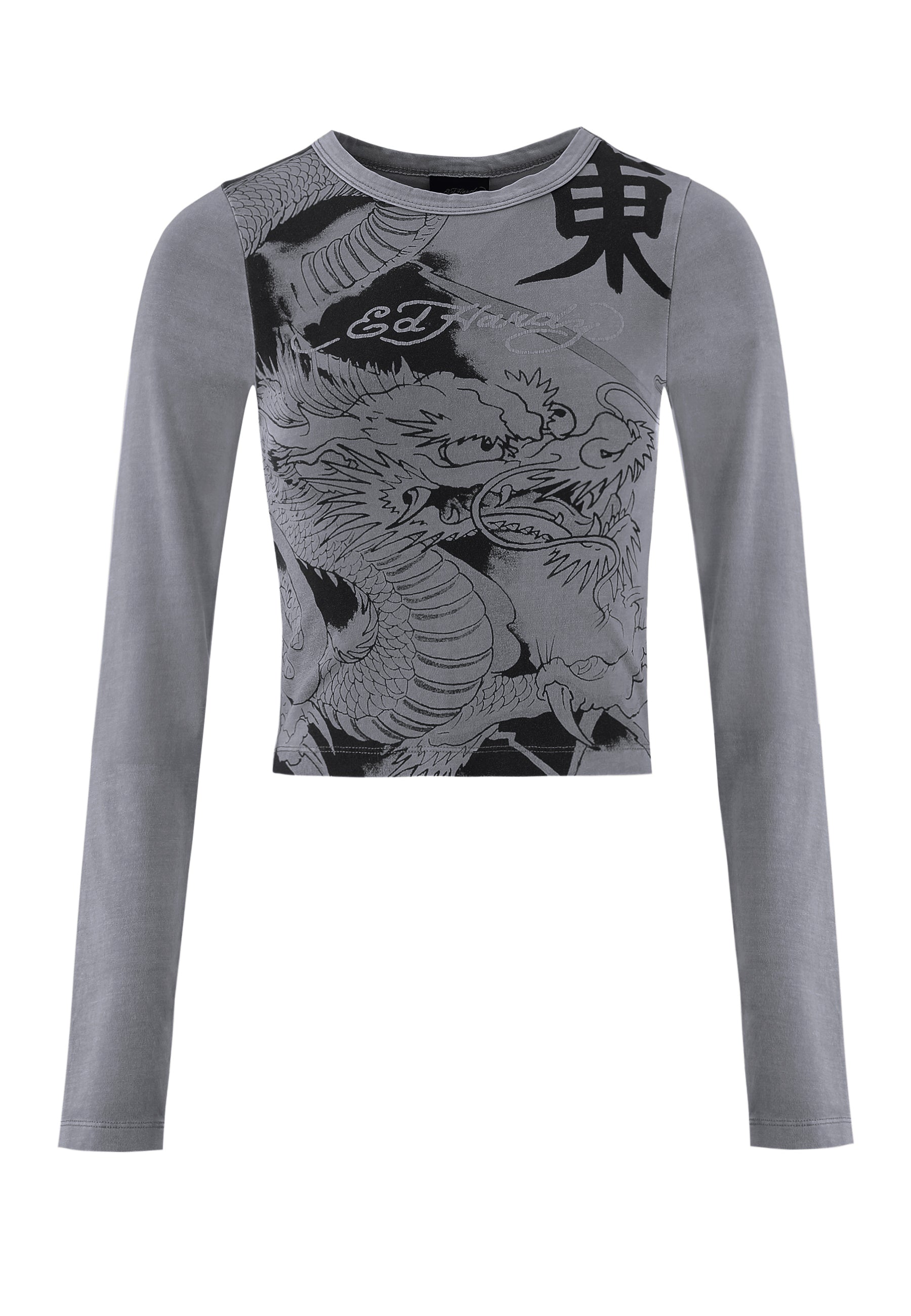 Showcasing a tonal dragon graphic inspired by Ed Hardy’s flashbook designs and a Don Ed Design print on the back hem, this piece carries forward Ed's iconic legacy. A versatile must-have for every season.