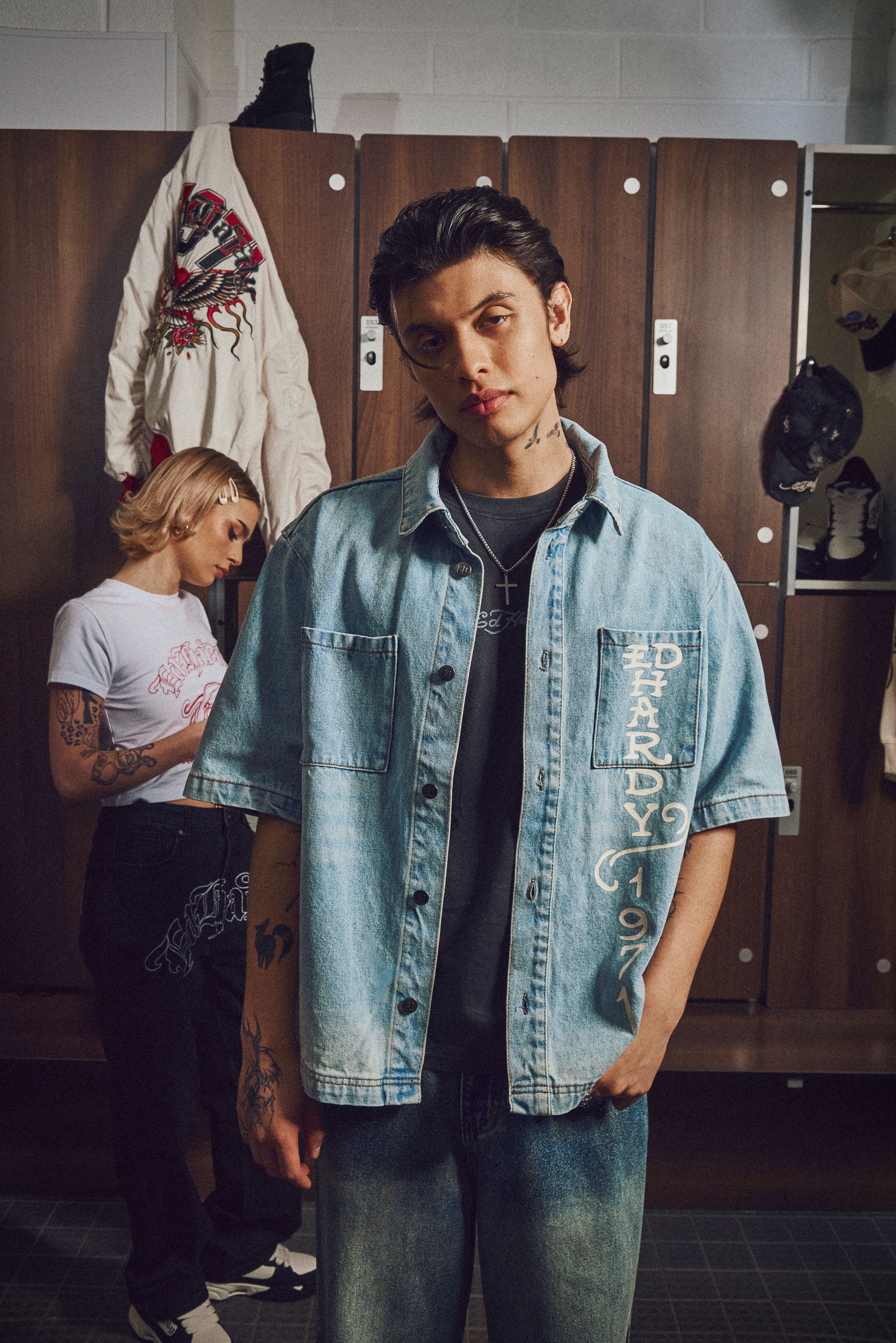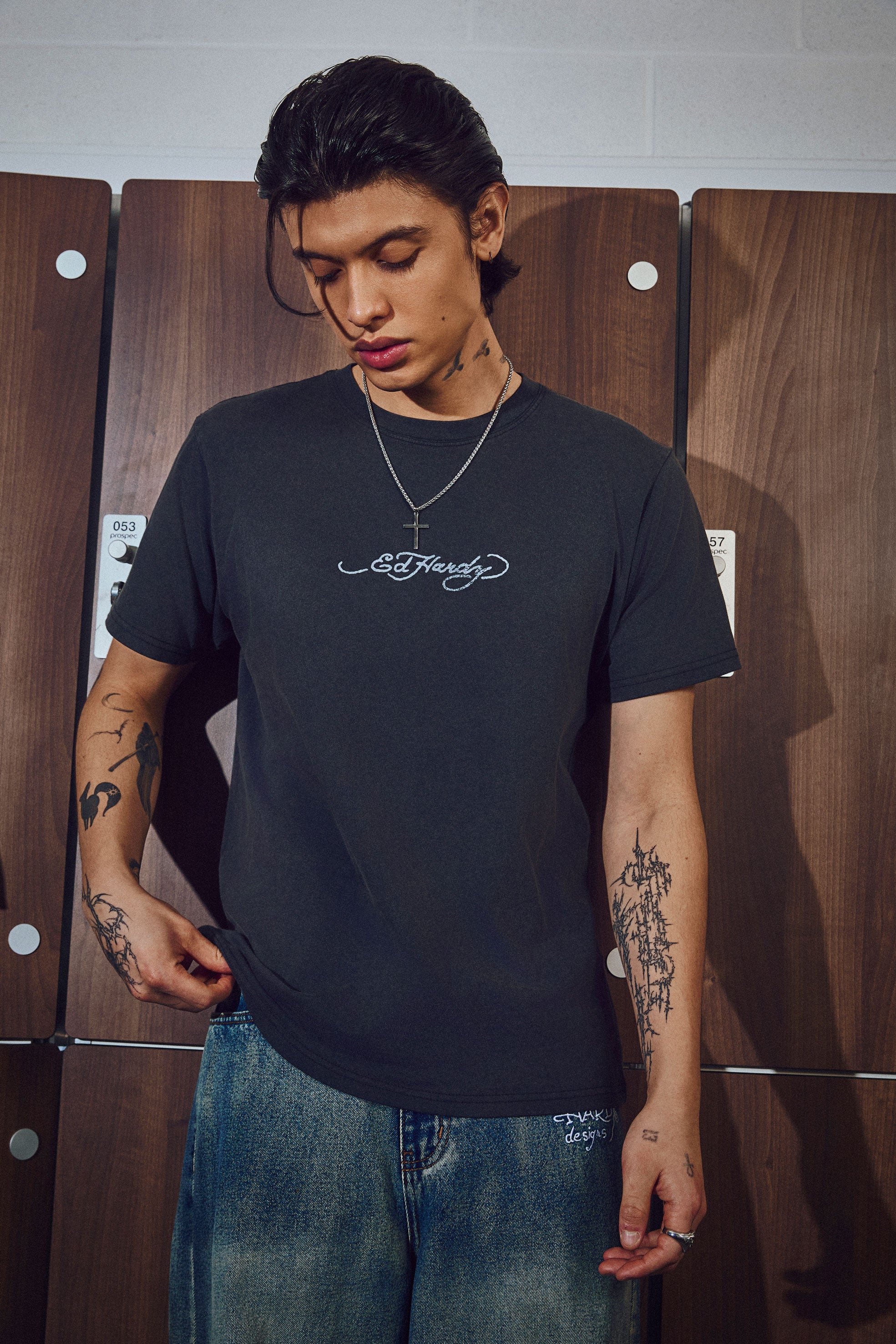 Mens Embroidered Gothic Ed Hardy Boxy Twill Shirt - Black