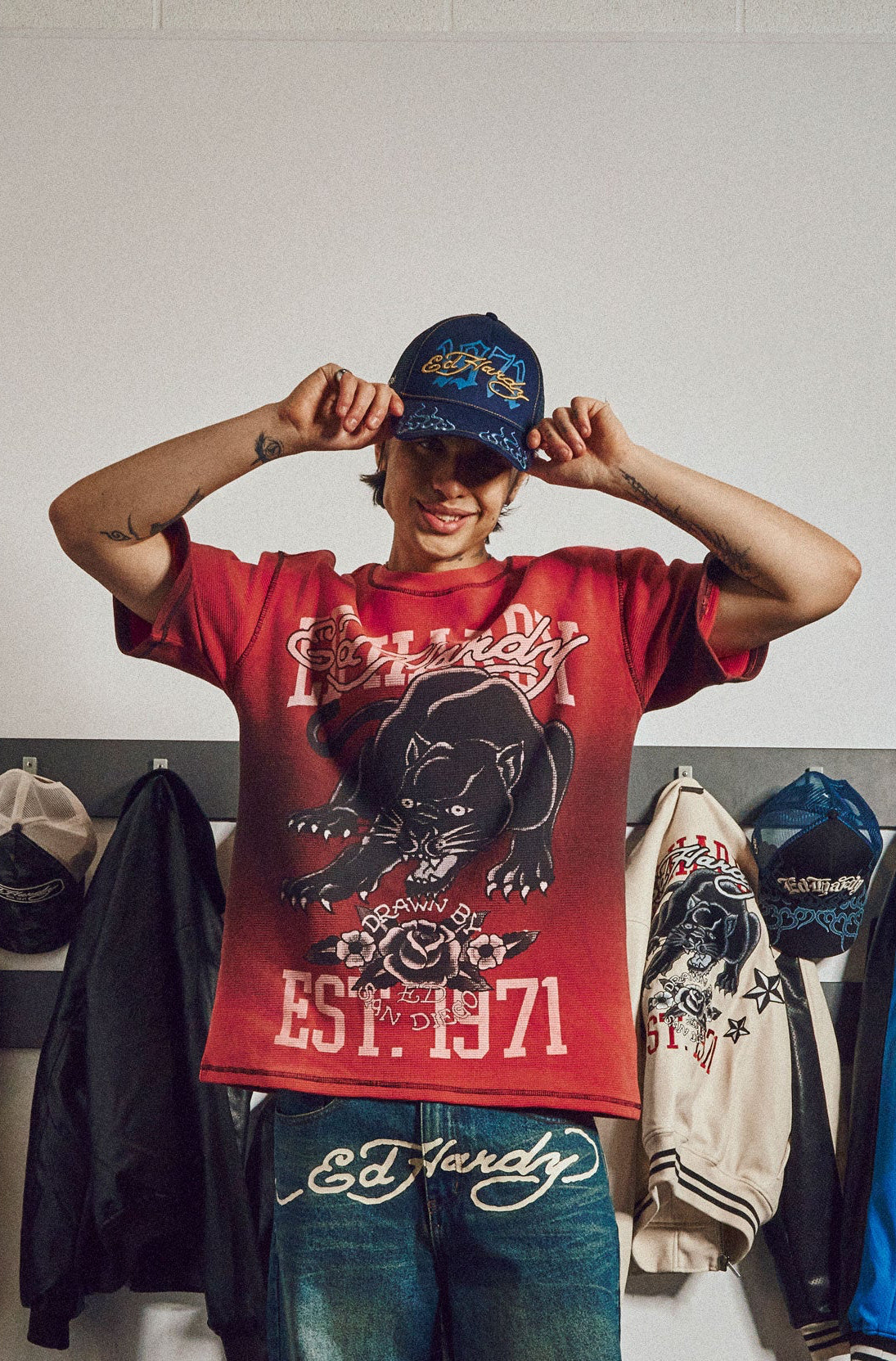 Mens Washed Waffle Panther Graphic Relaxed T-Shirt - Red